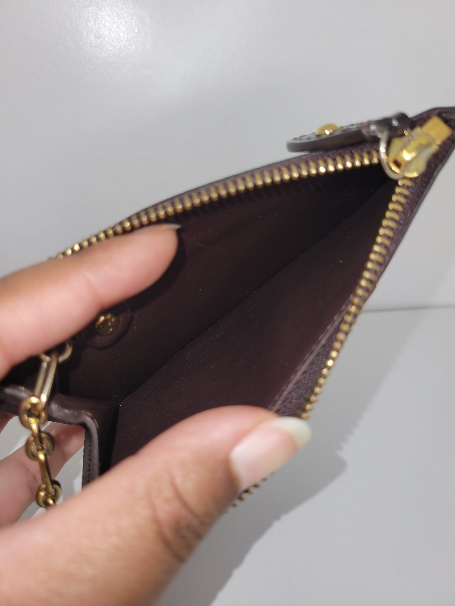 This Louis Vuitton Amarante Key Pouch is about to be your new favorite SLG! It is made to attach to the D-rings of bags or belts loops plus it keeps your keys, cards and change organized in the zipper pocket or back slot.