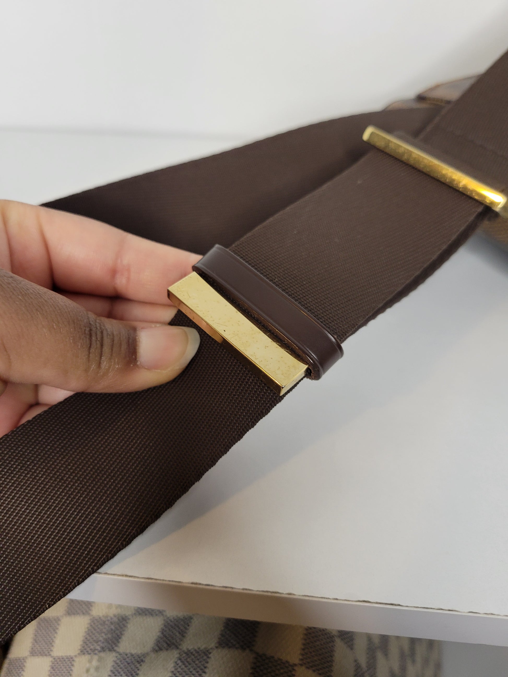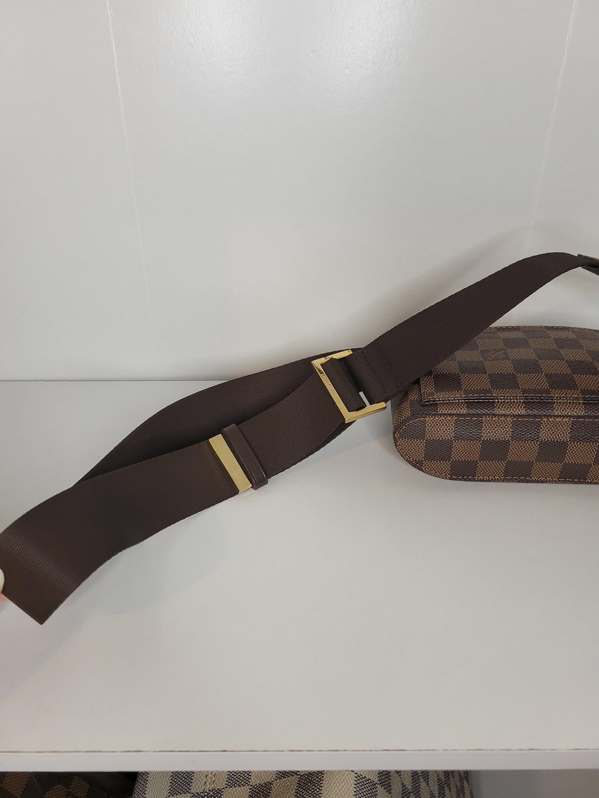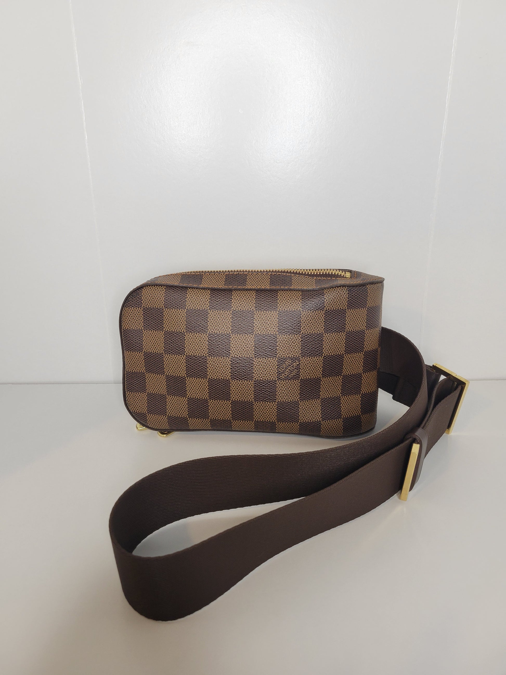 The discontinued Louis Vuitton Damier Canvas Geronimos Bag is perfect for travel or running errands. This versatile bag features adjustable canvas straps that fit snugly on the chest or back for ultimate hands-free convenience. It features a velcro fastened back pocket and a small button pocket.