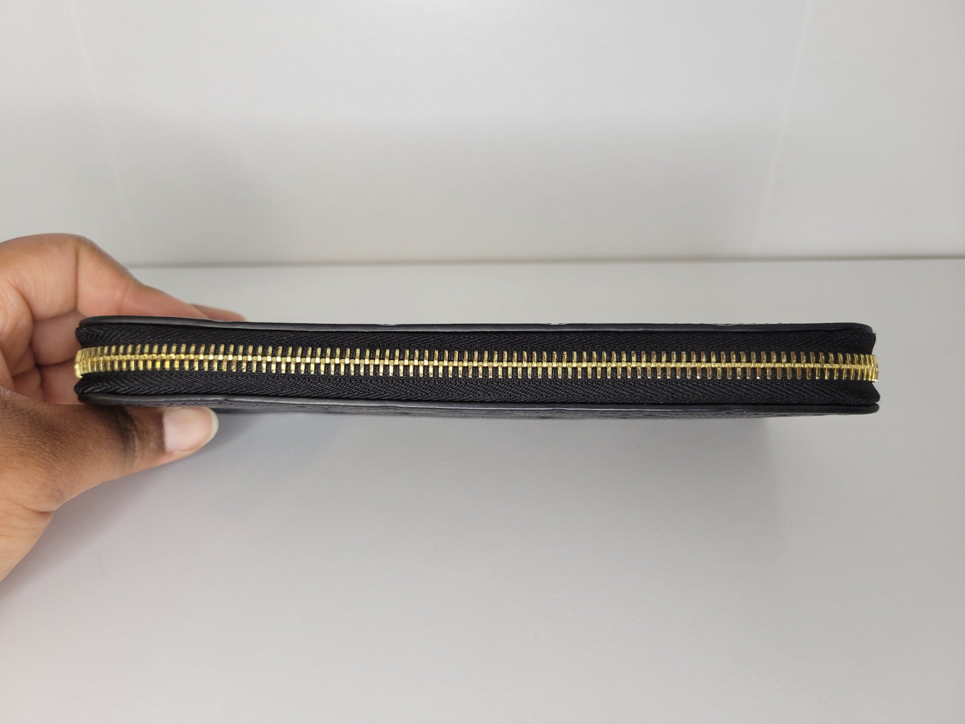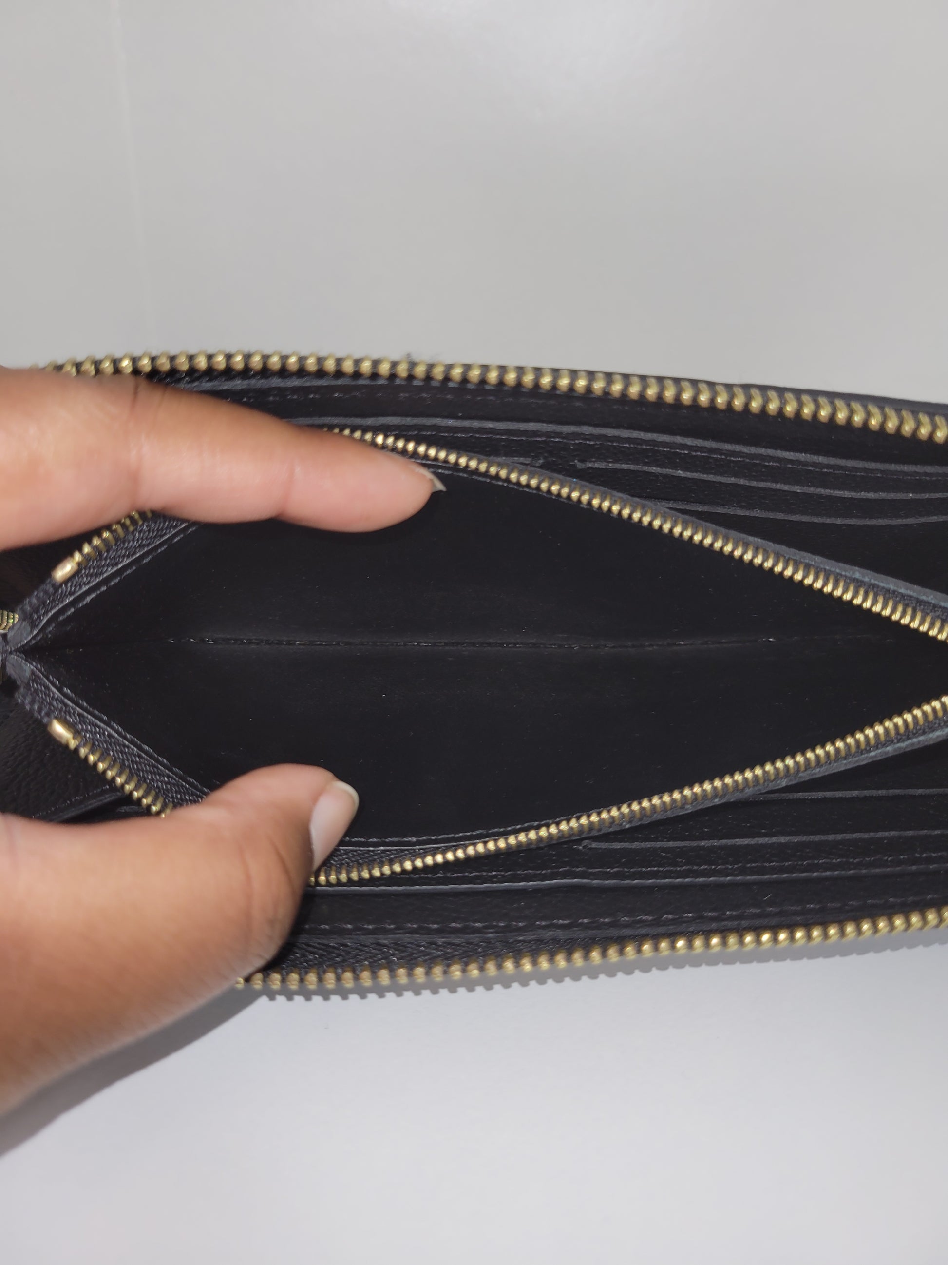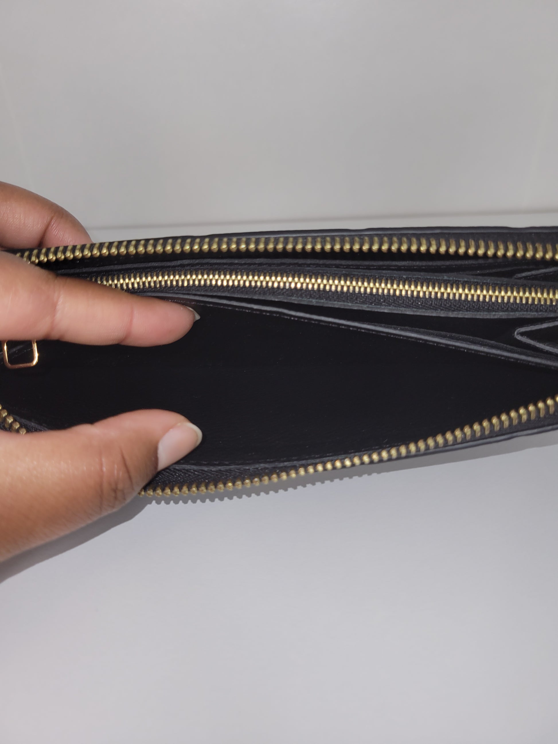The stunning Clemence wallet in black will stand out in your SLG collection! It features 8 credit-card slots, Zipped coin pocket, 2 large gusseted compartments, and 2 flat pockets.