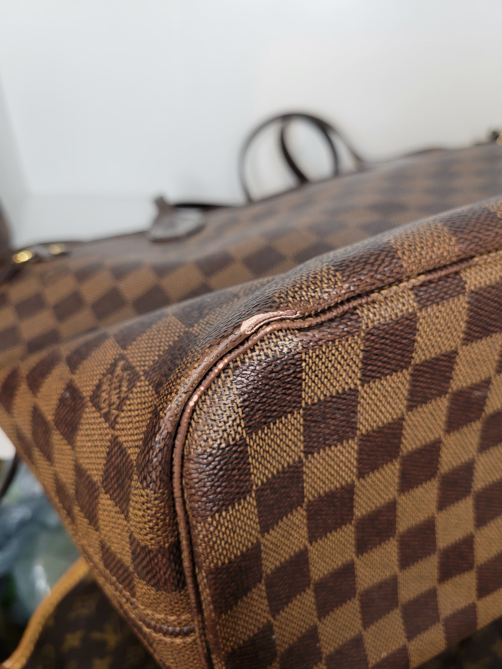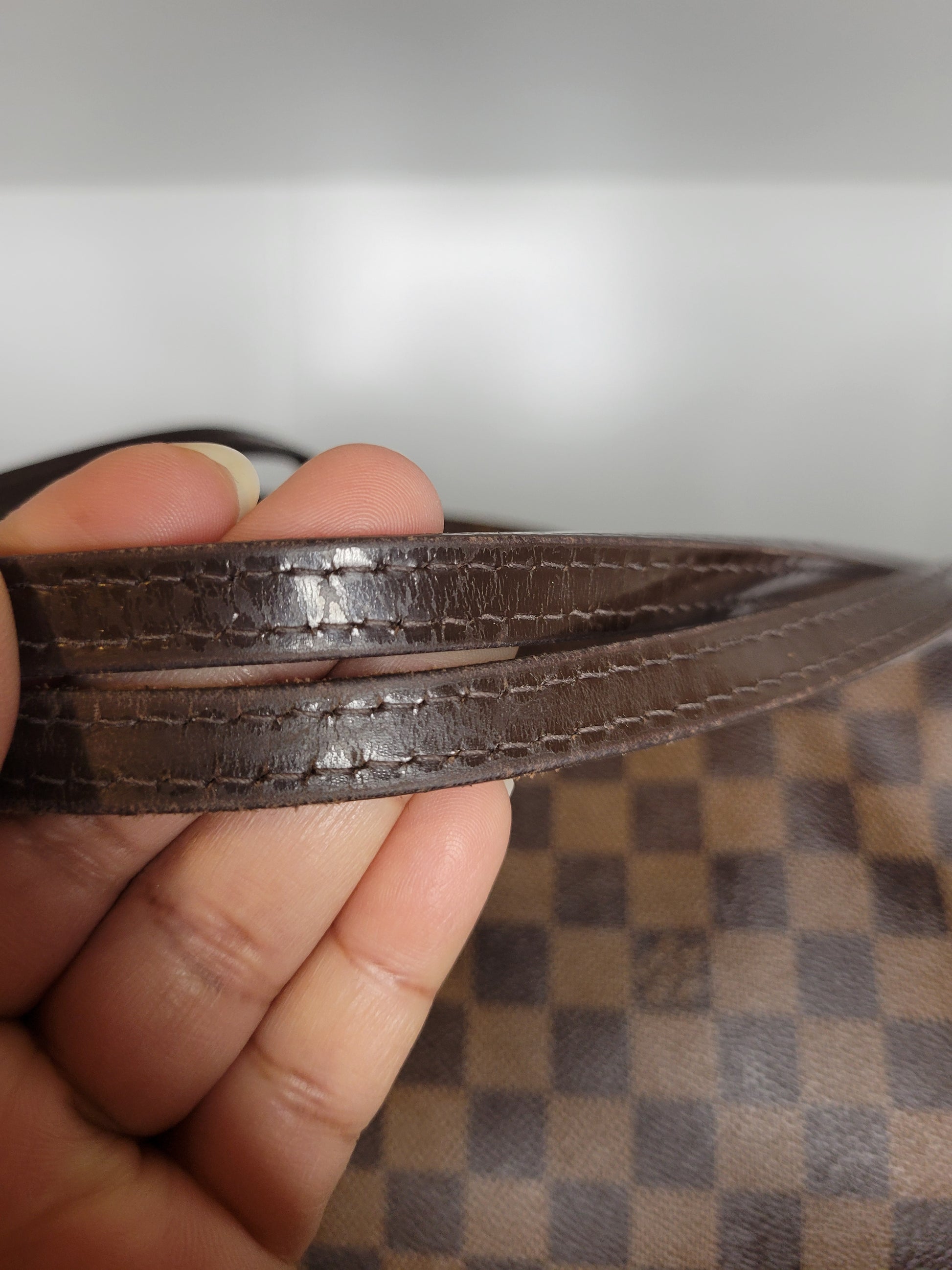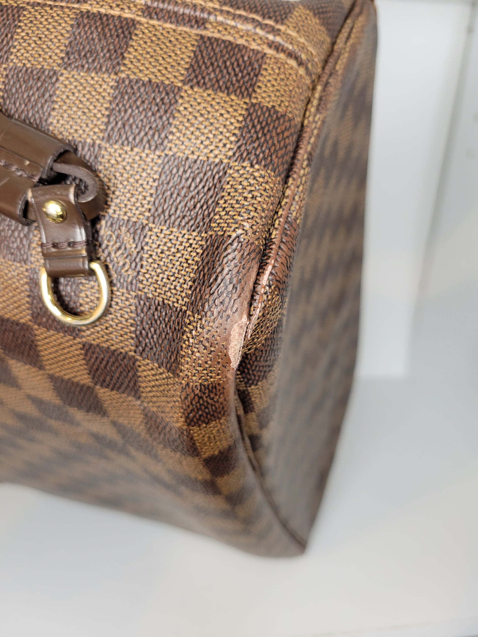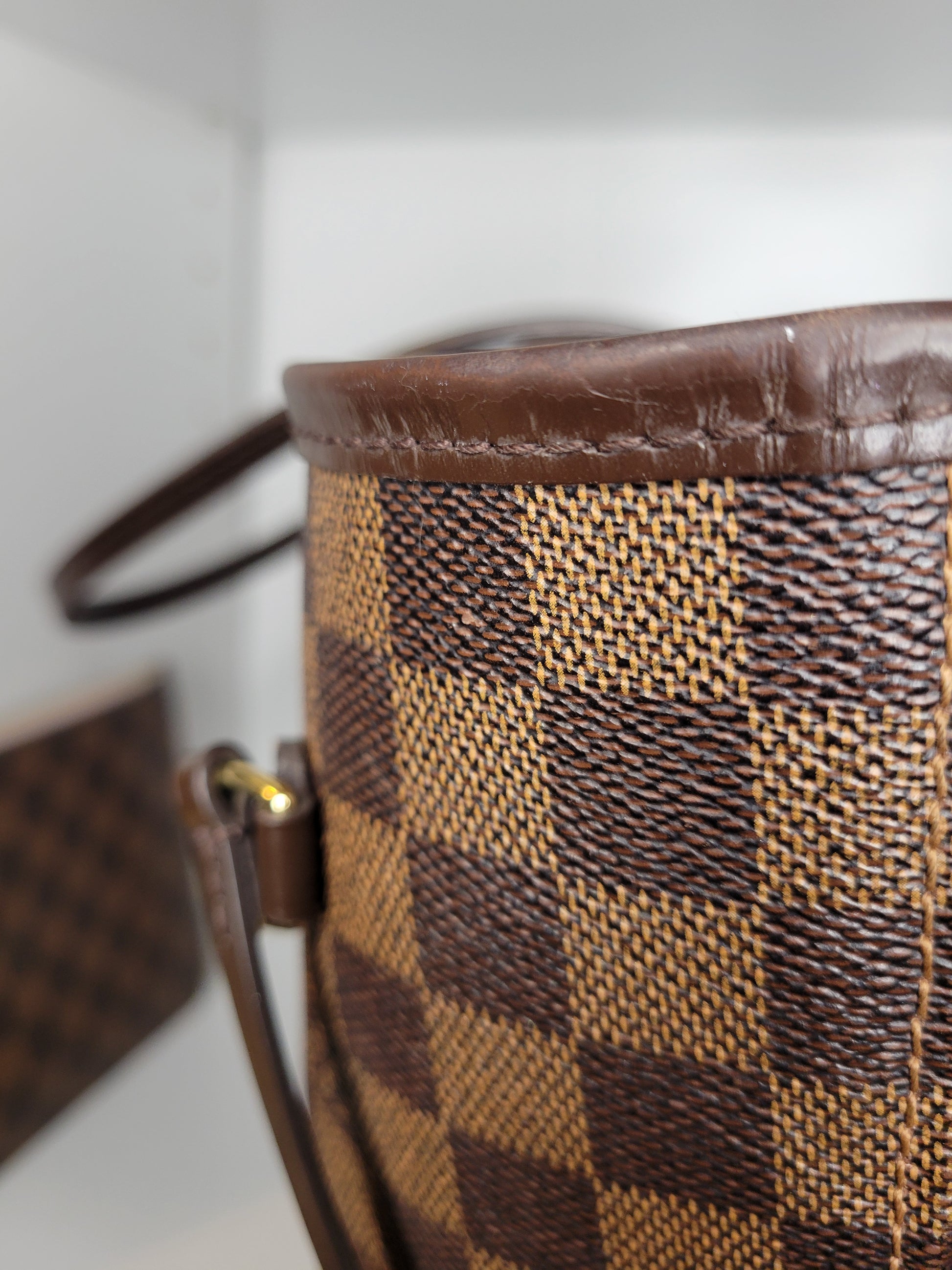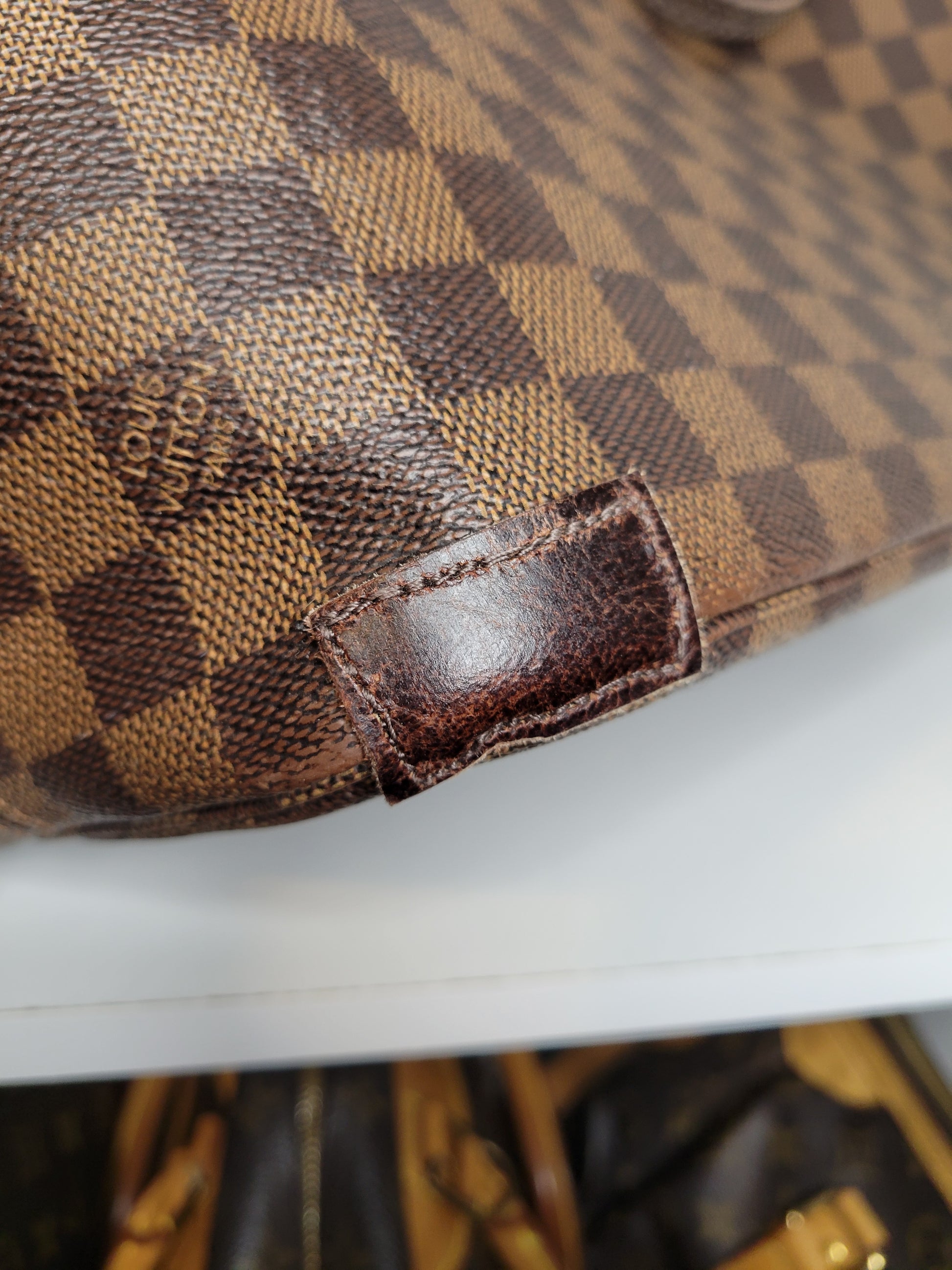 *Minor scuffs, scratches, and wear to Damier Ebene pattern on outside of bag along with two small cracks at top of bag which is losing shape