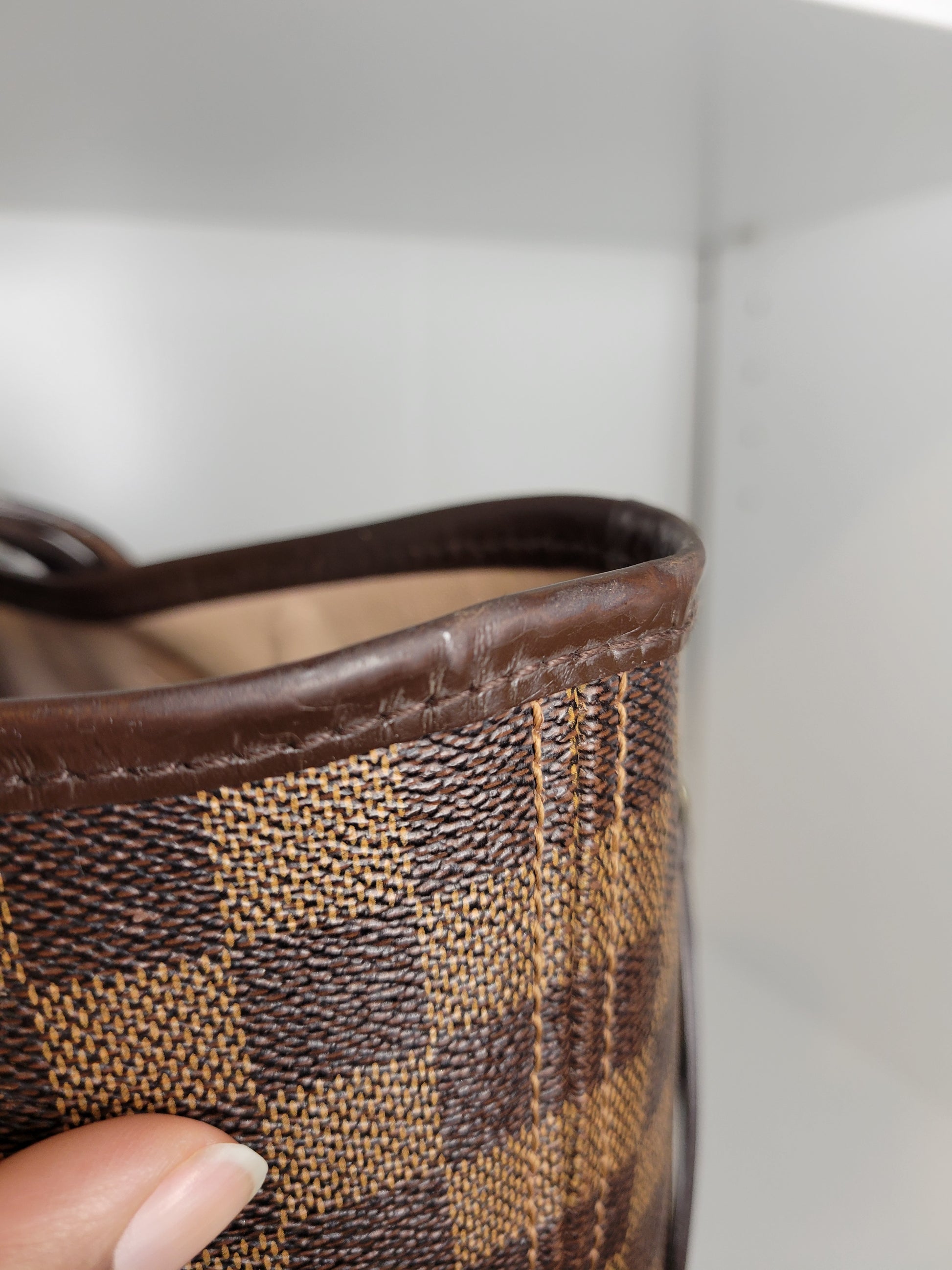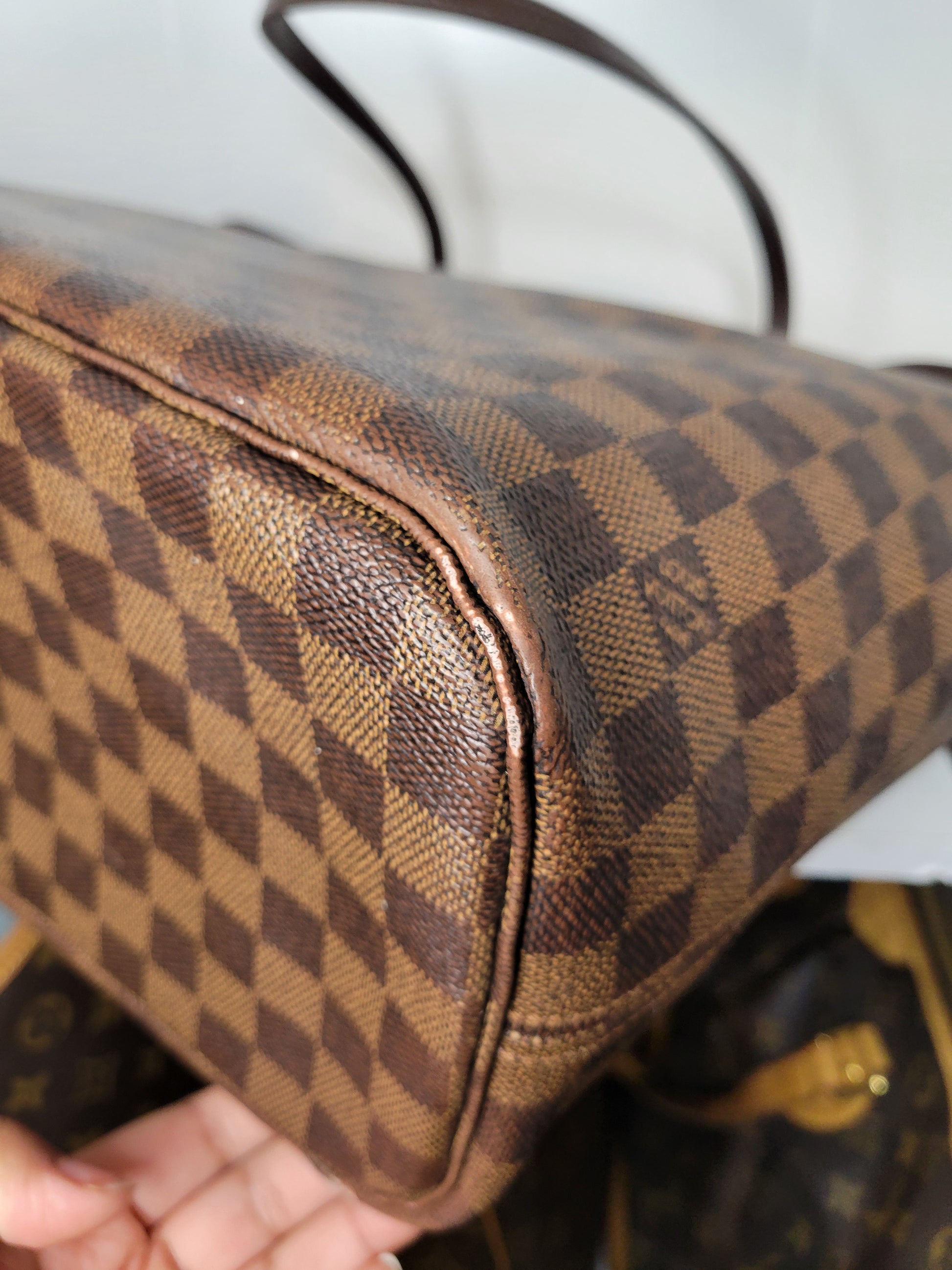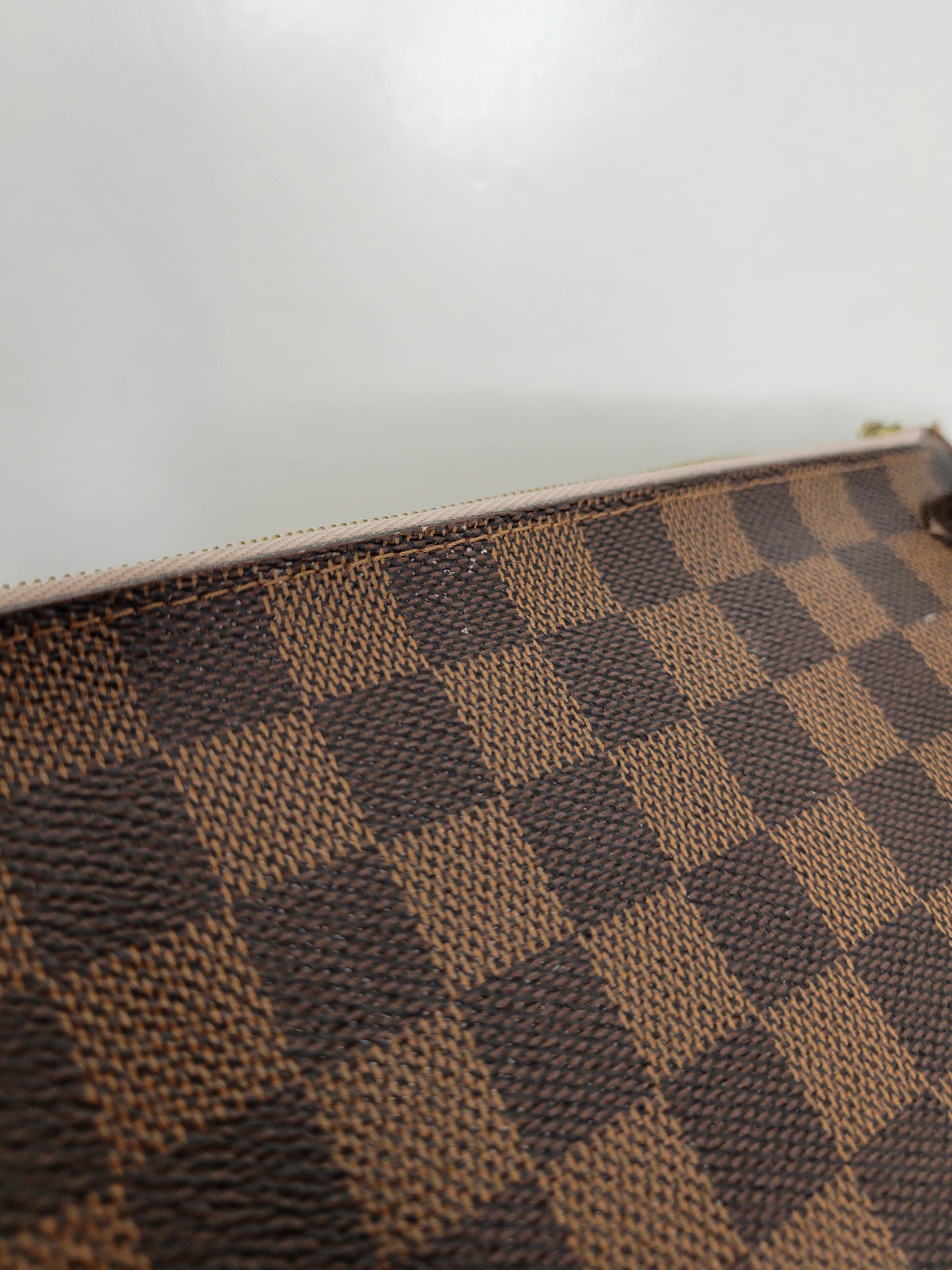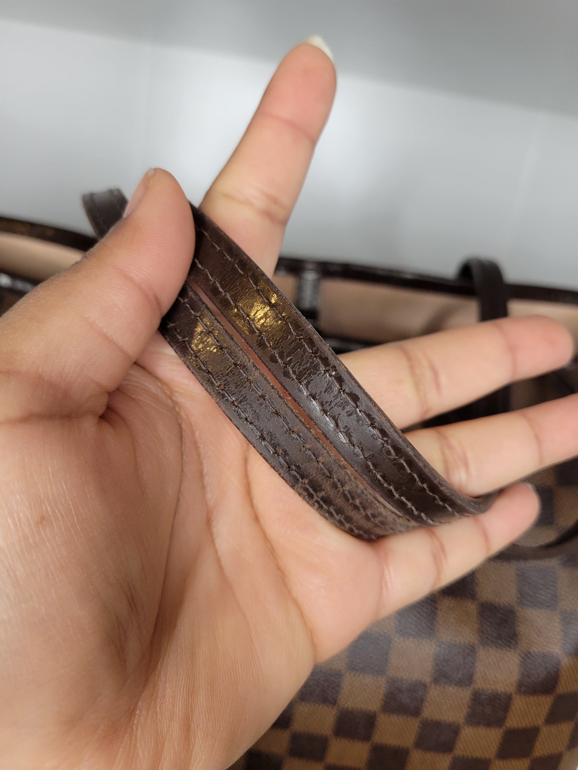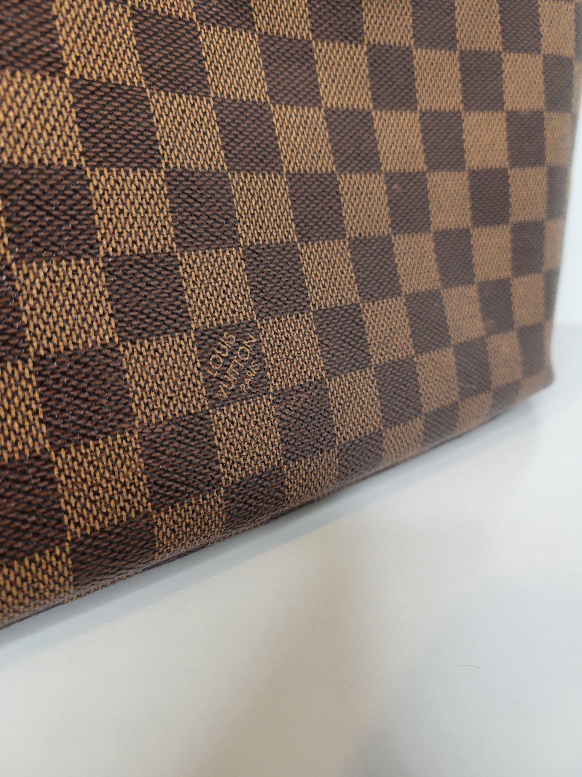 *Minor scuffs, scratches, and wear to Damier Ebene pattern on outside of bag along with two small cracks at top of bag which is losing shape