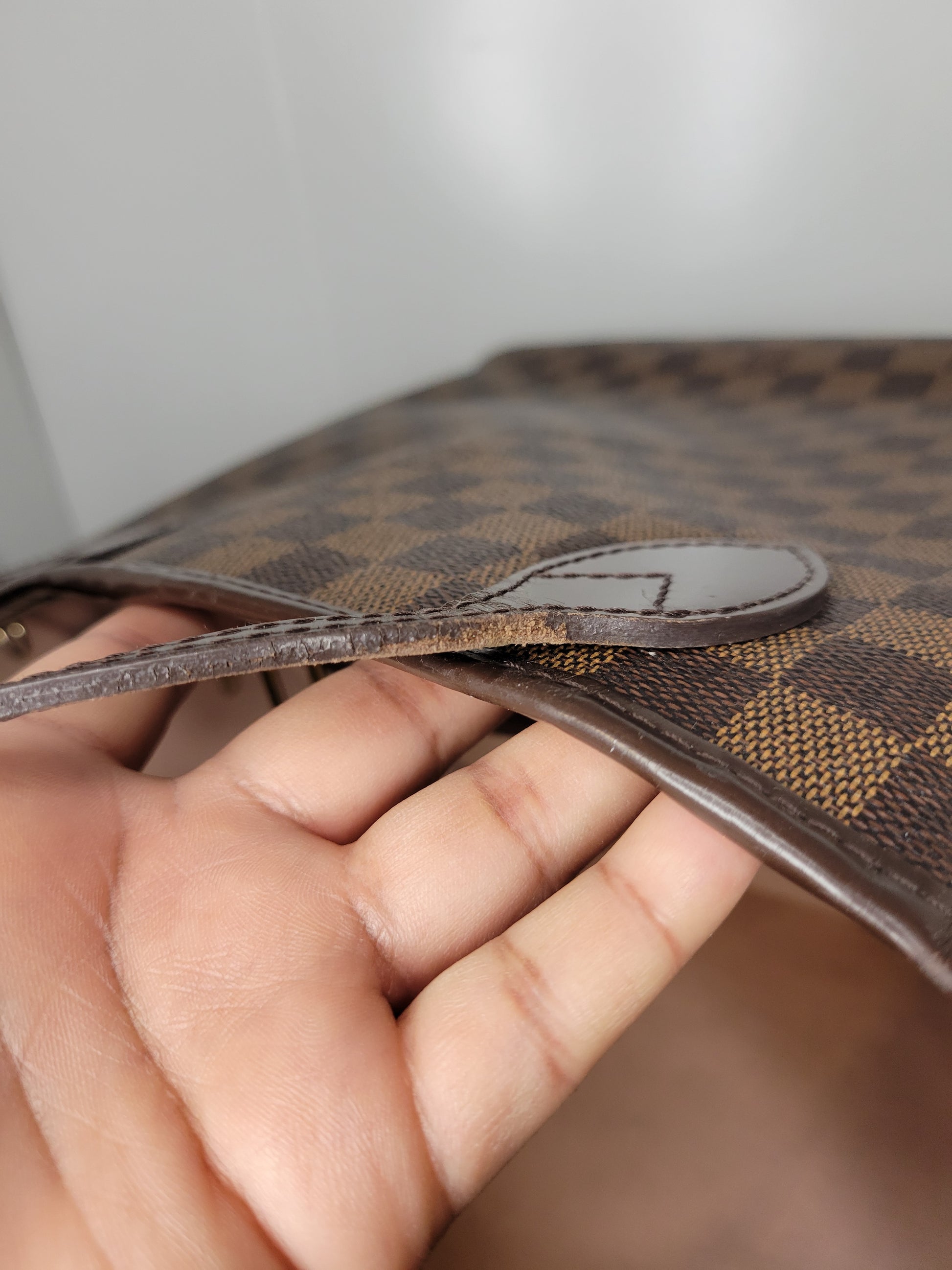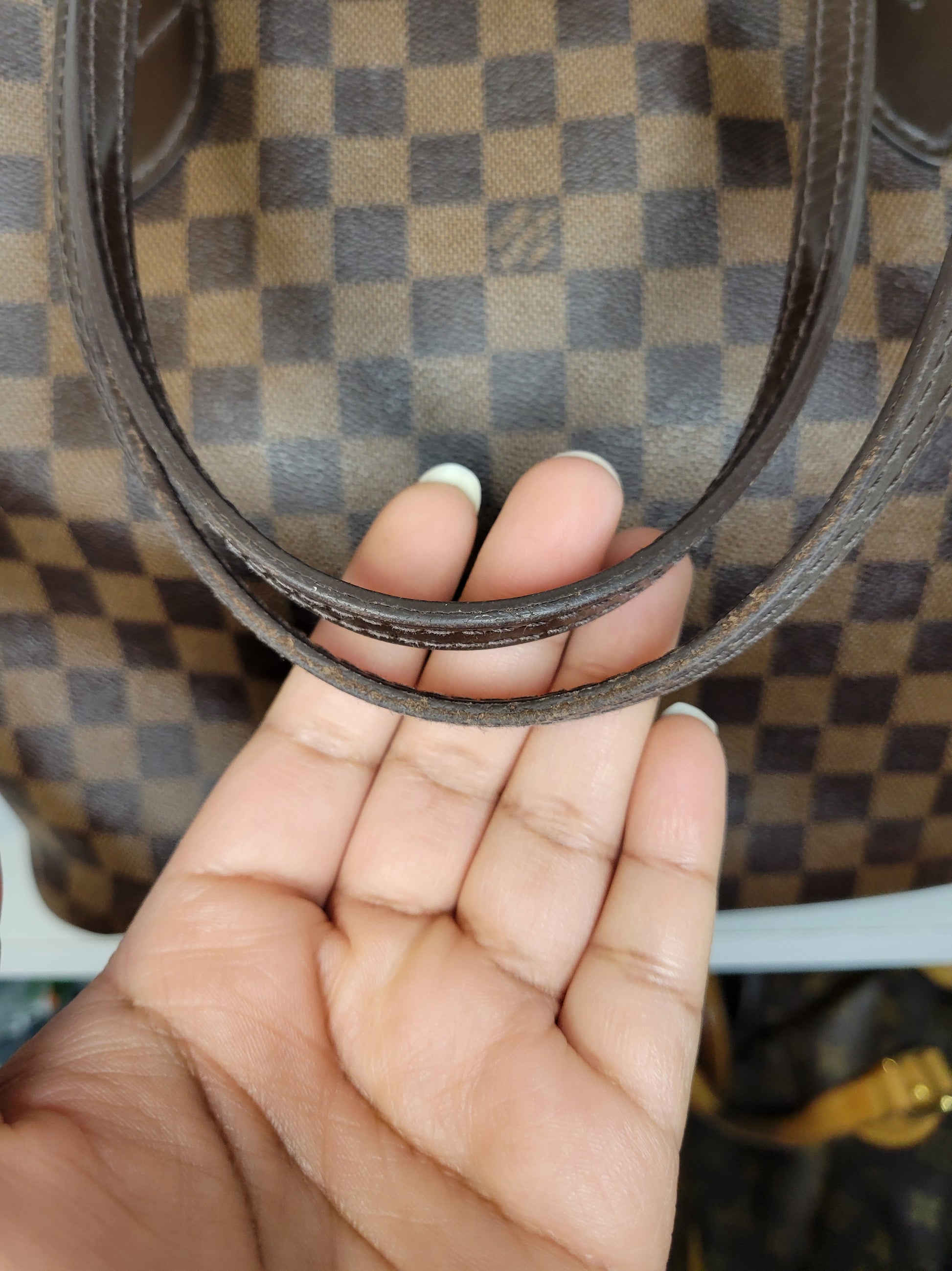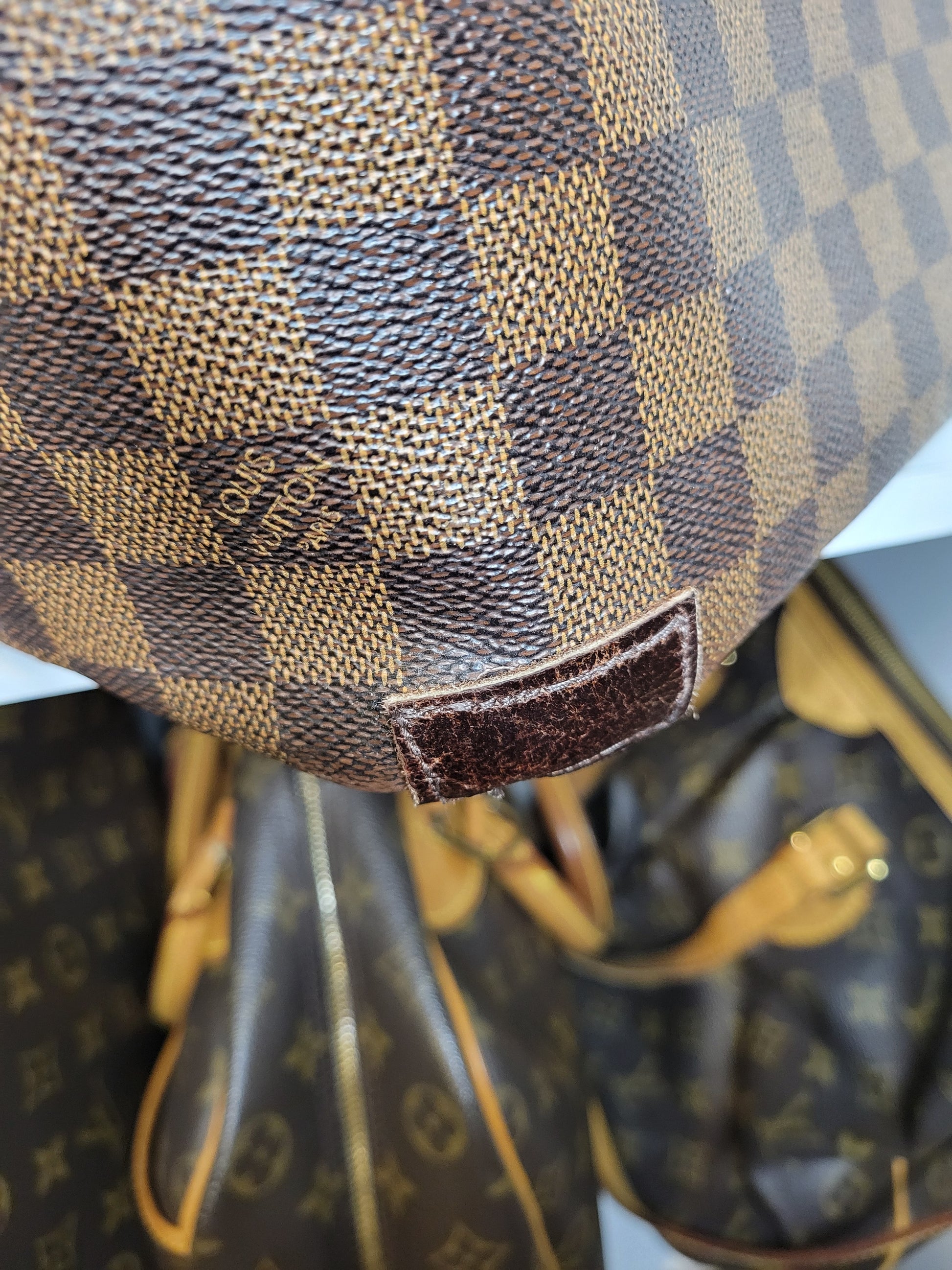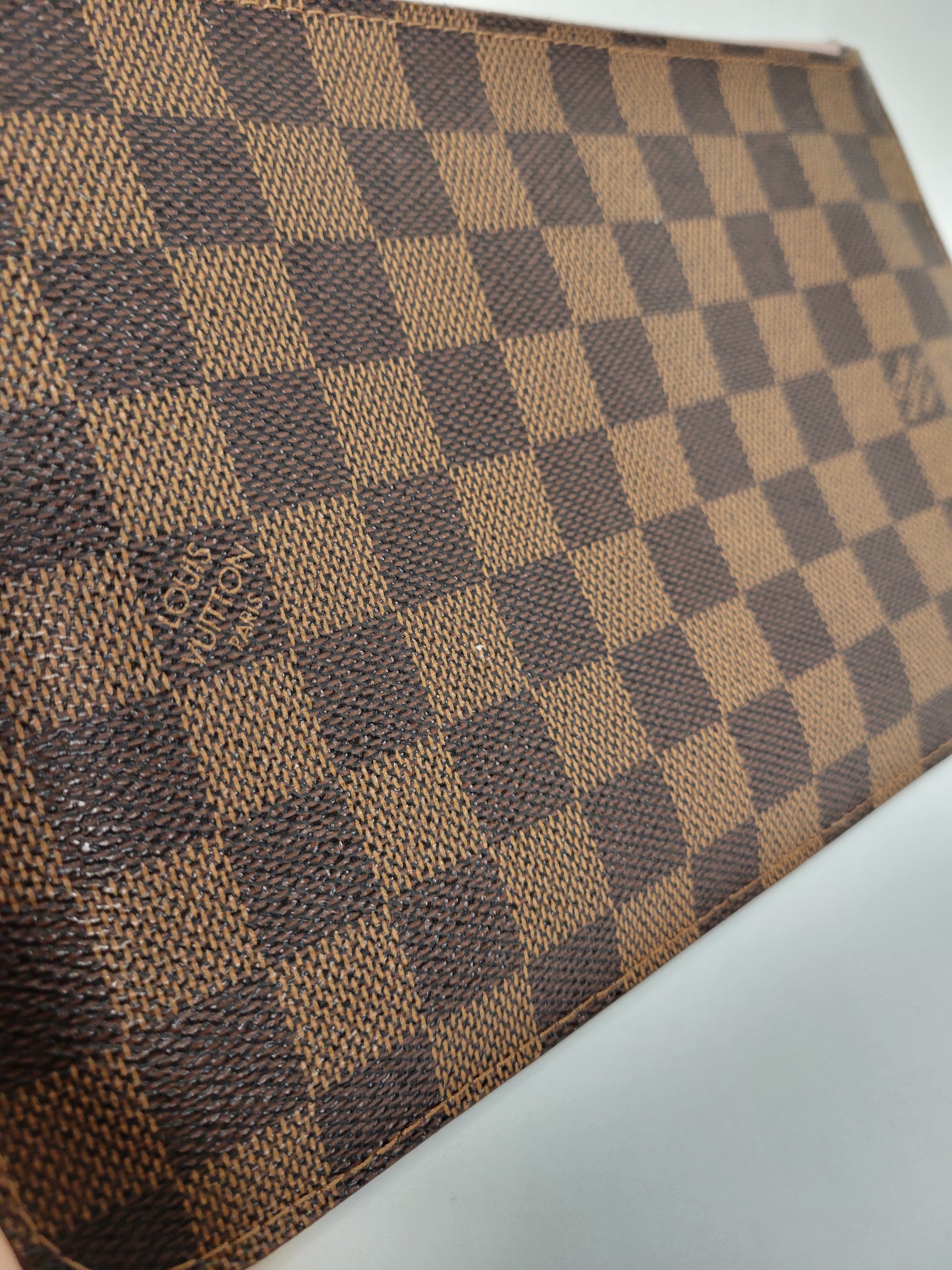 *Minor scuffs, scratches, and wear to Damier Ebene pattern on outside of bag along with two small cracks at top of bag which is losing shape