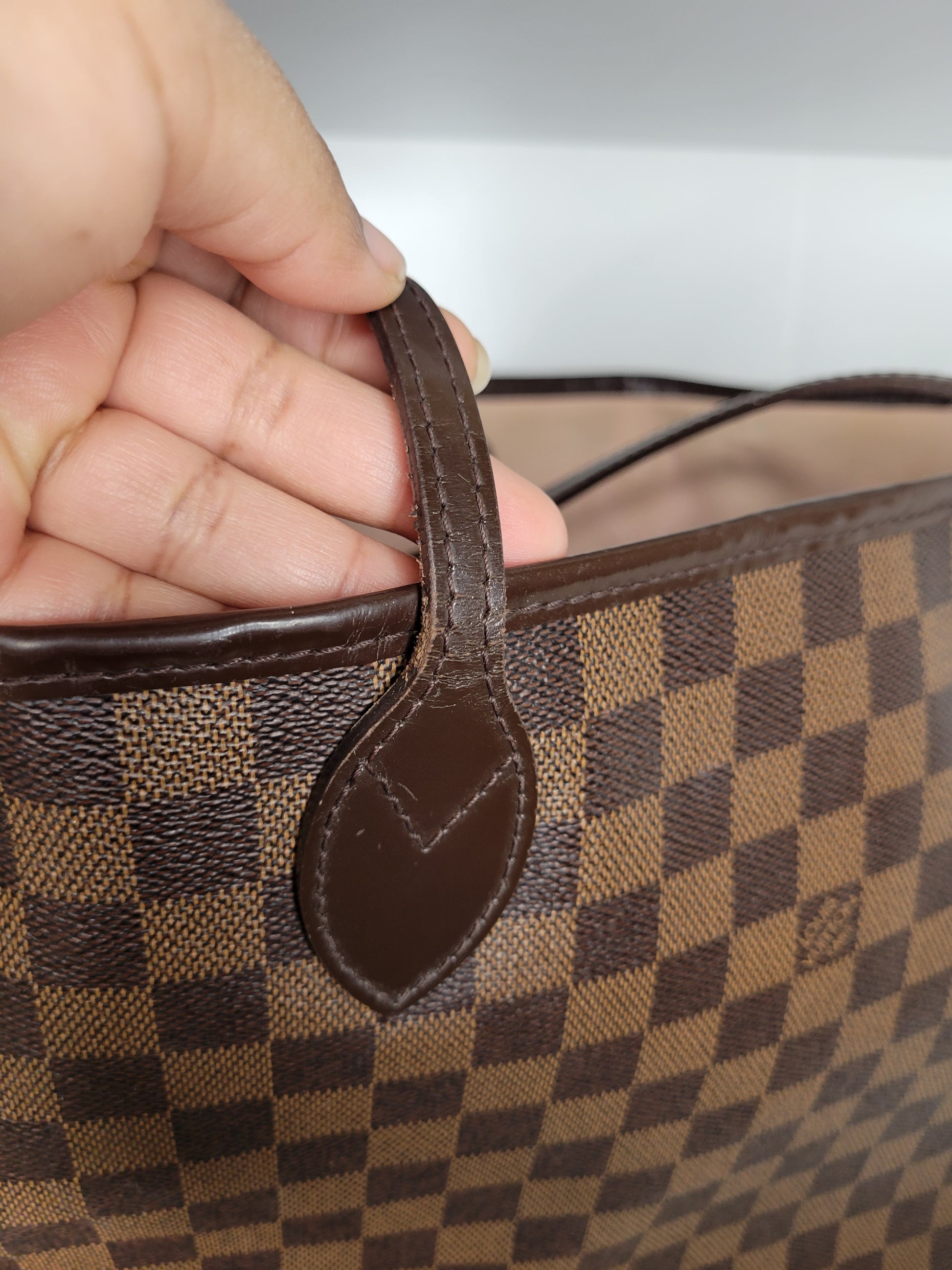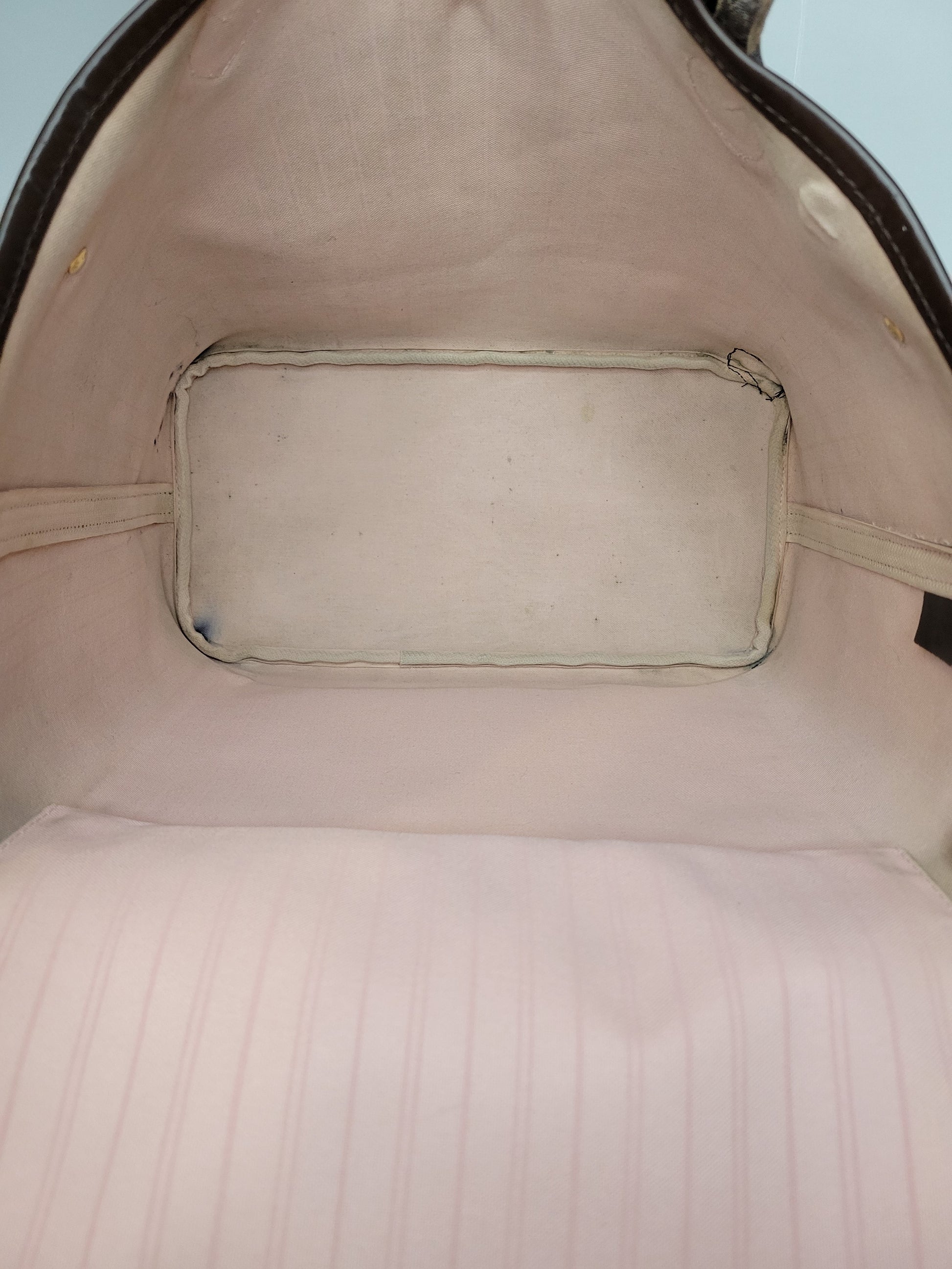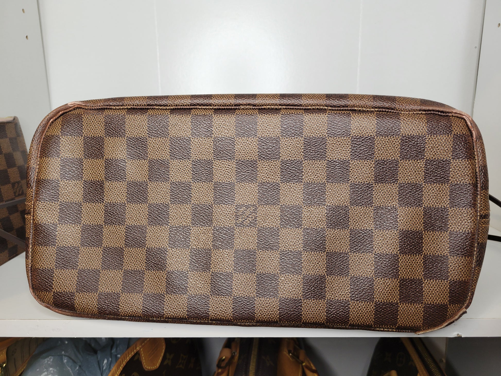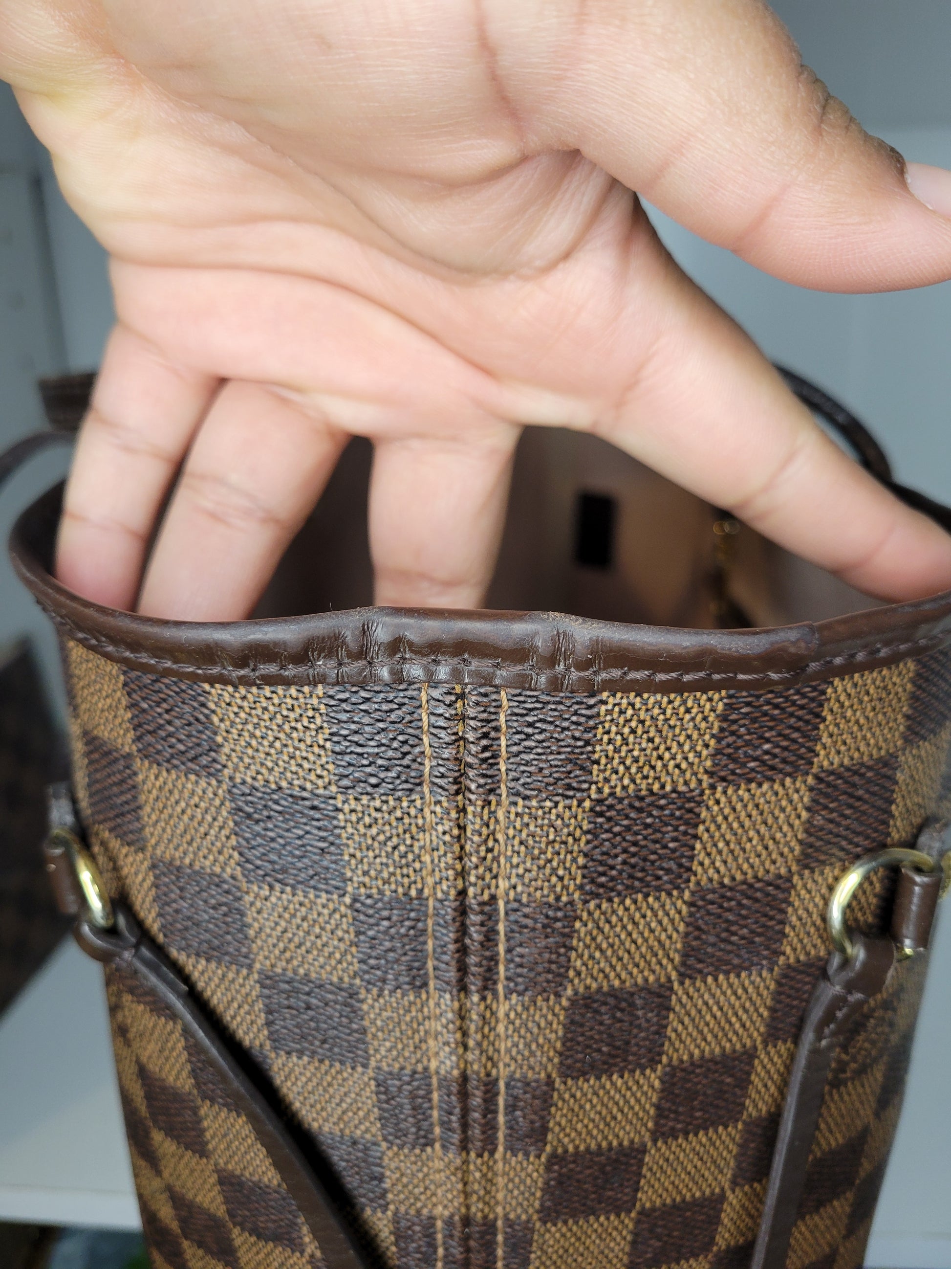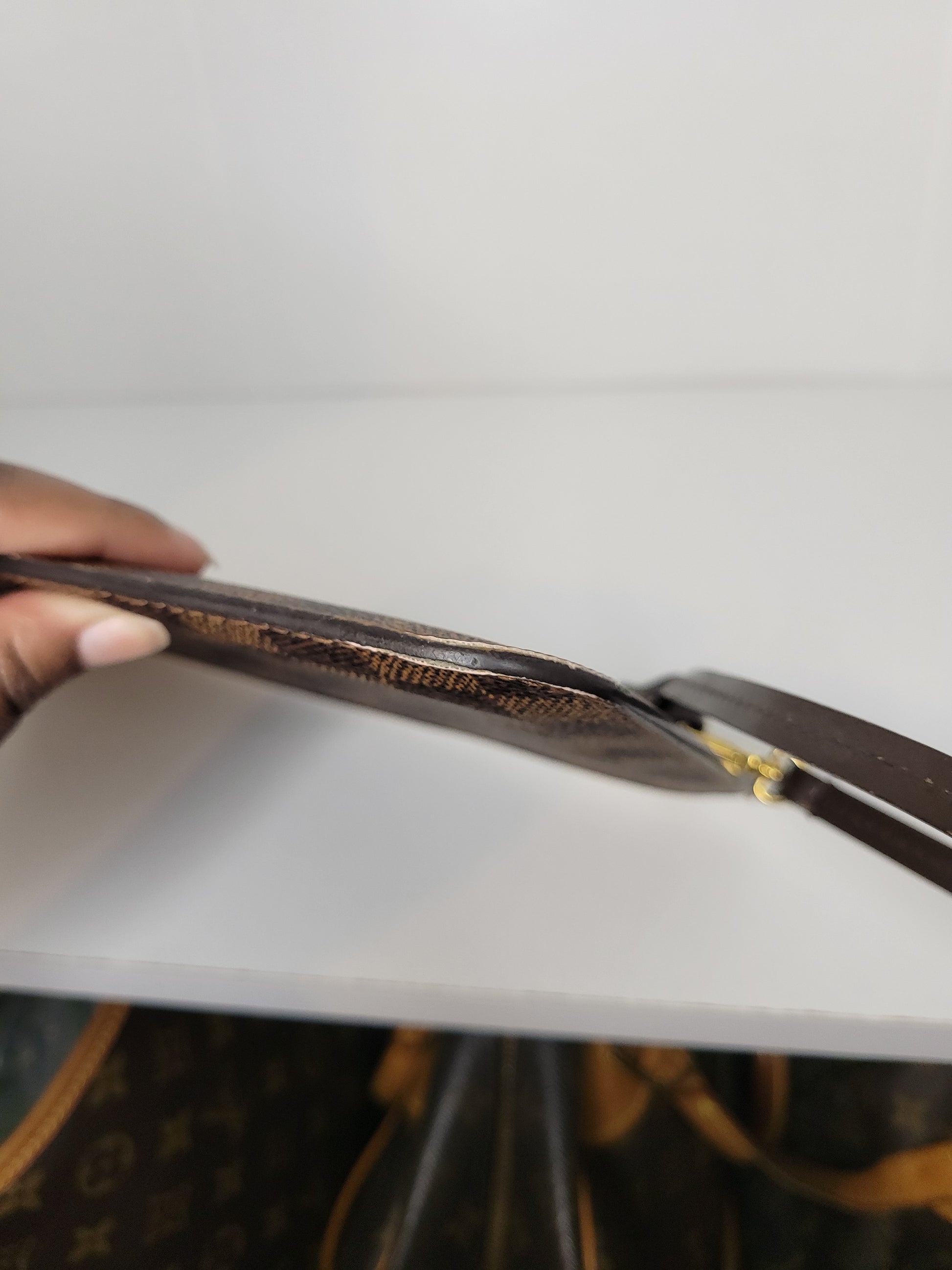 *Minor scuffs, scratches, and wear to Damier Ebene pattern on outside of bag along with two small cracks at top of bag which is losing shape