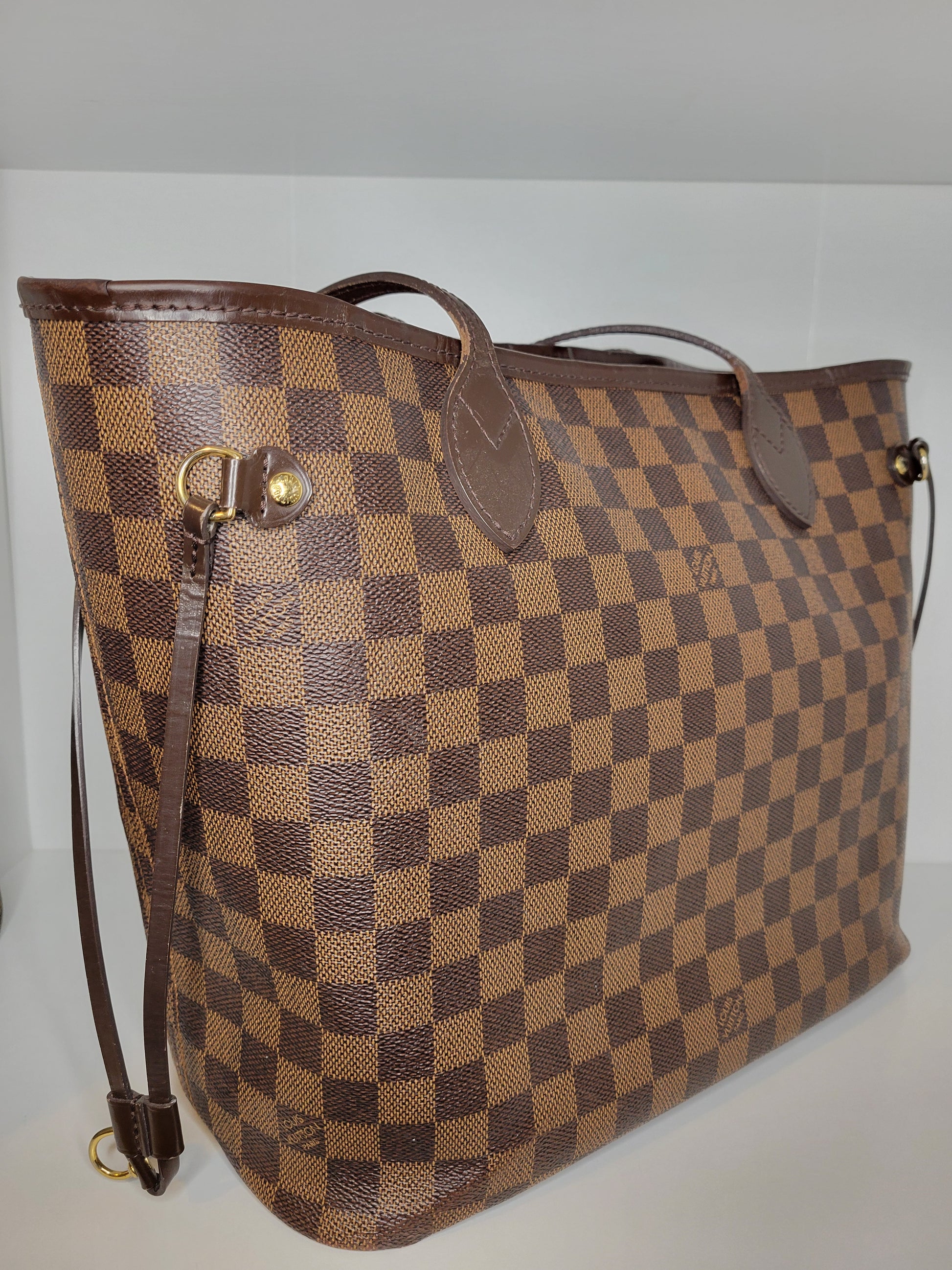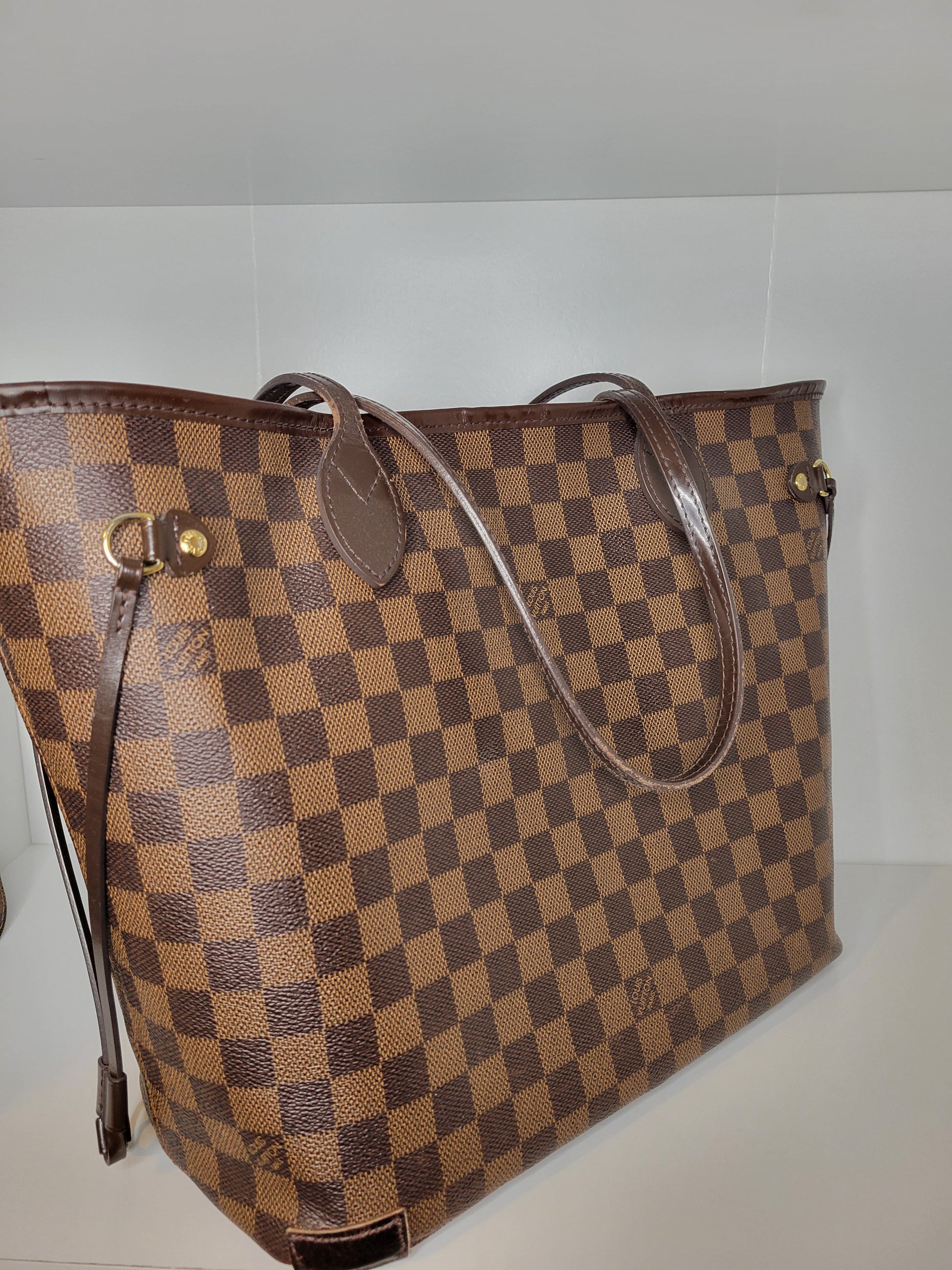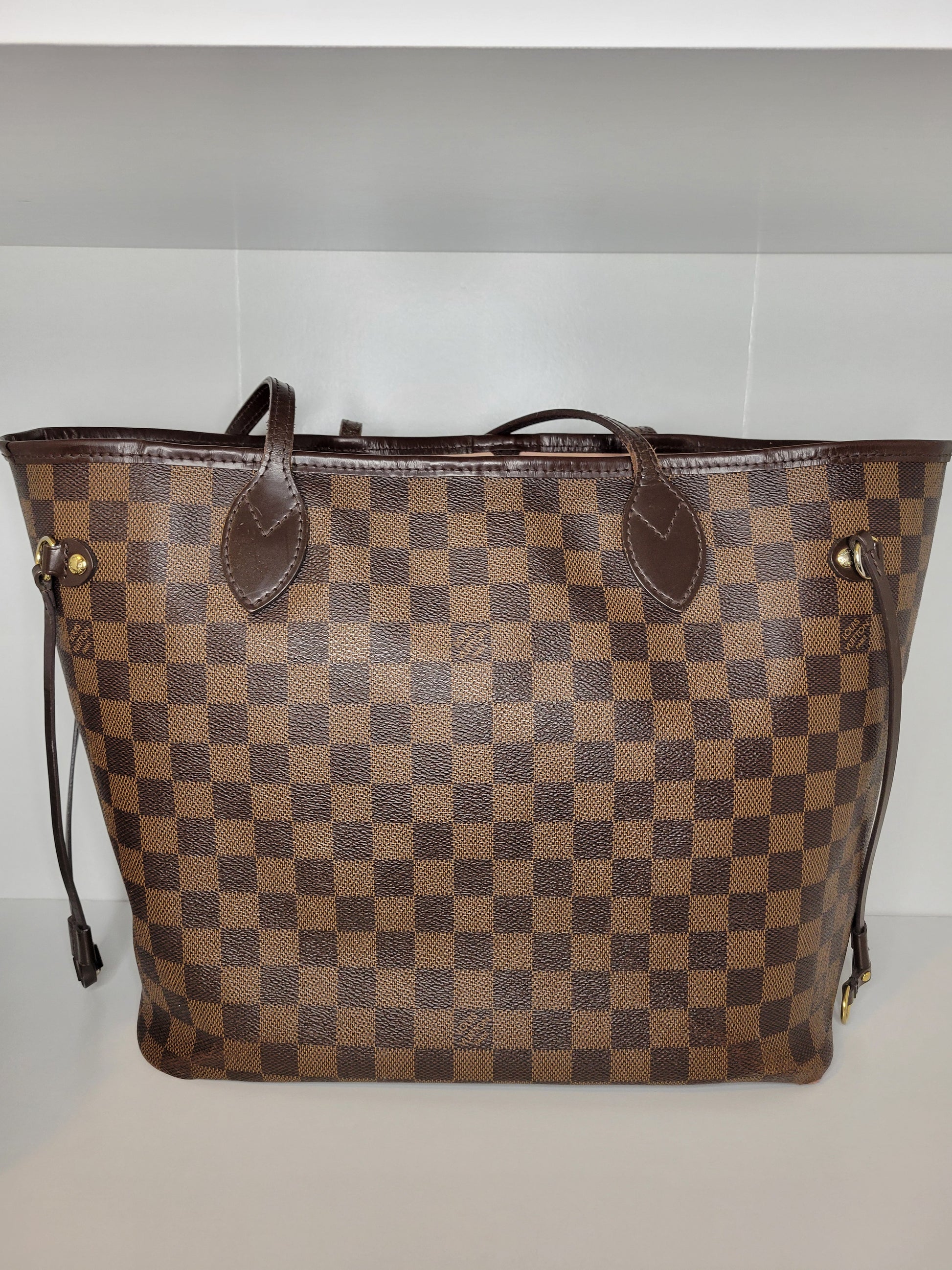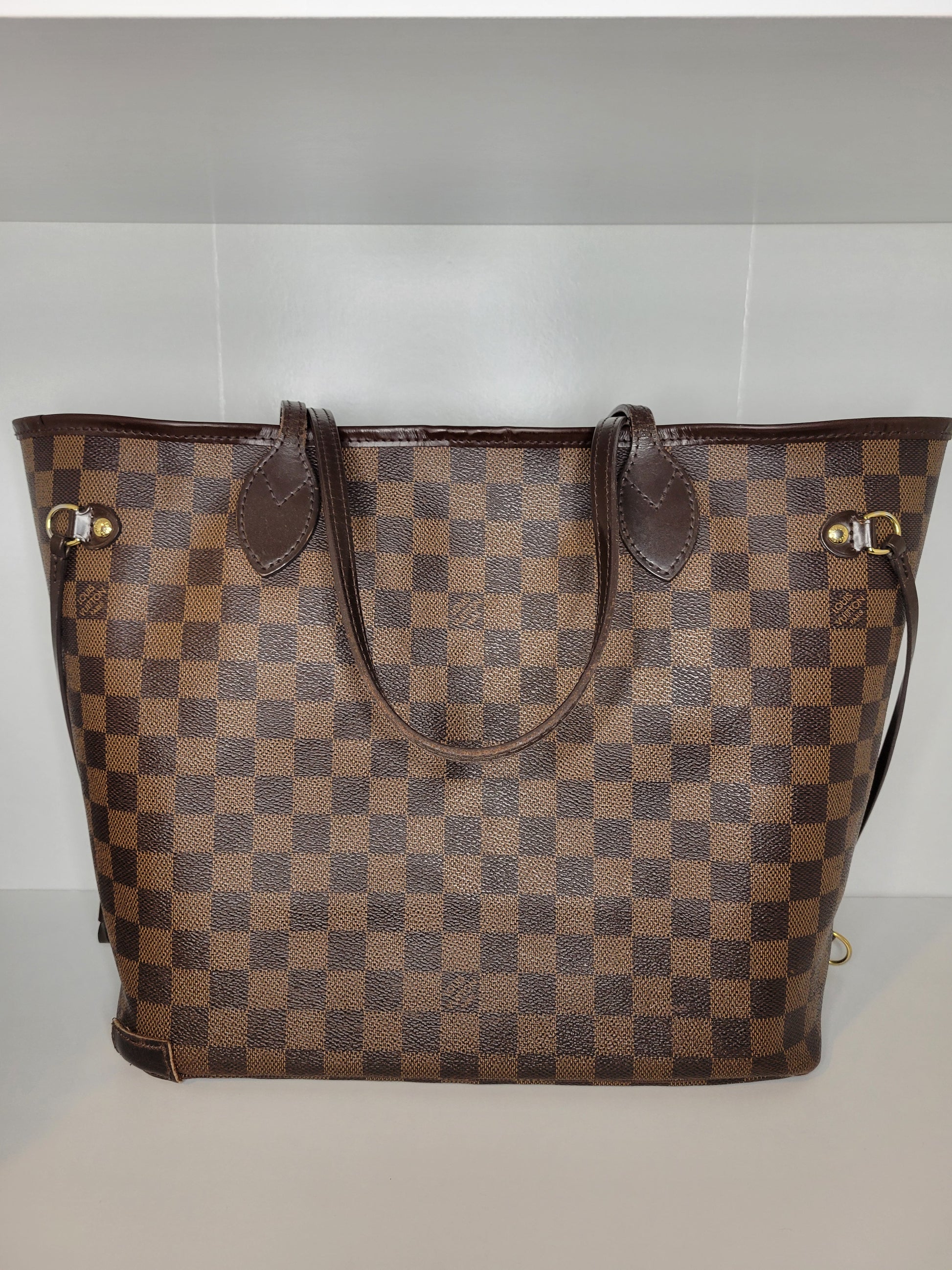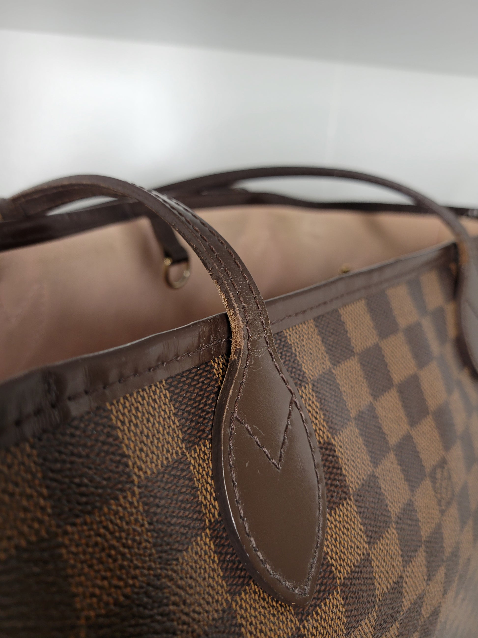 *Minor scuffs, scratches, and wear to Damier Ebene pattern on outside of bag along with two small cracks at top of bag which is losing shape