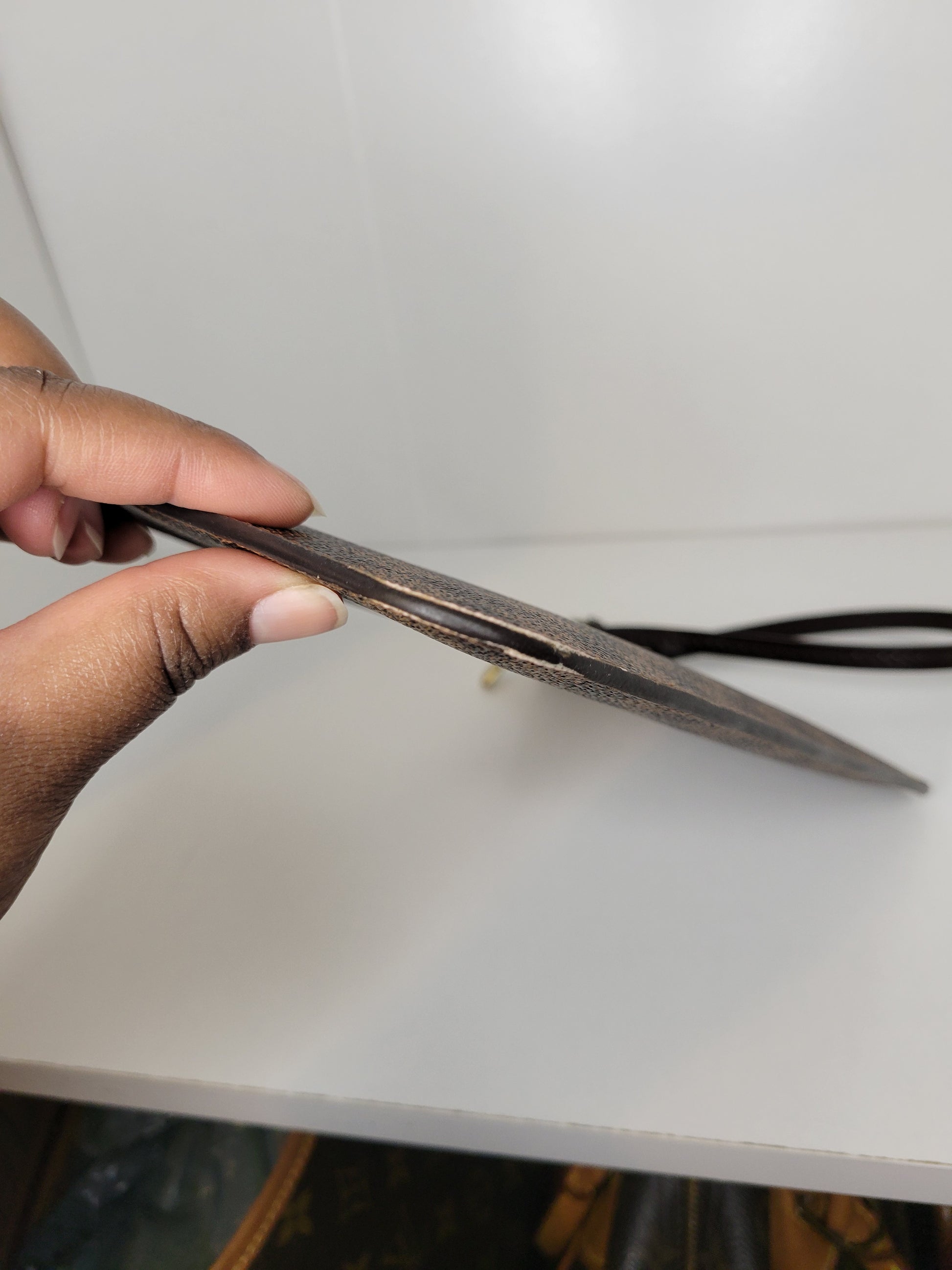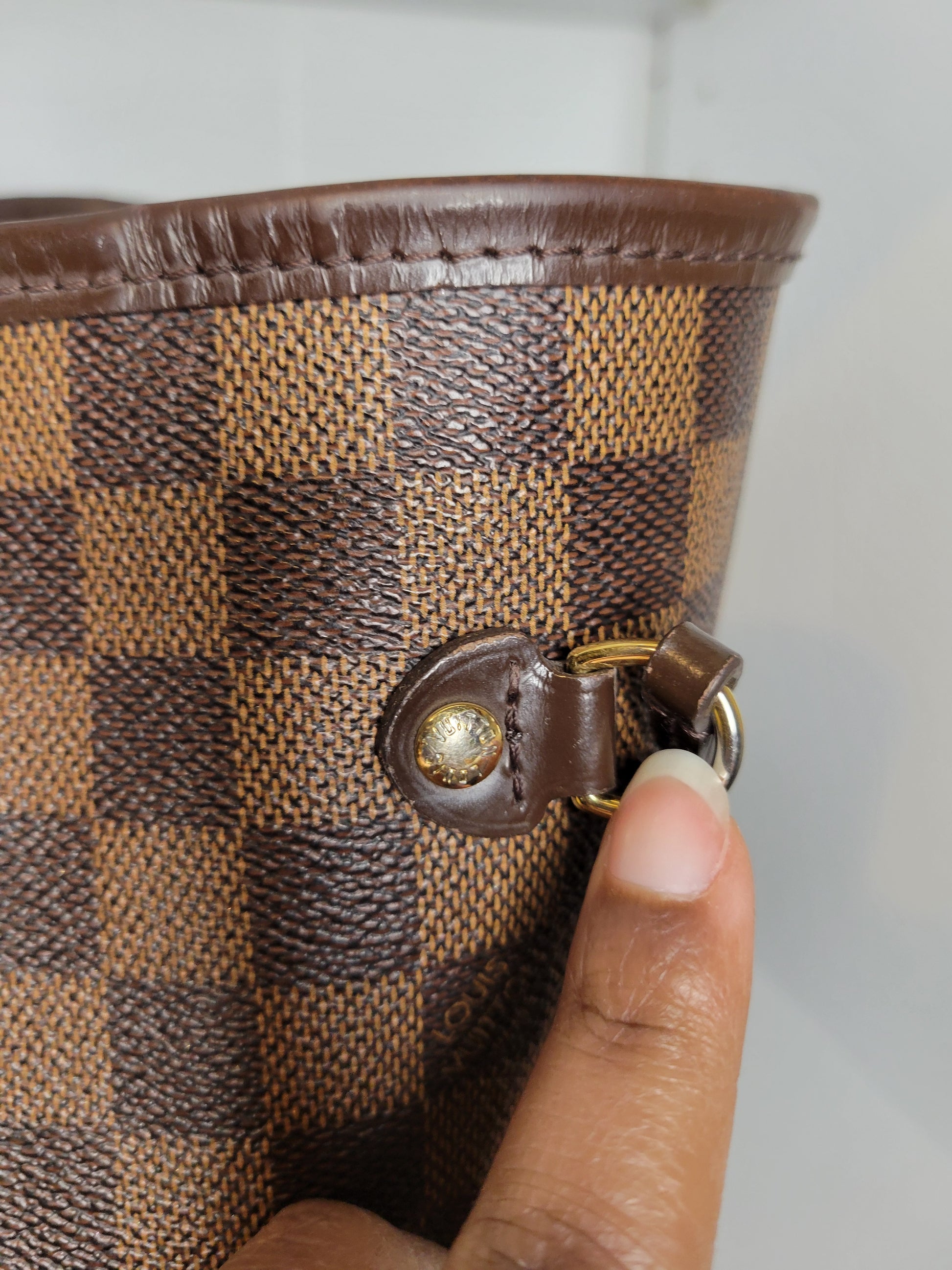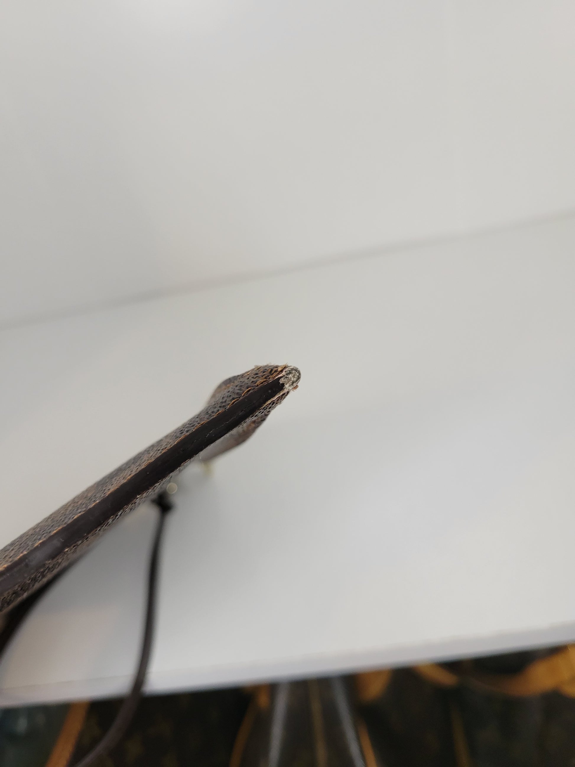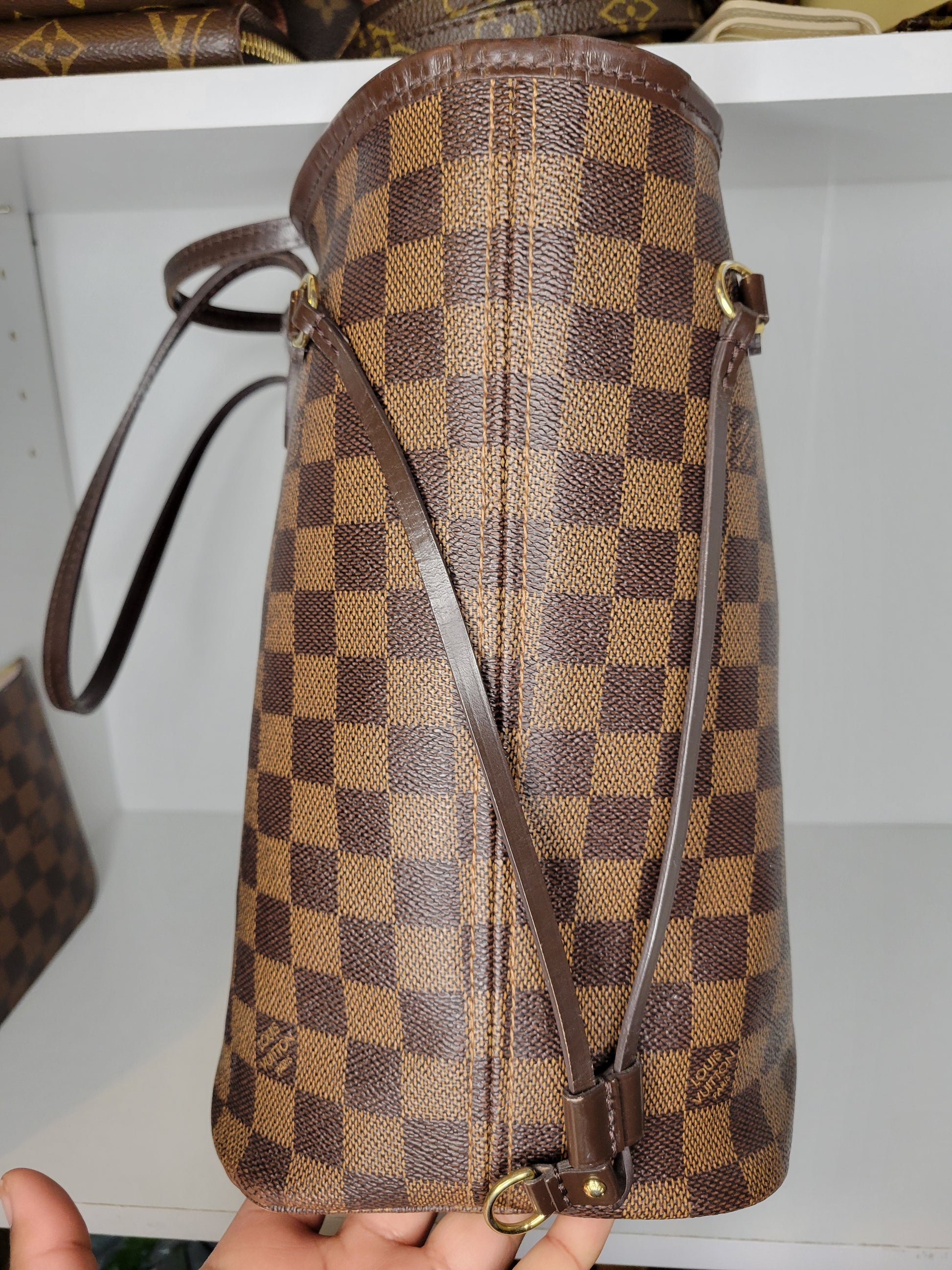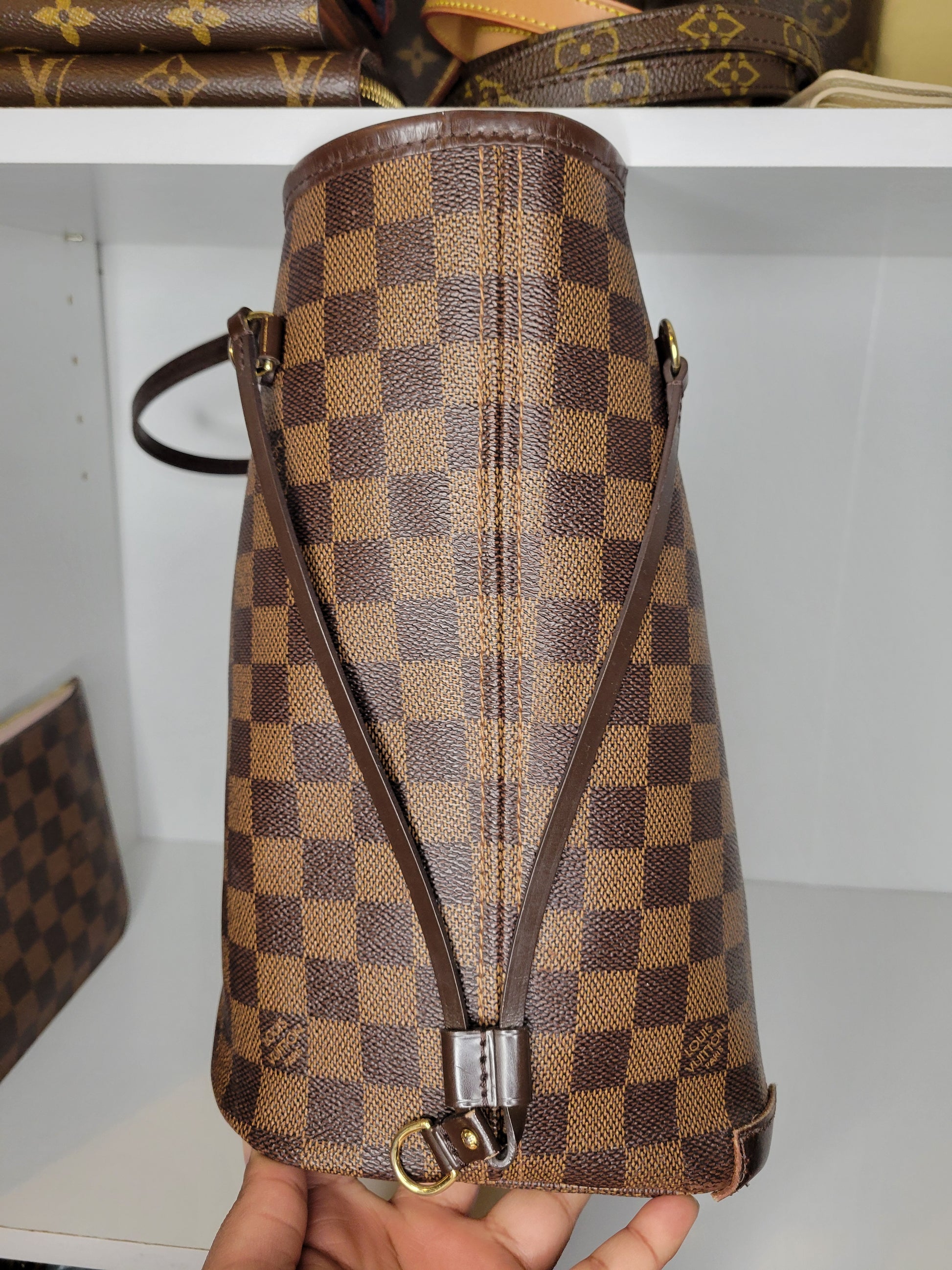 *Minor scuffs, scratches, and wear to Damier Ebene pattern on outside of bag along with two small cracks at top of bag which is losing shape