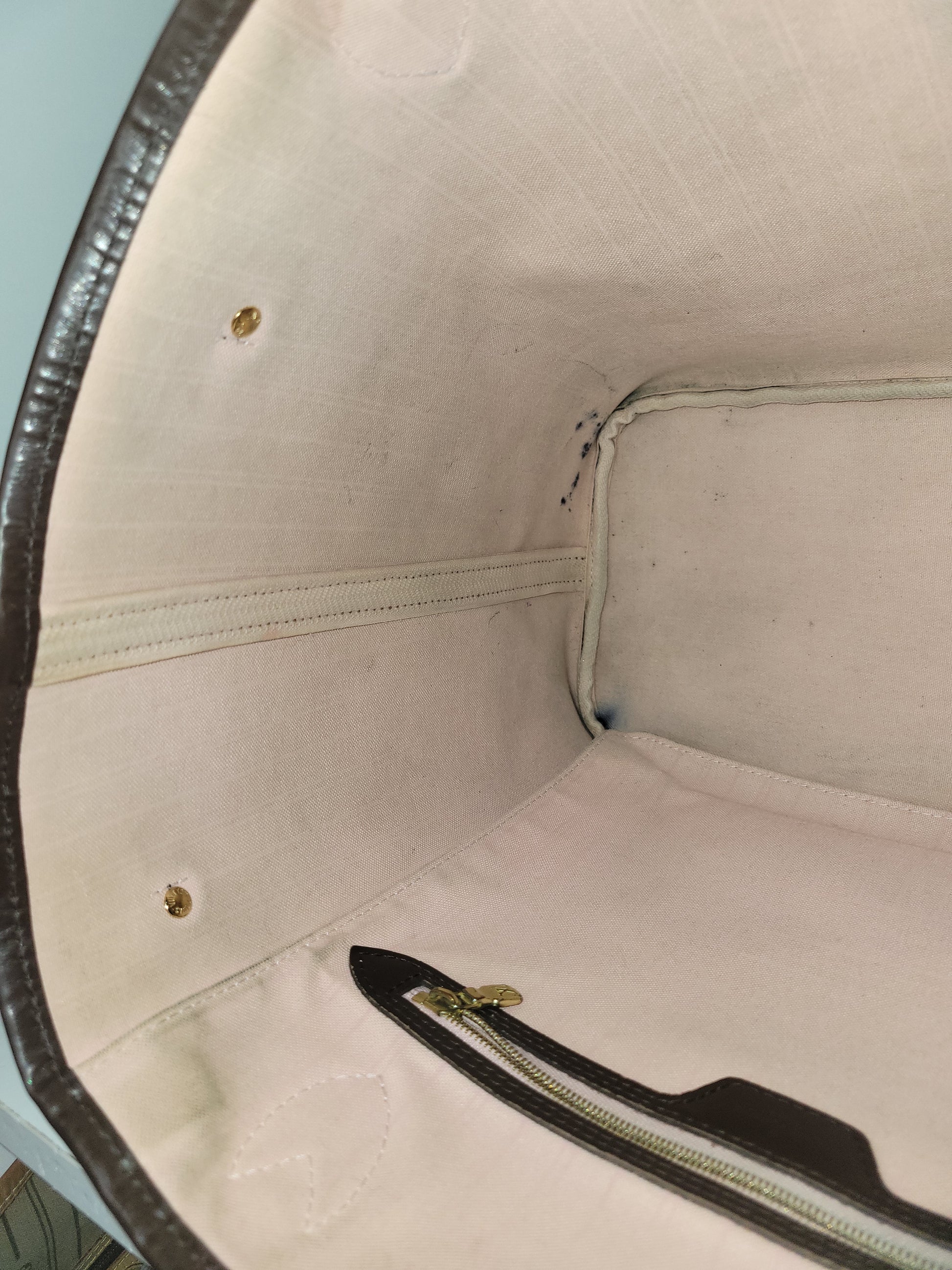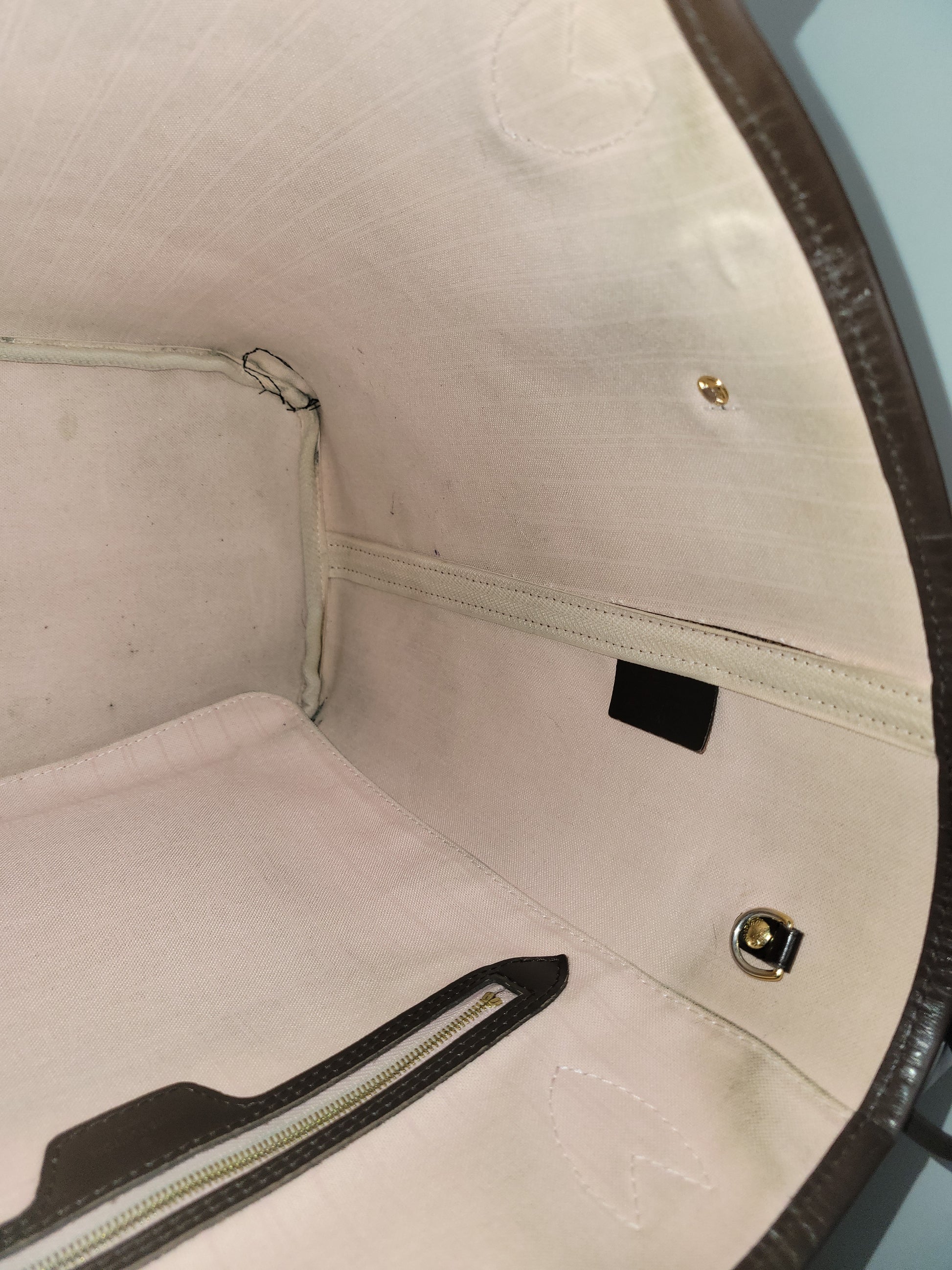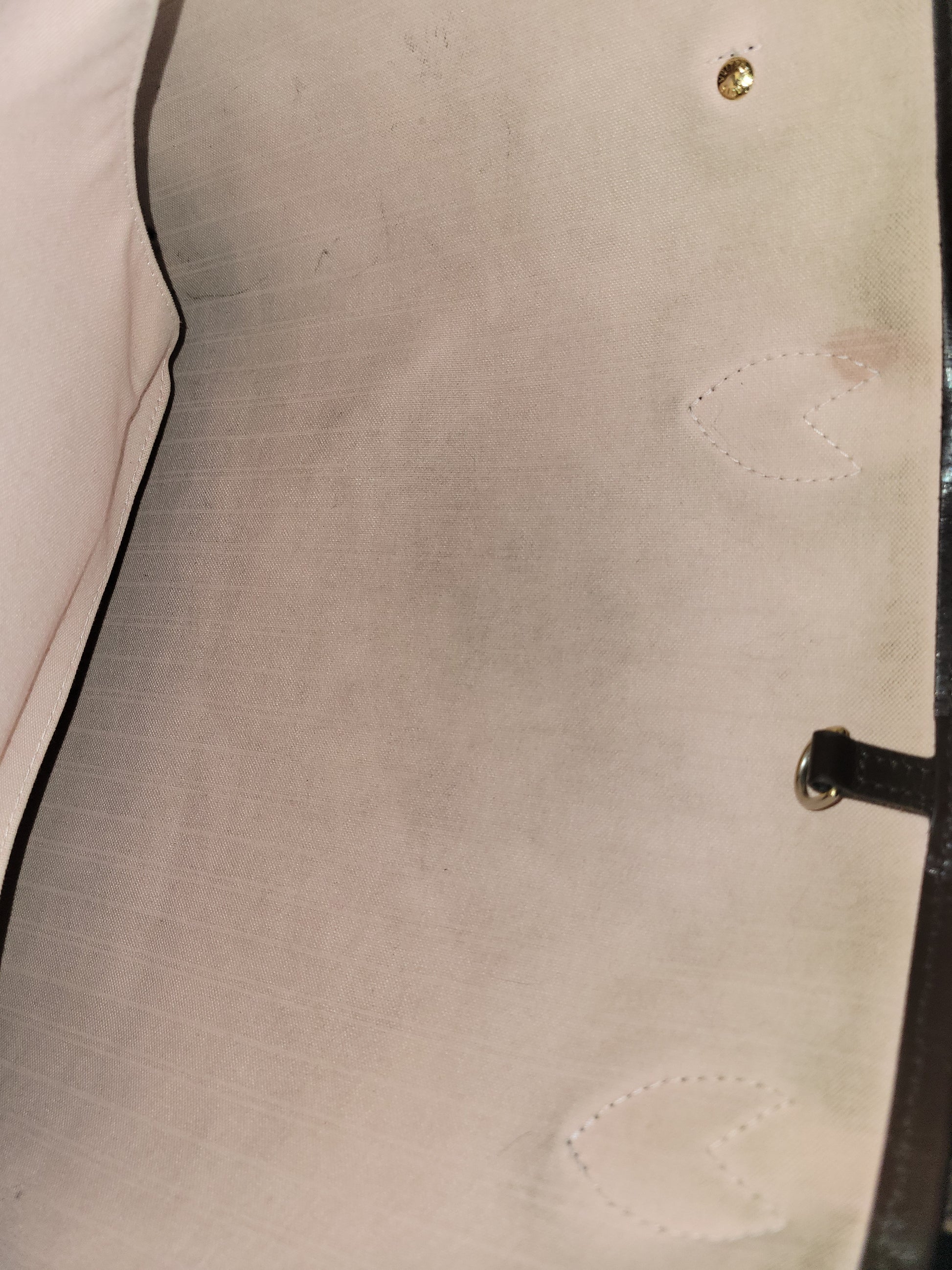 *The main pocket is soiled, has dirt, pen marks and multiple stains. The inside shows heavy wear