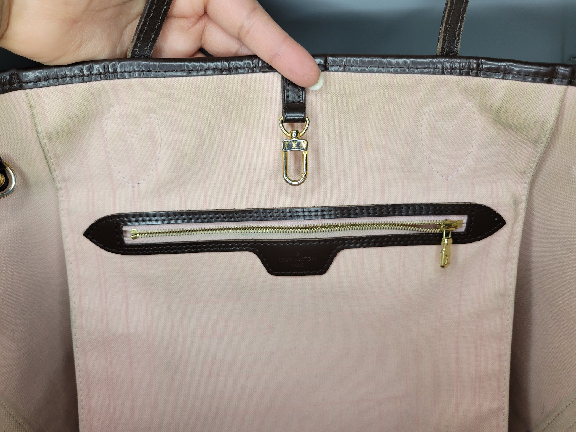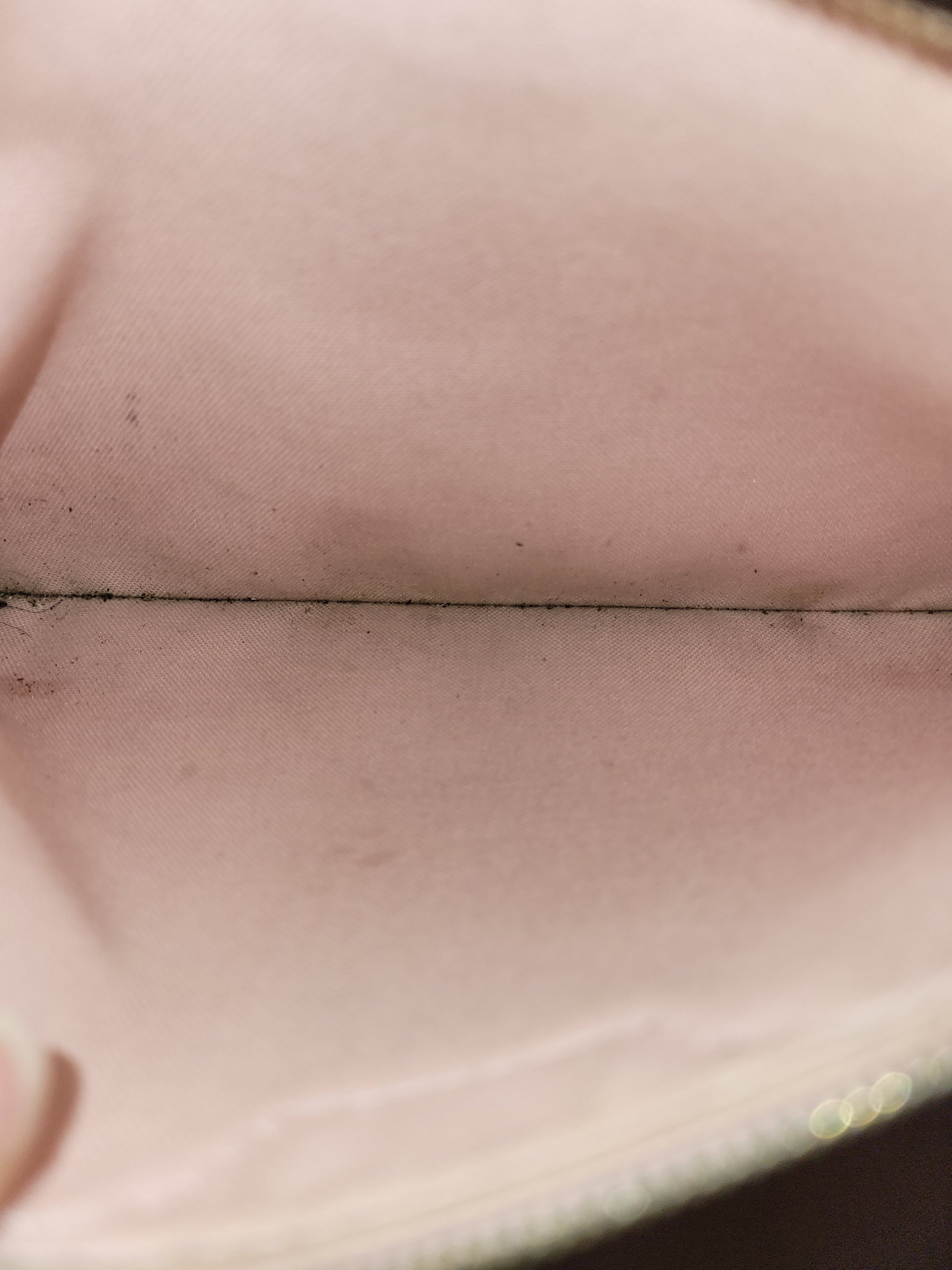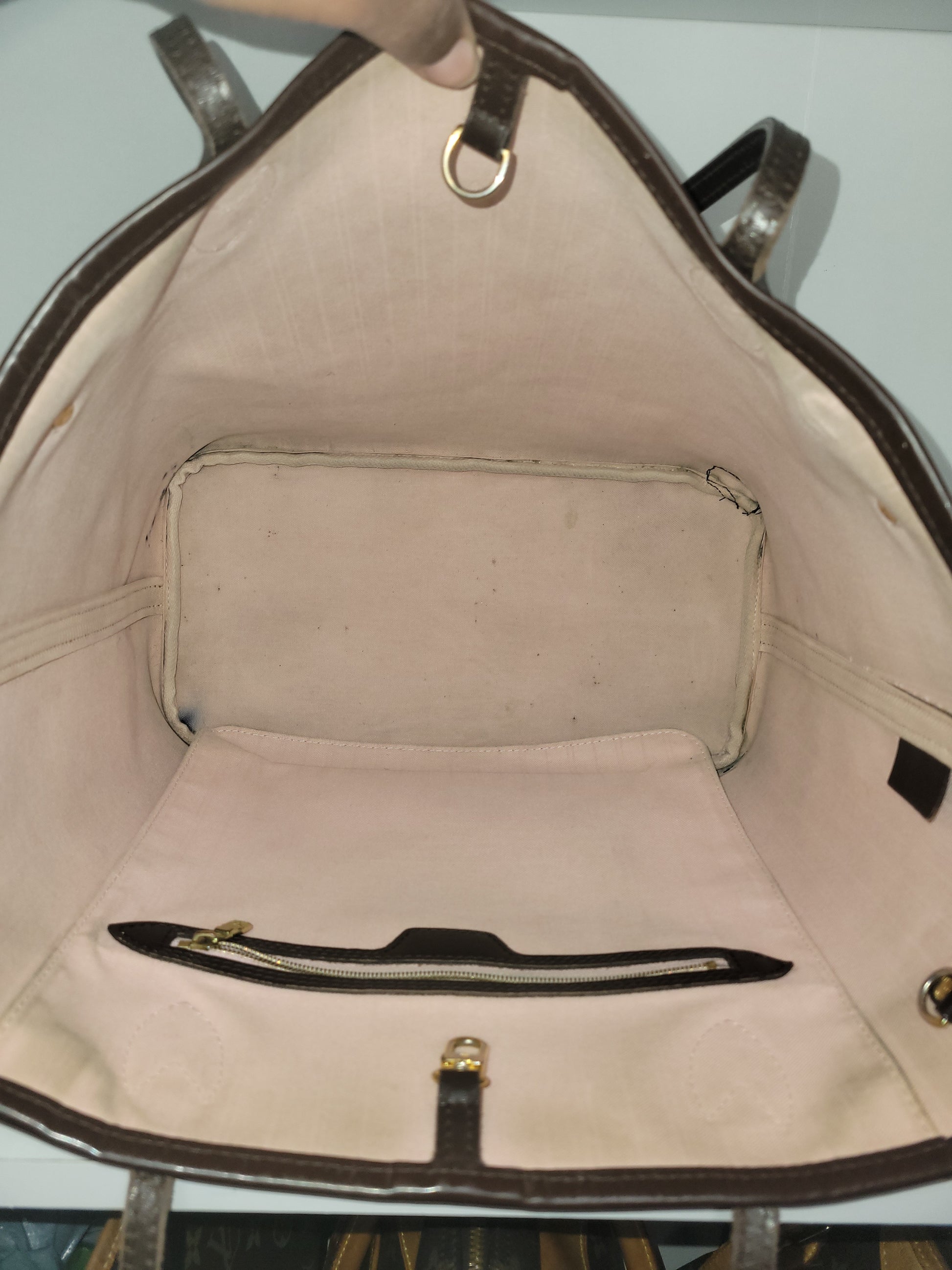 *The main pocket is soiled, has dirt, pen marks and multiple stains. The inside shows heavy wear
