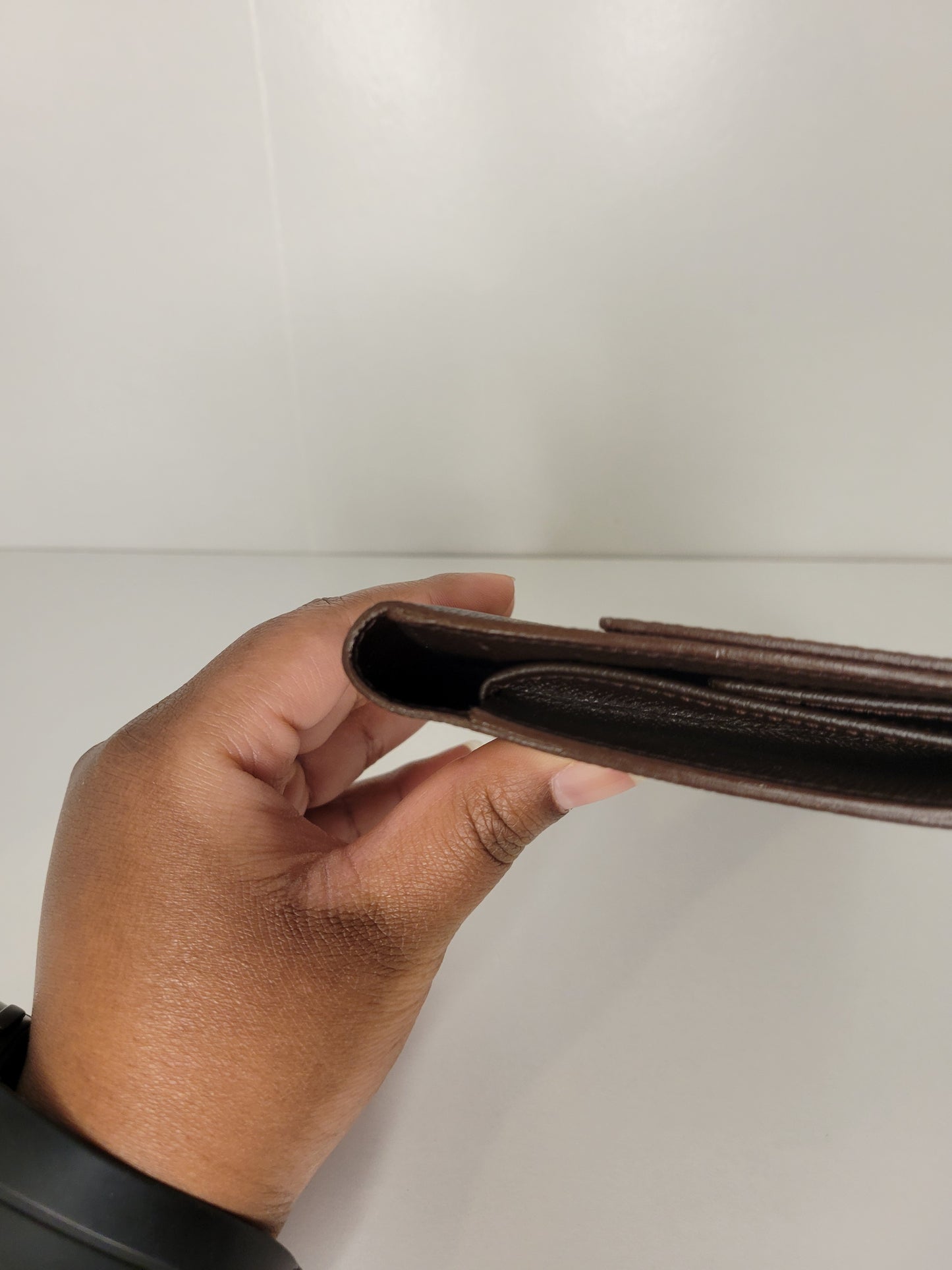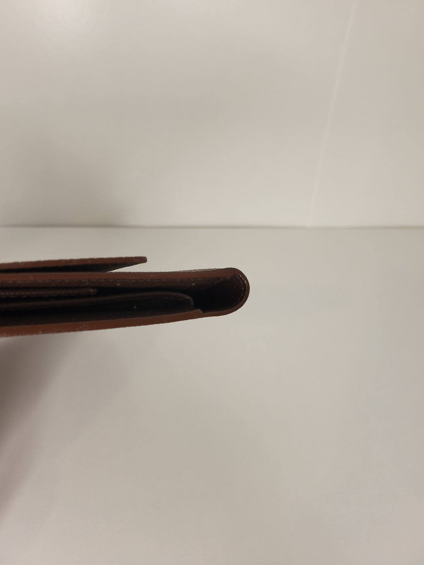 This unique vintage wallet features 6 card slots, one buttoned coin pocket, a large slot behind the card holders and a pen holder!