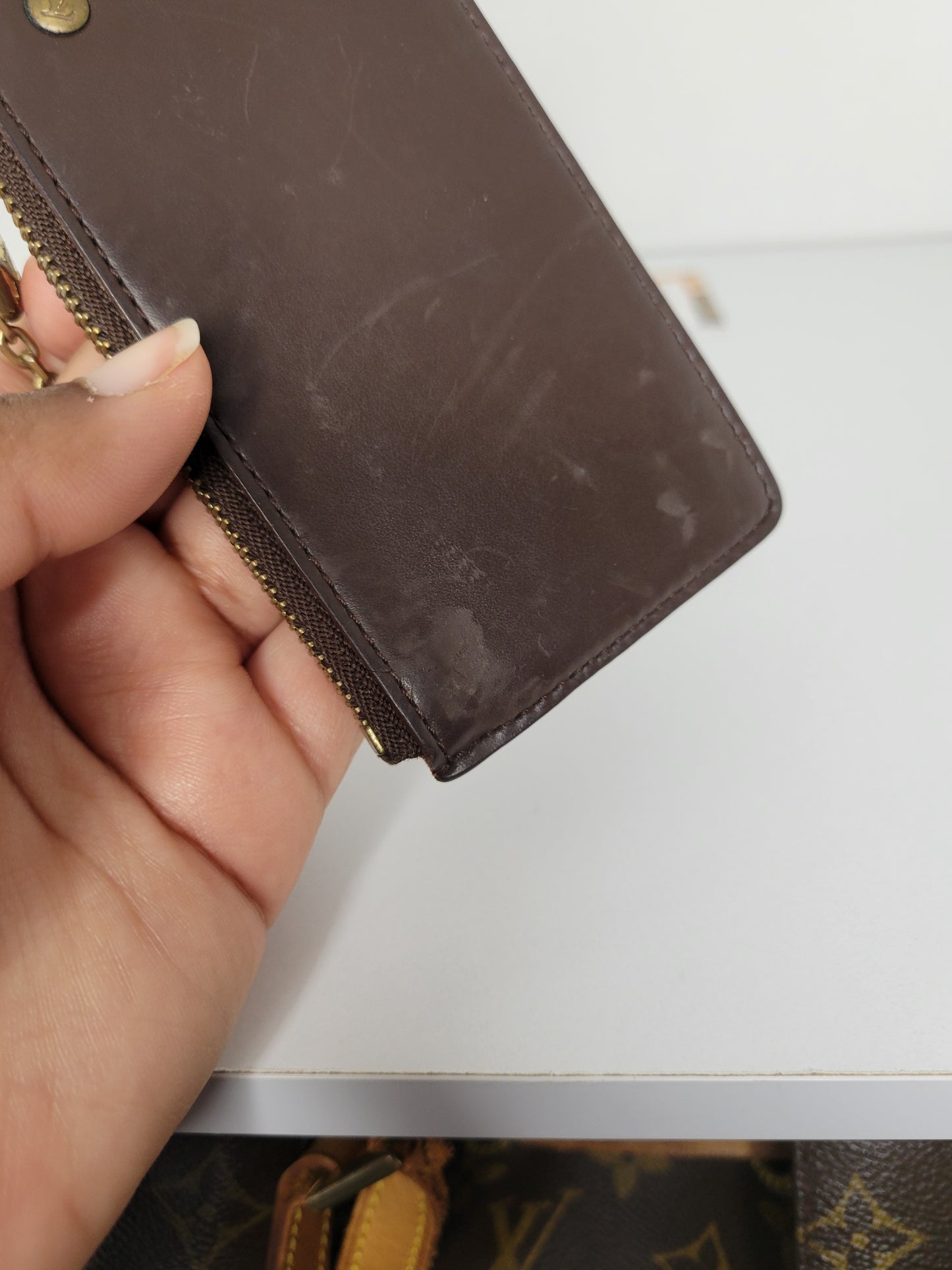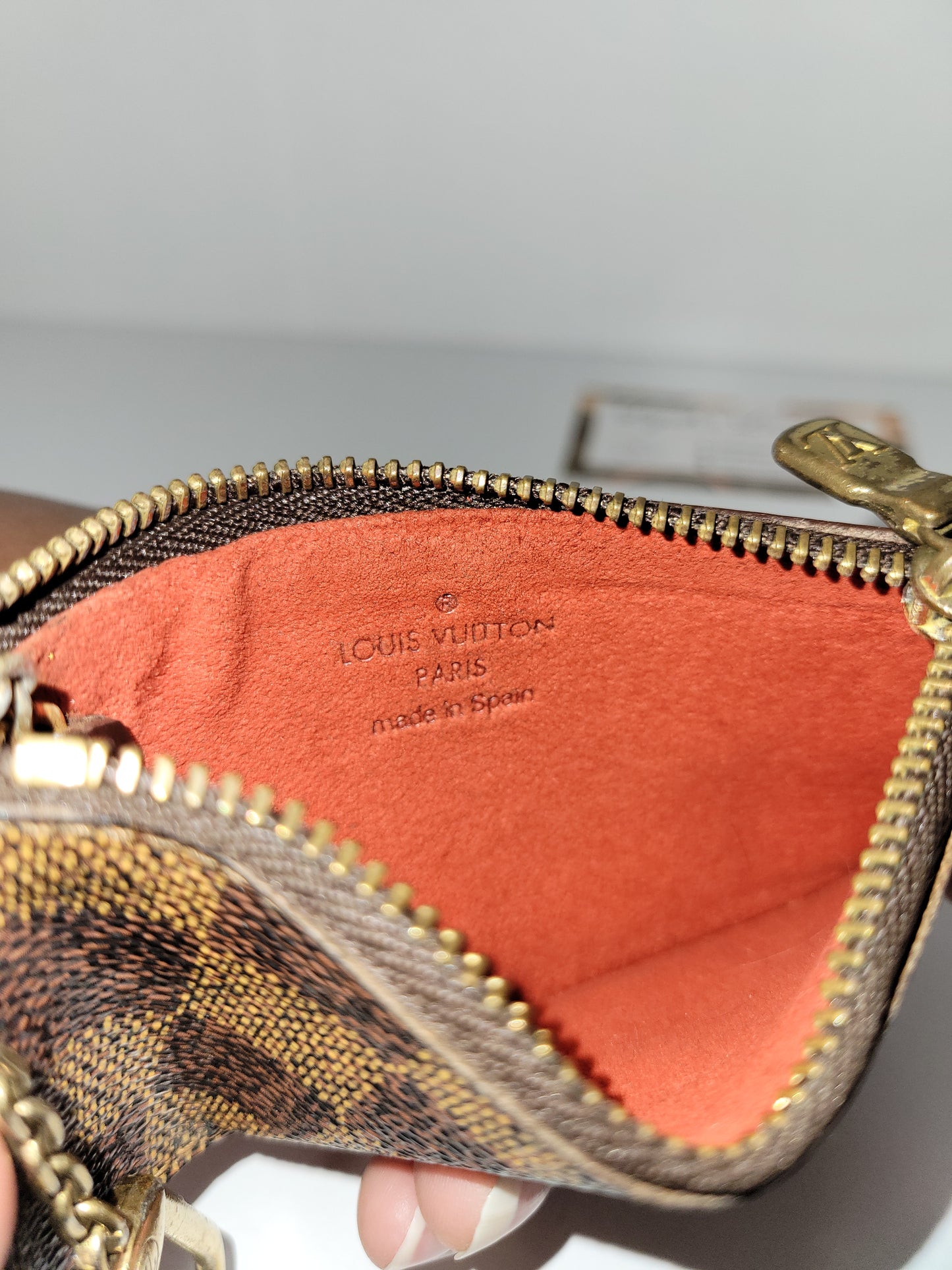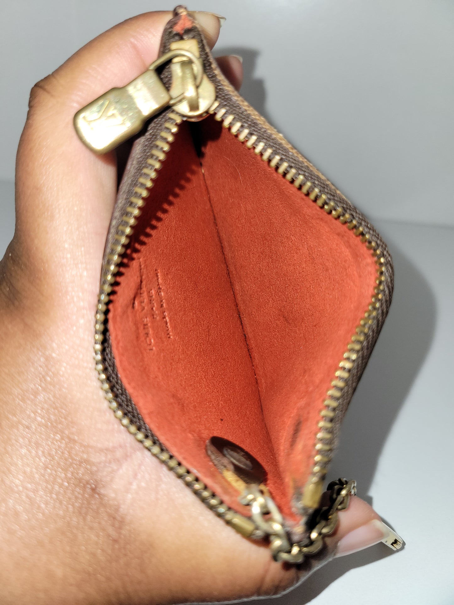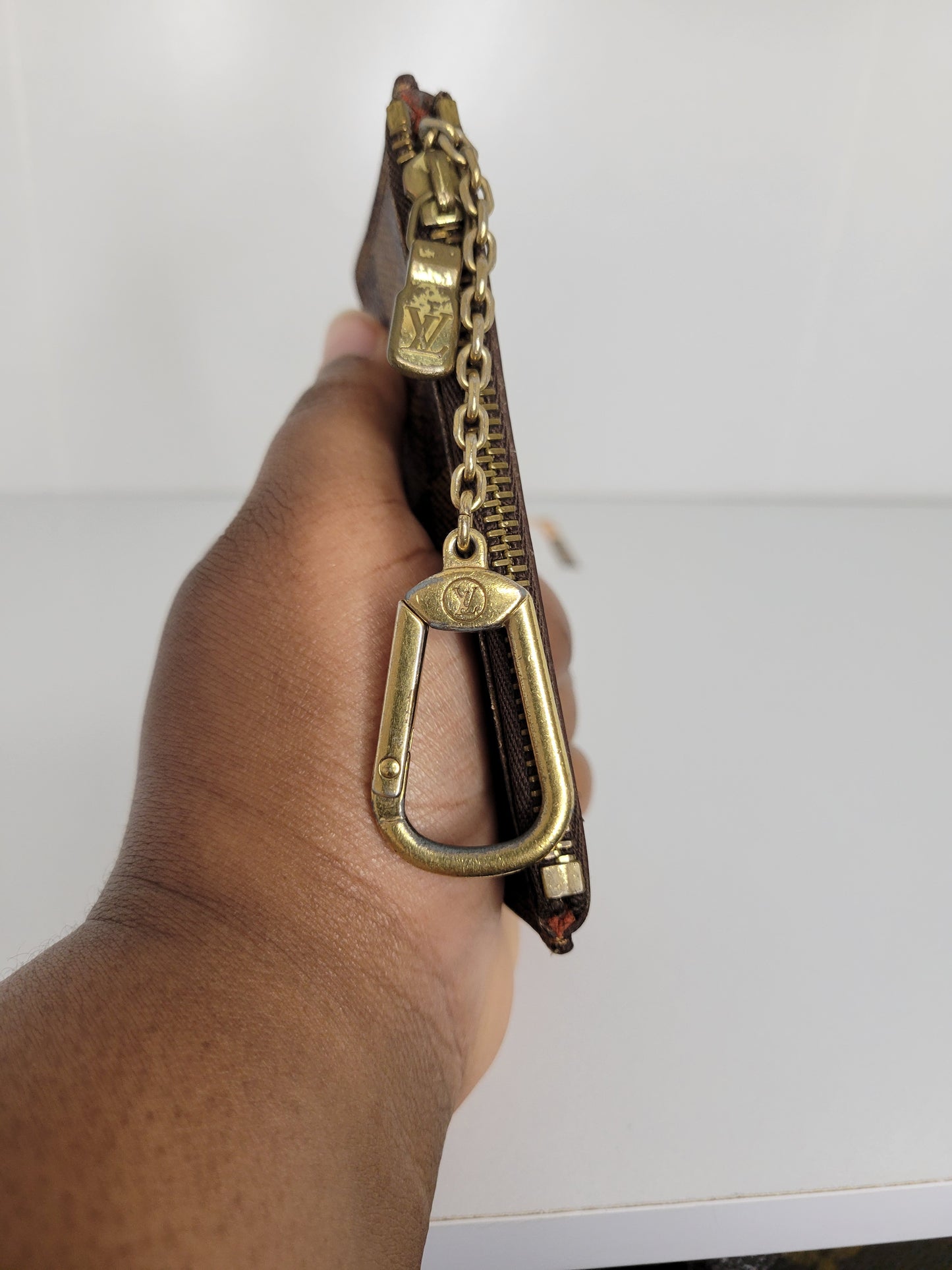 This rare key pouch is a nice piece to add to your collection! It can hold several business cards, credit cards and the chain can be used for keys, to attach in another LV bag, or even on a belt. This piece has less width than the standard key pouch.ย