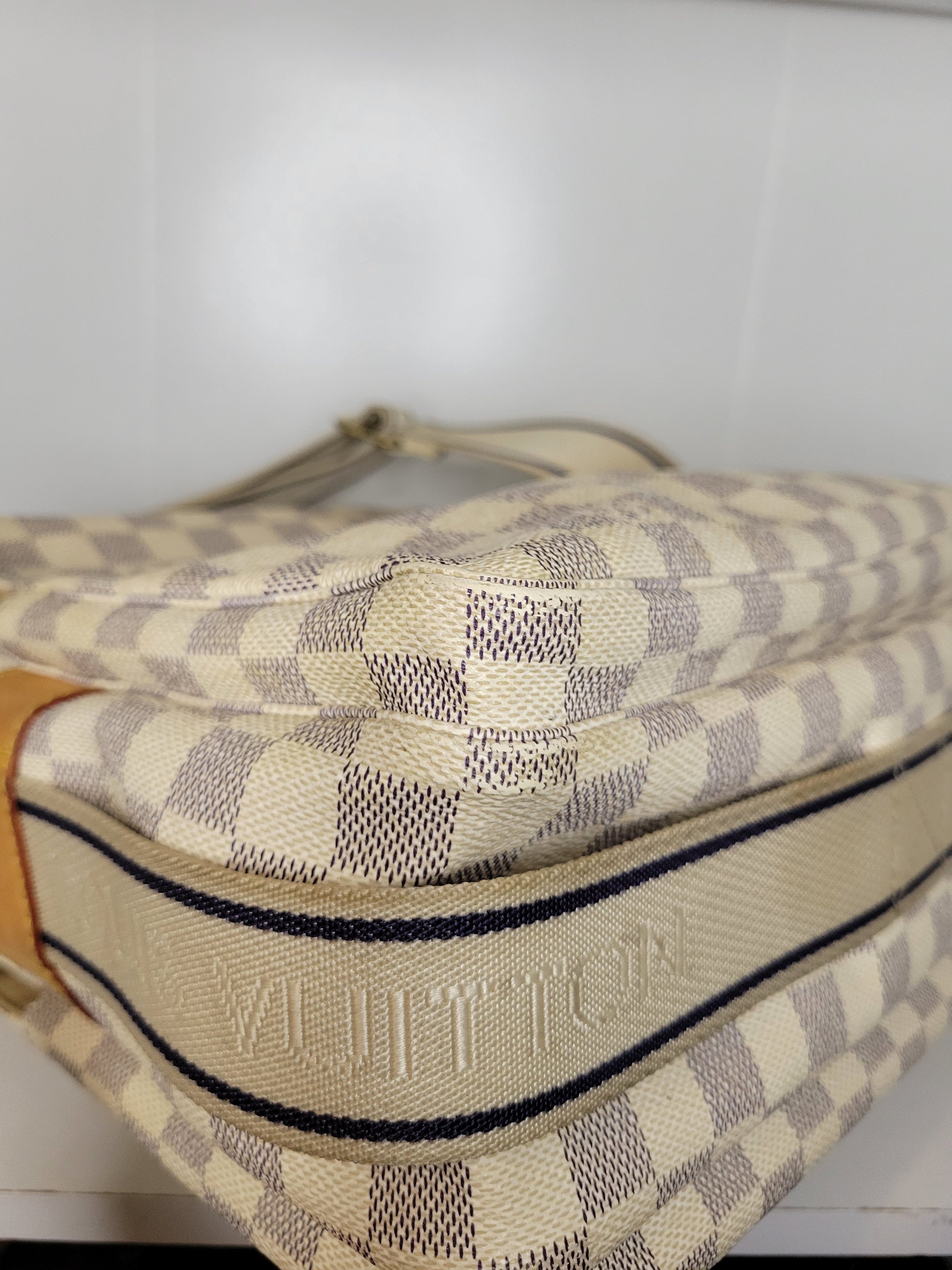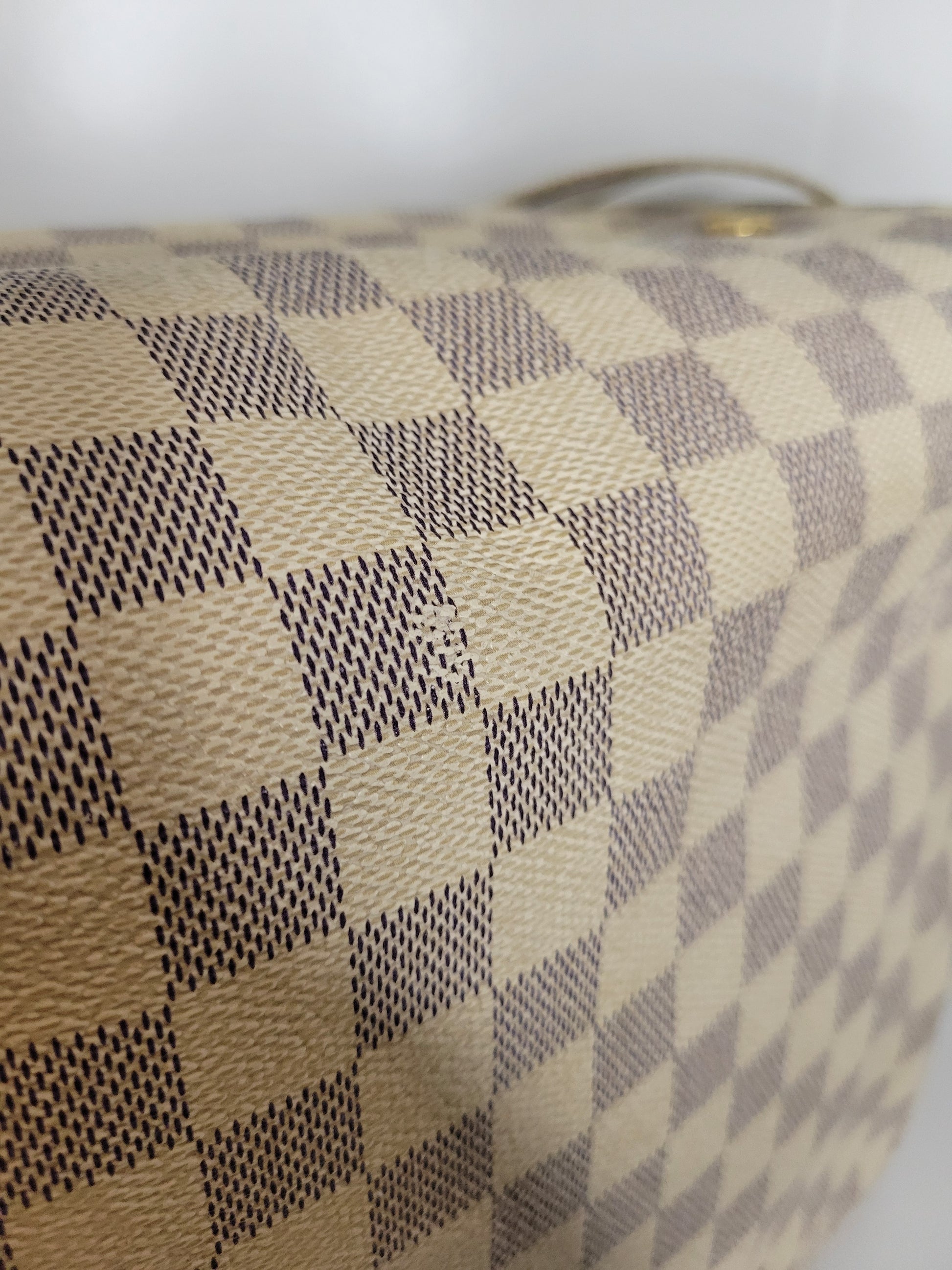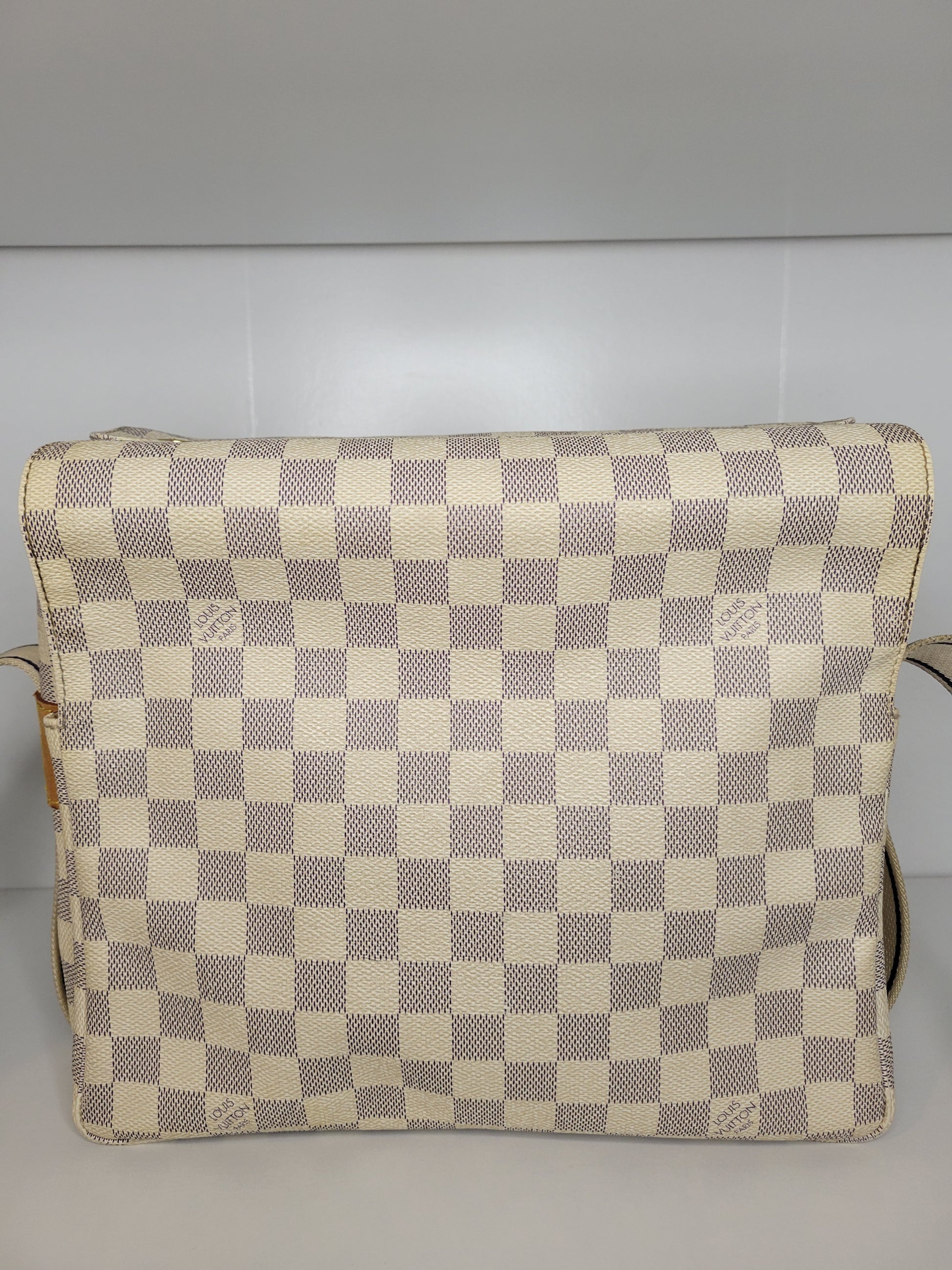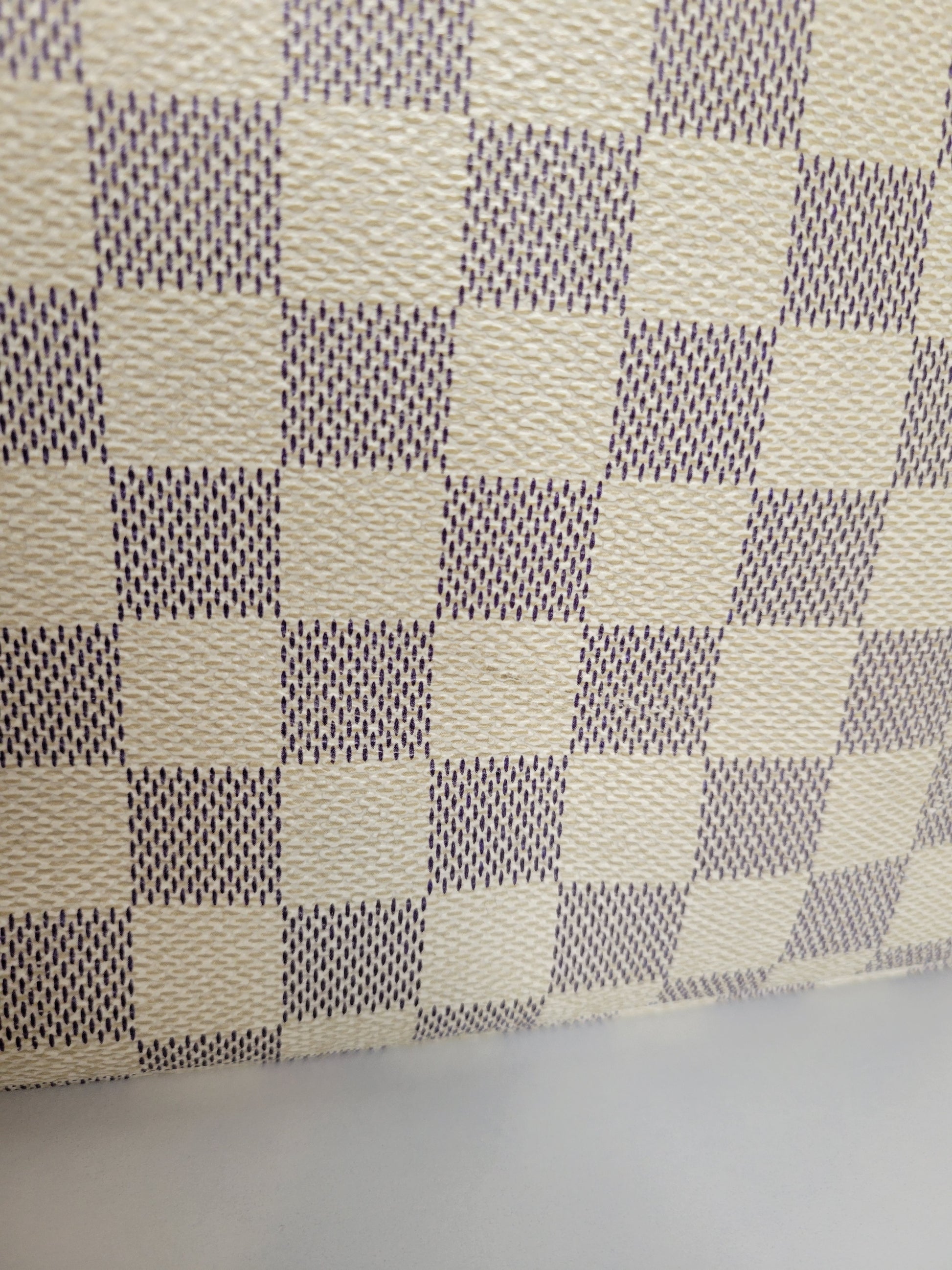 *Outside of the bag shows different signs of wear to Damier Azur pattern including rubbing on corners and edges, slight fading on some squares and yellowing of pattern on edges