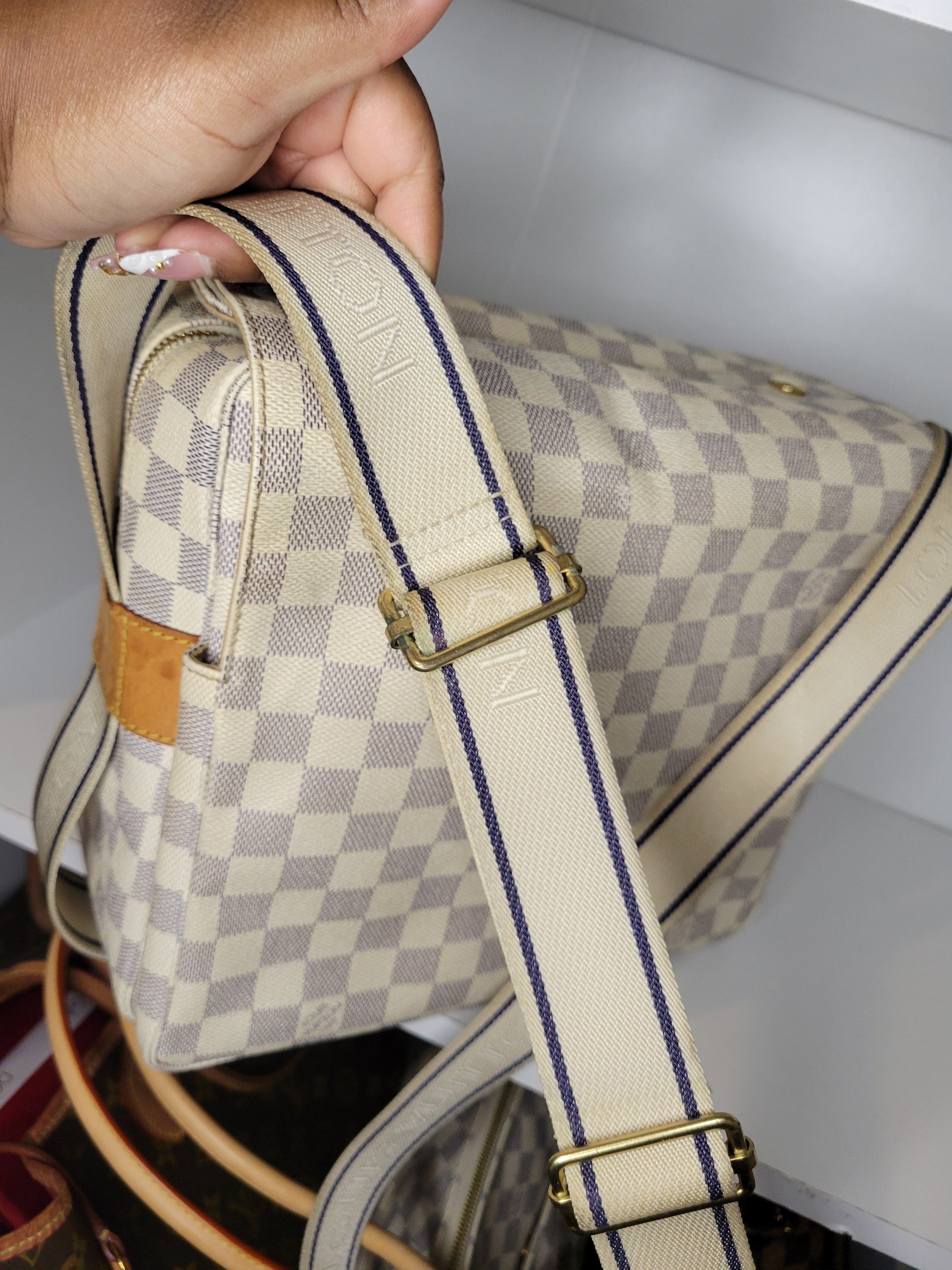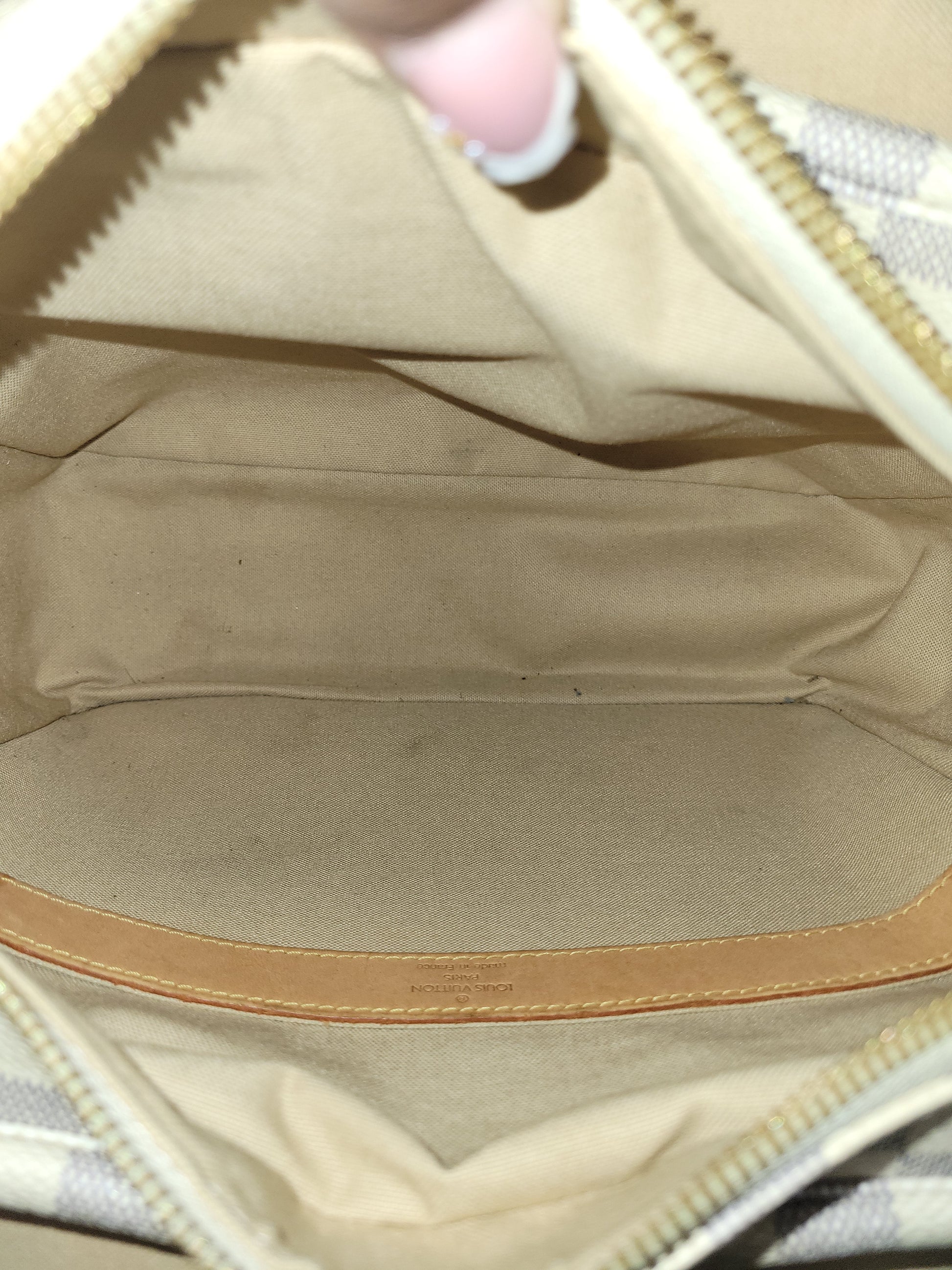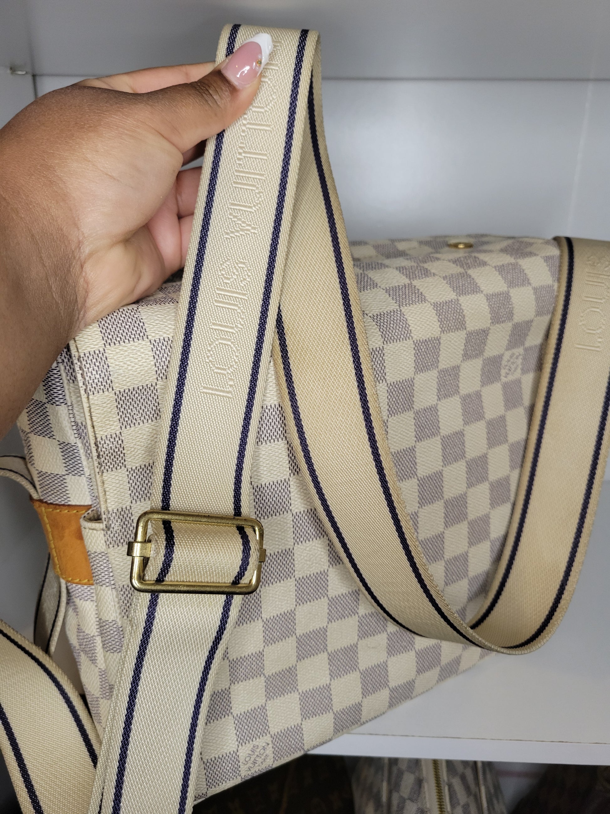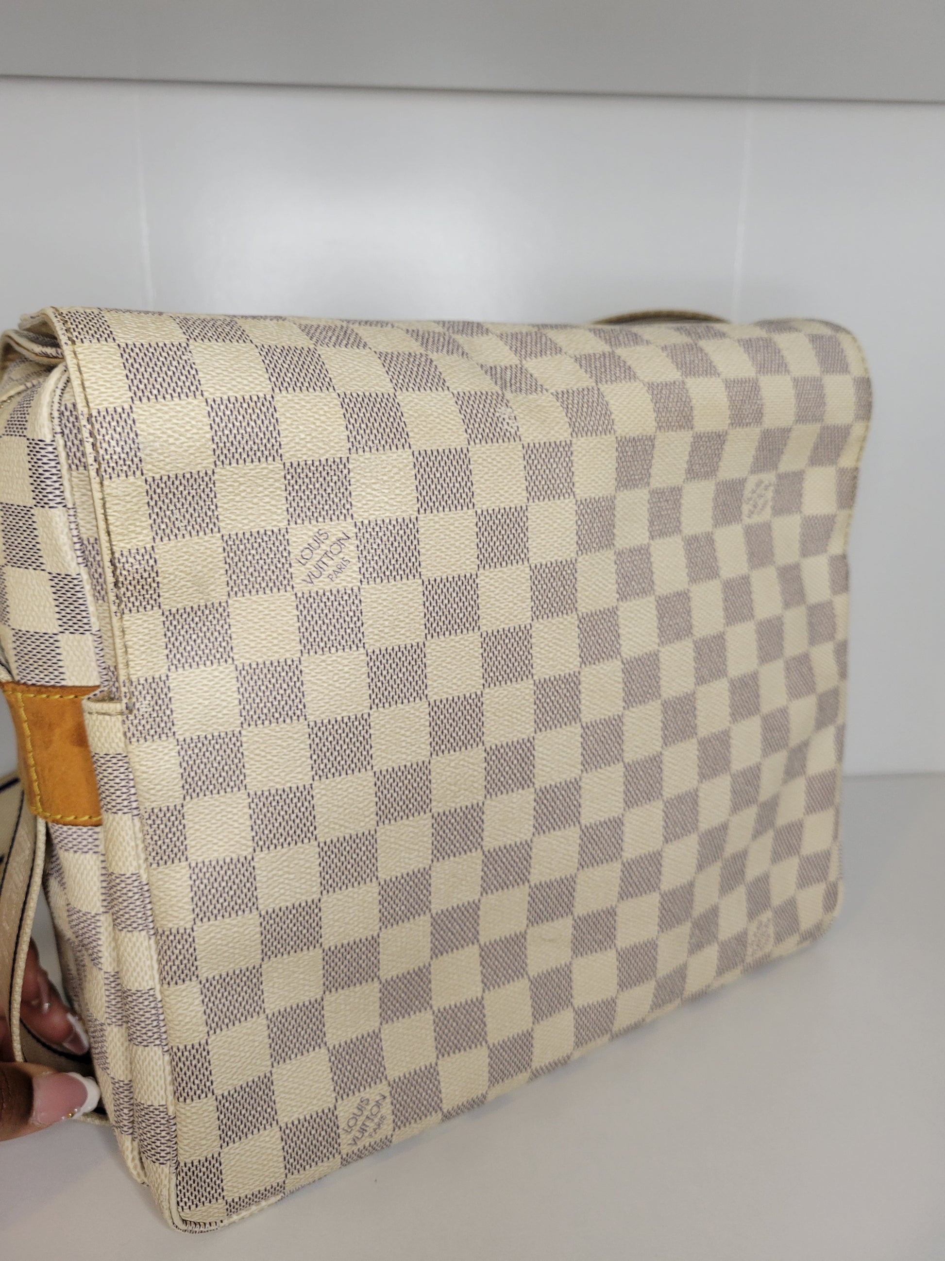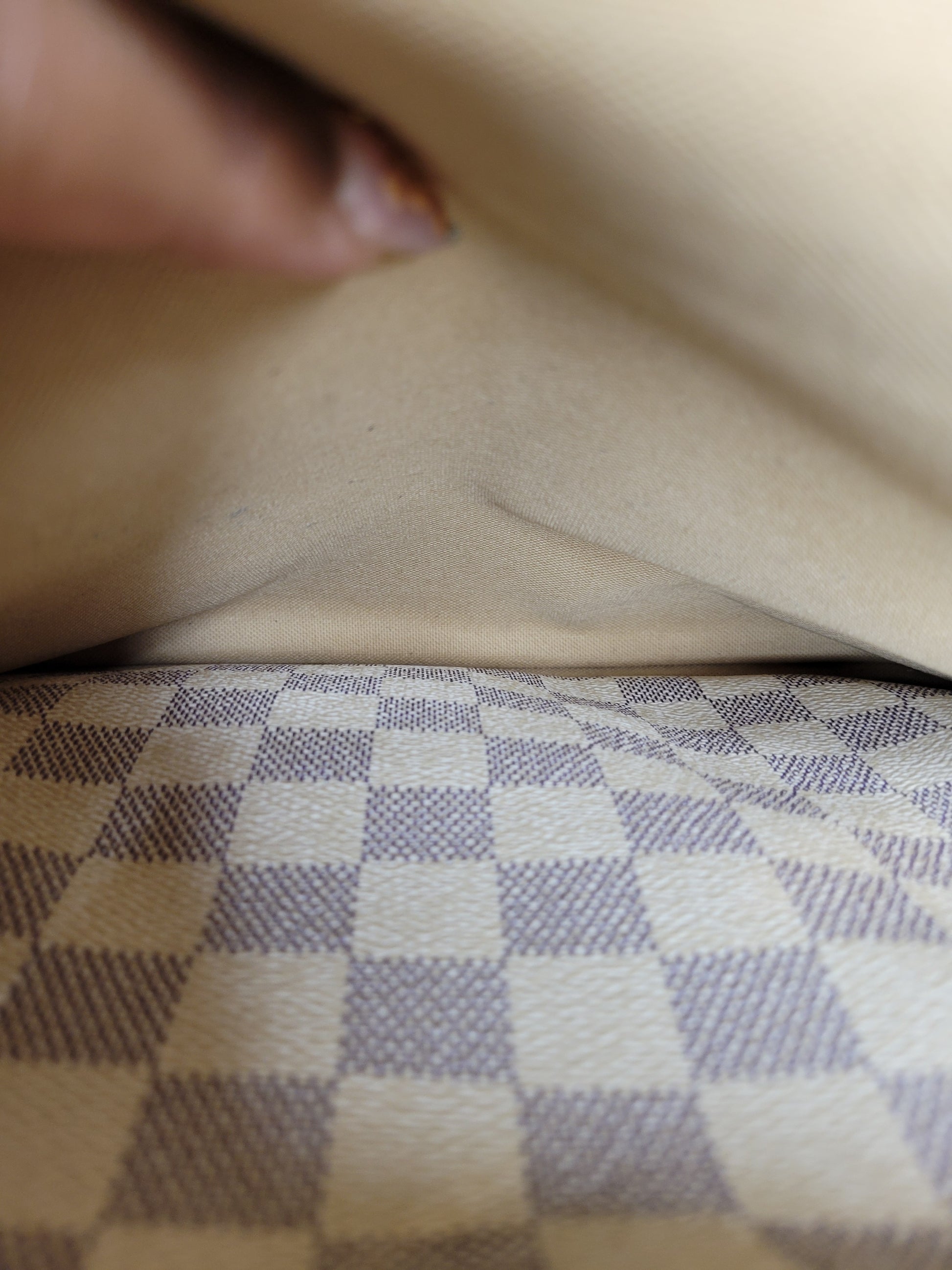 *Outside of the bag shows different signs of wear to Damier Azur pattern including rubbing on corners and edges, slight fading on some squares and yellowing of pattern on edges
