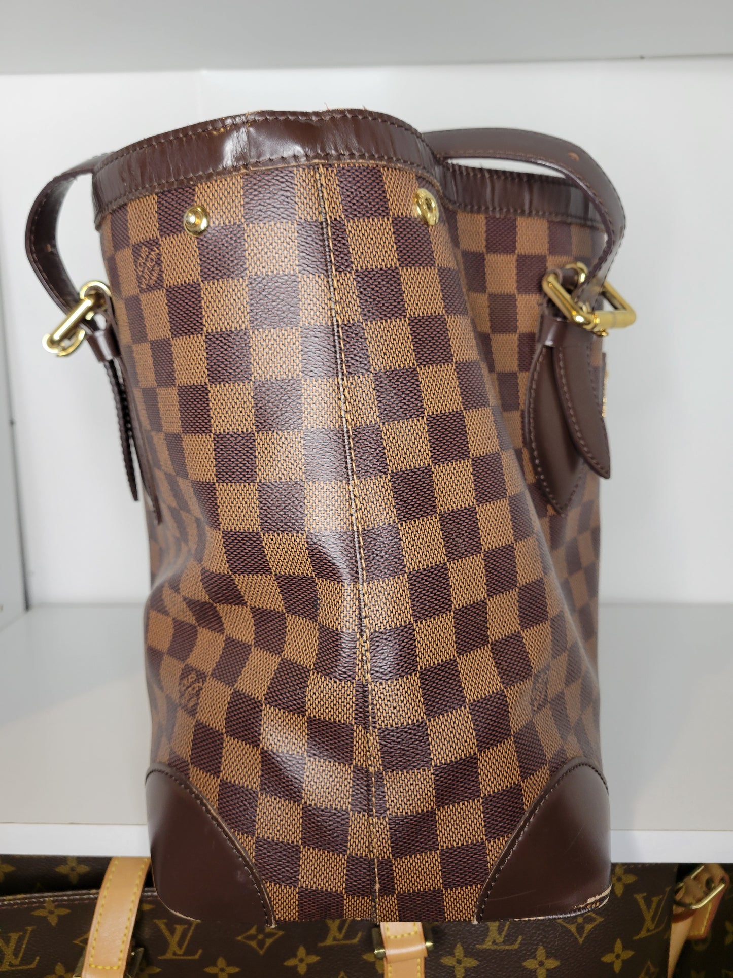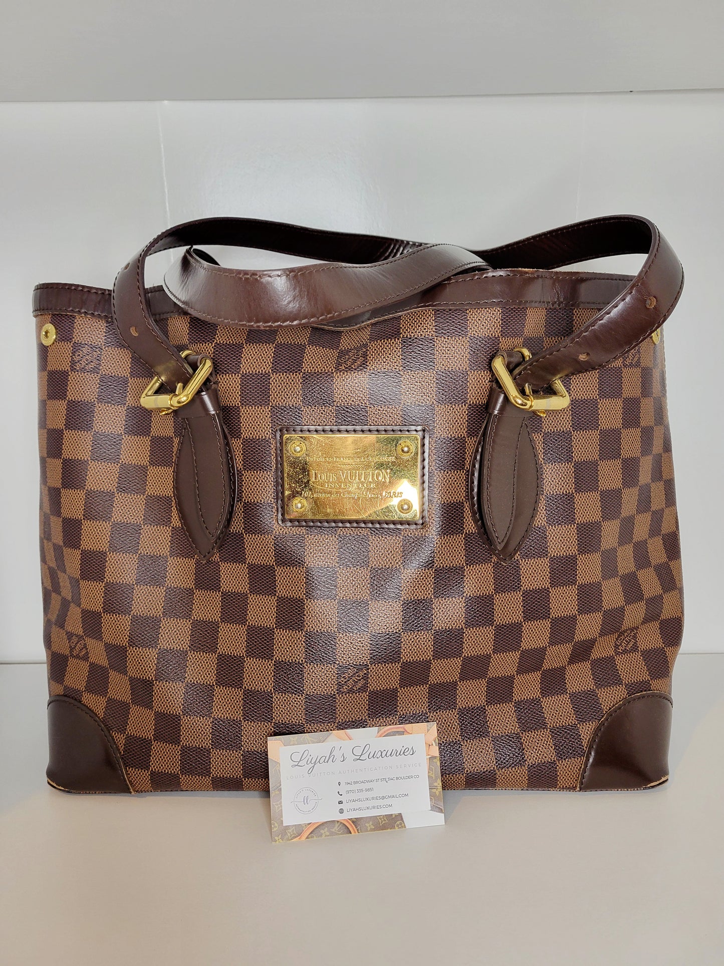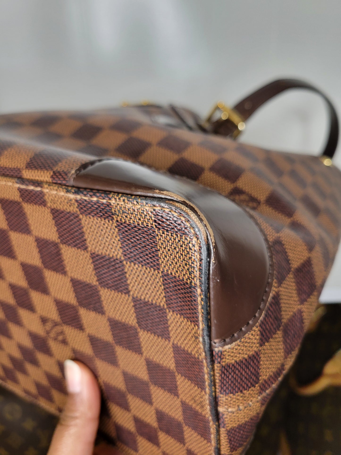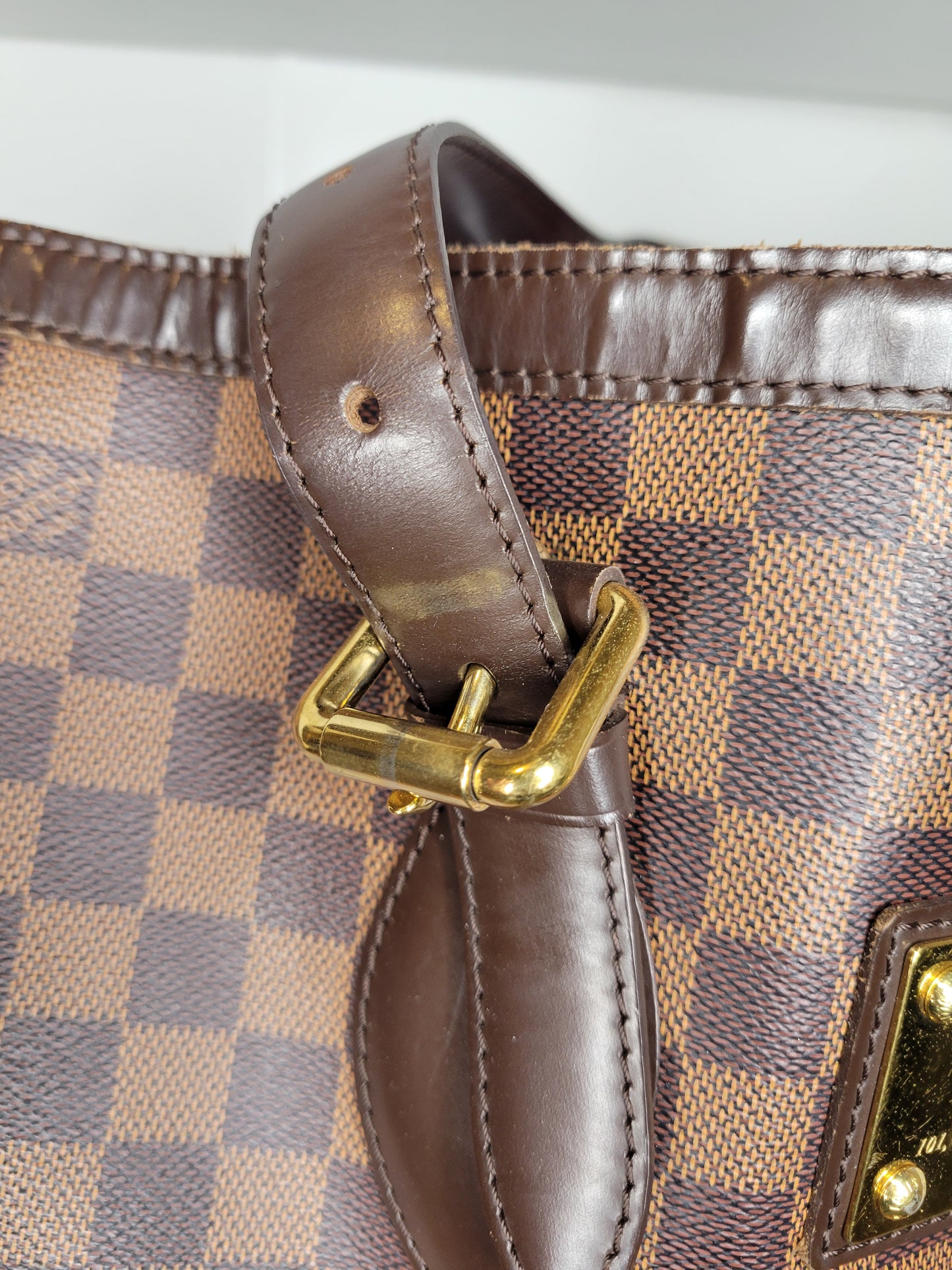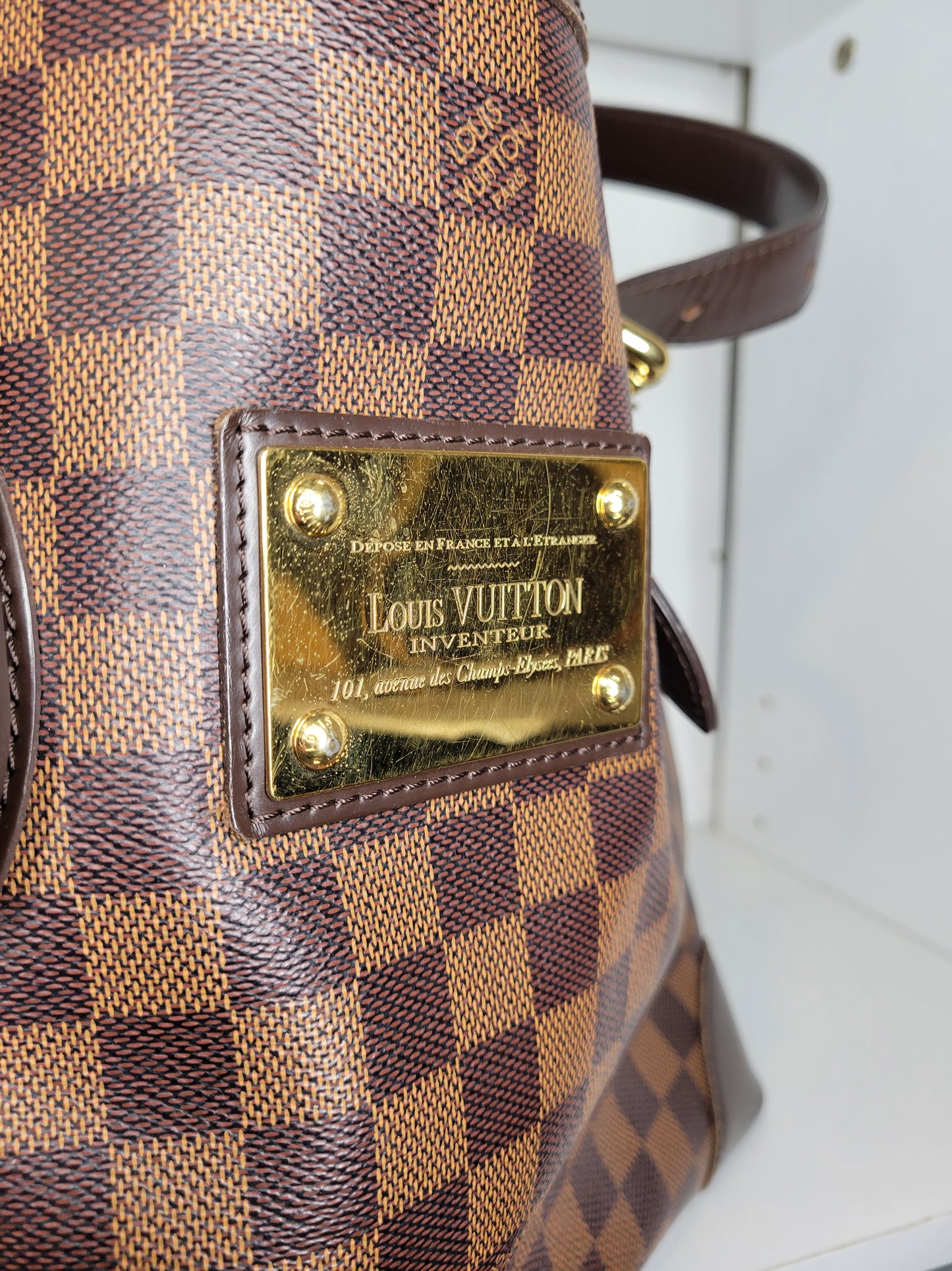 This Louis Vuitton Damier Canvas Hampstead MM Bag is the medium size of the Hampstead family and has fashion and functionality all rolled into one. With its expandable sides and roomy capacity, it is perfect for taking to the office or going shopping. It also features a golden "Louis Vuitton Inventeur" plaque on the front of the bag.