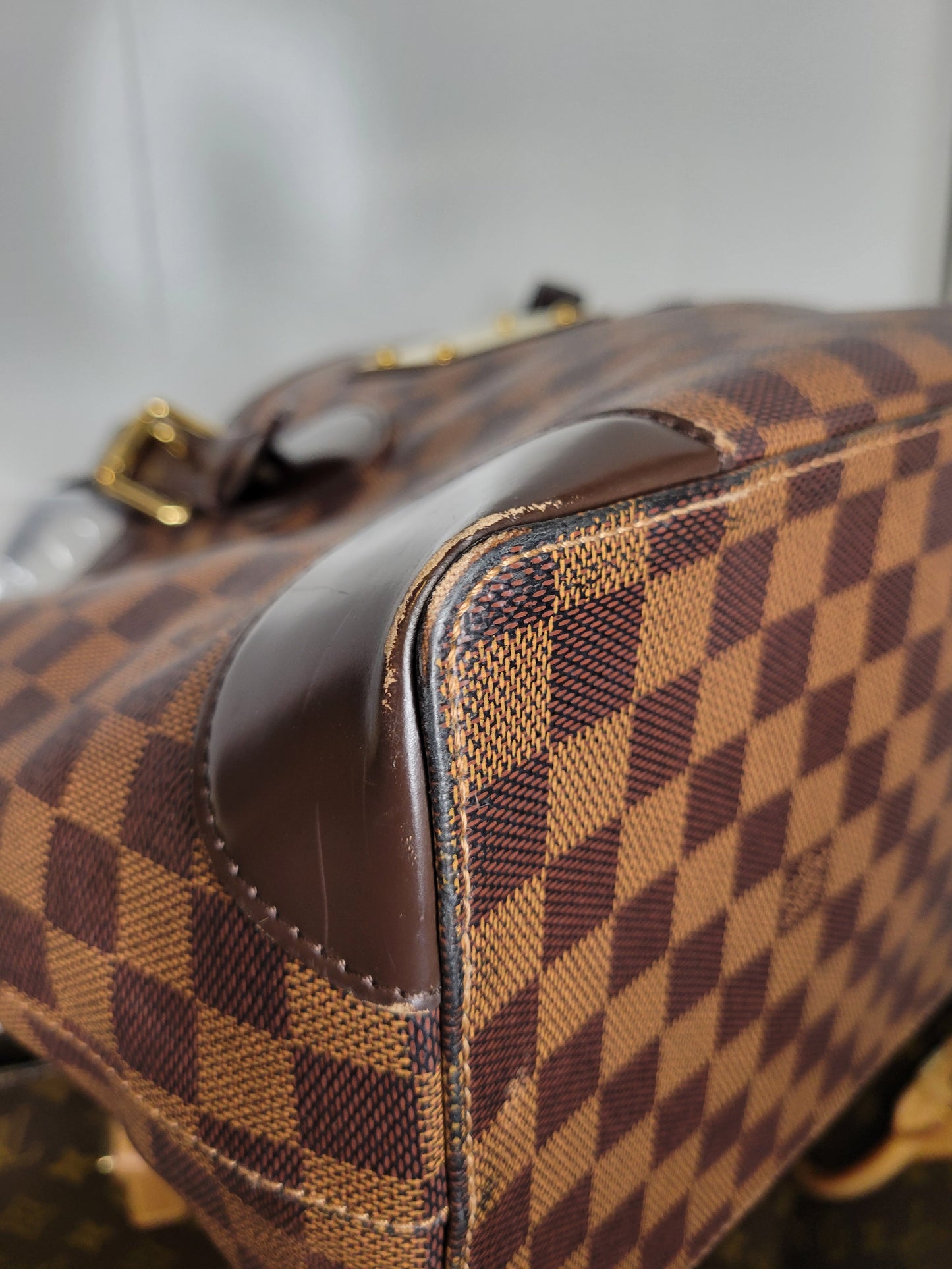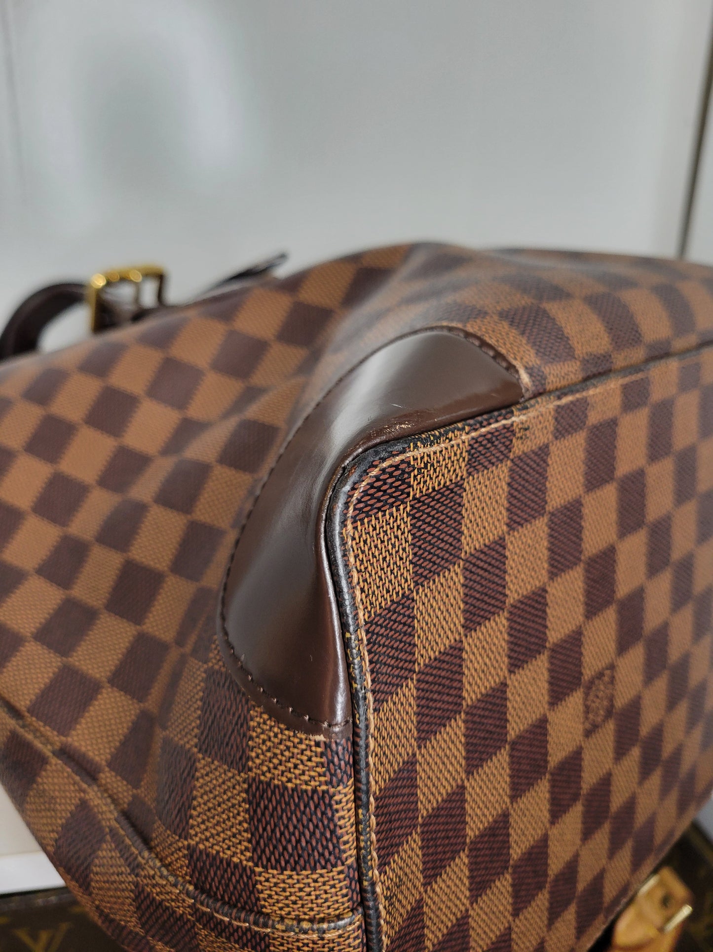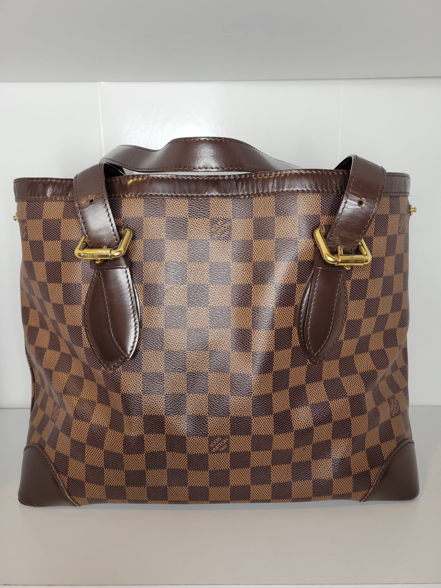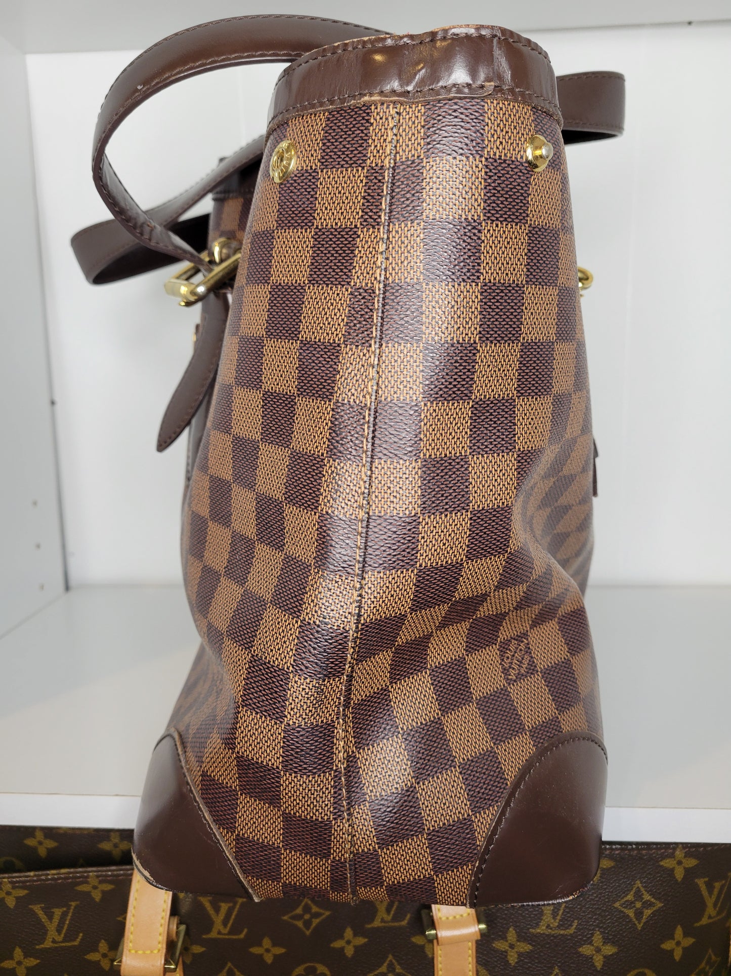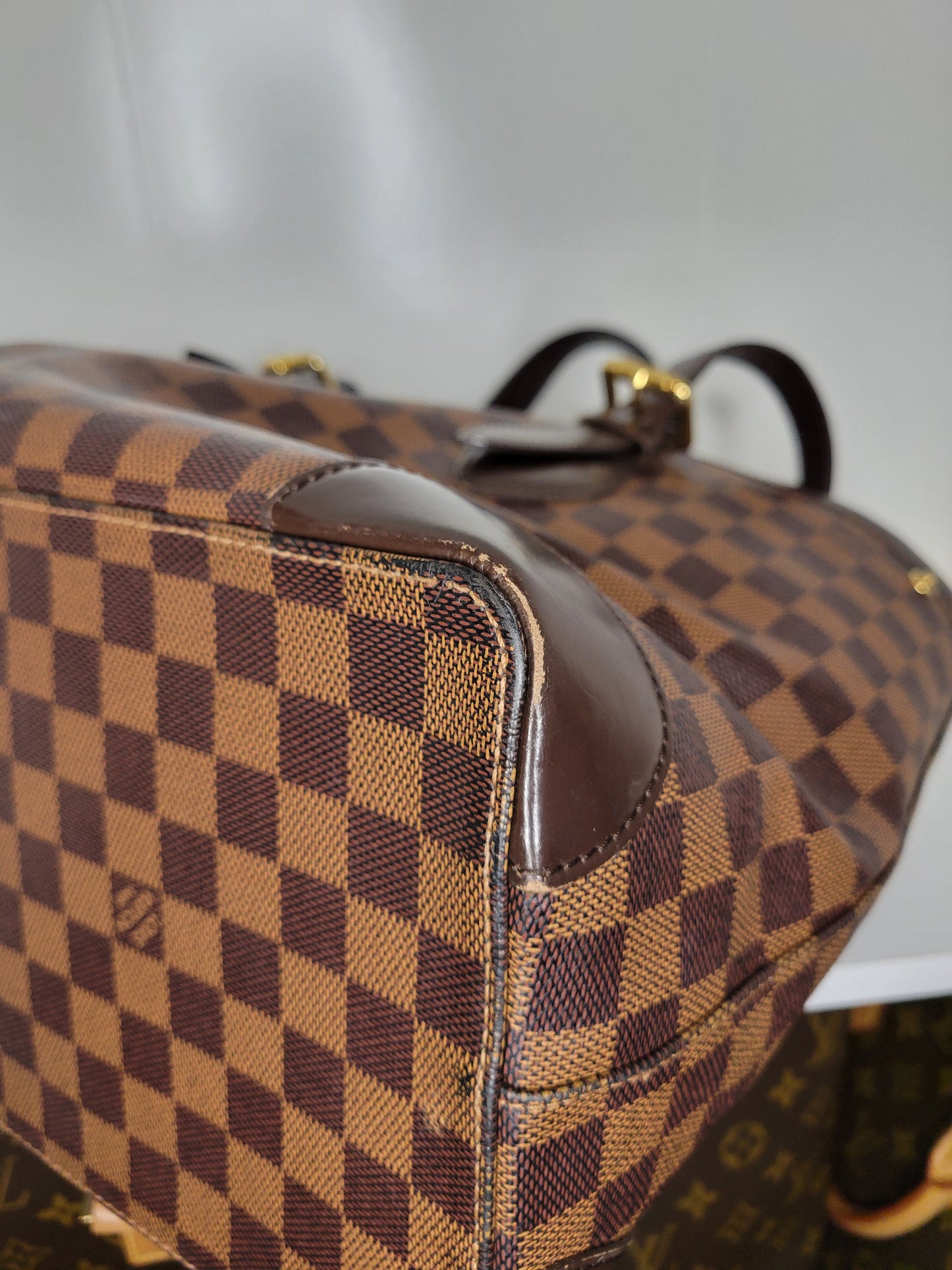 This Louis Vuitton Damier Canvas Hampstead MM Bag is the medium size of the Hampstead family and has fashion and functionality all rolled into one. With its expandable sides and roomy capacity, it is perfect for taking to the office or going shopping. It also features a golden "Louis Vuitton Inventeur" plaque on the front of the bag.