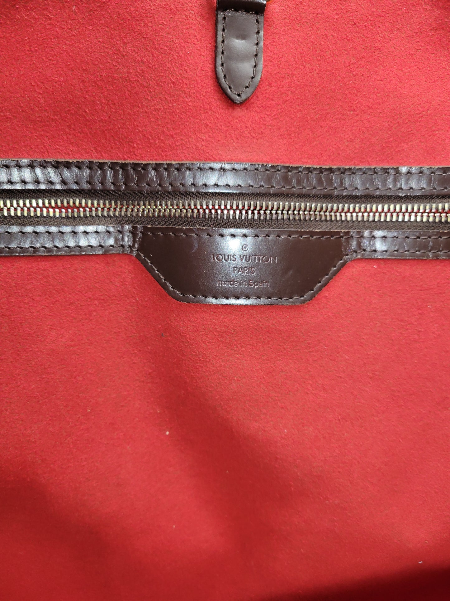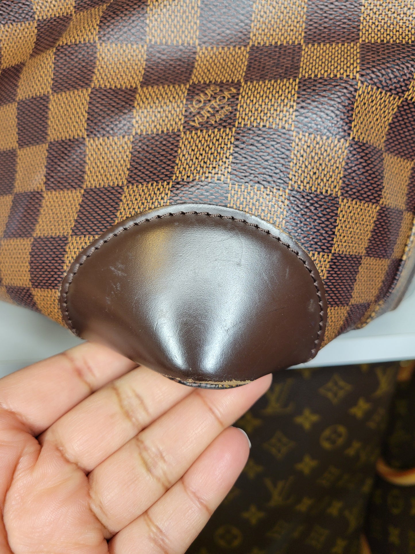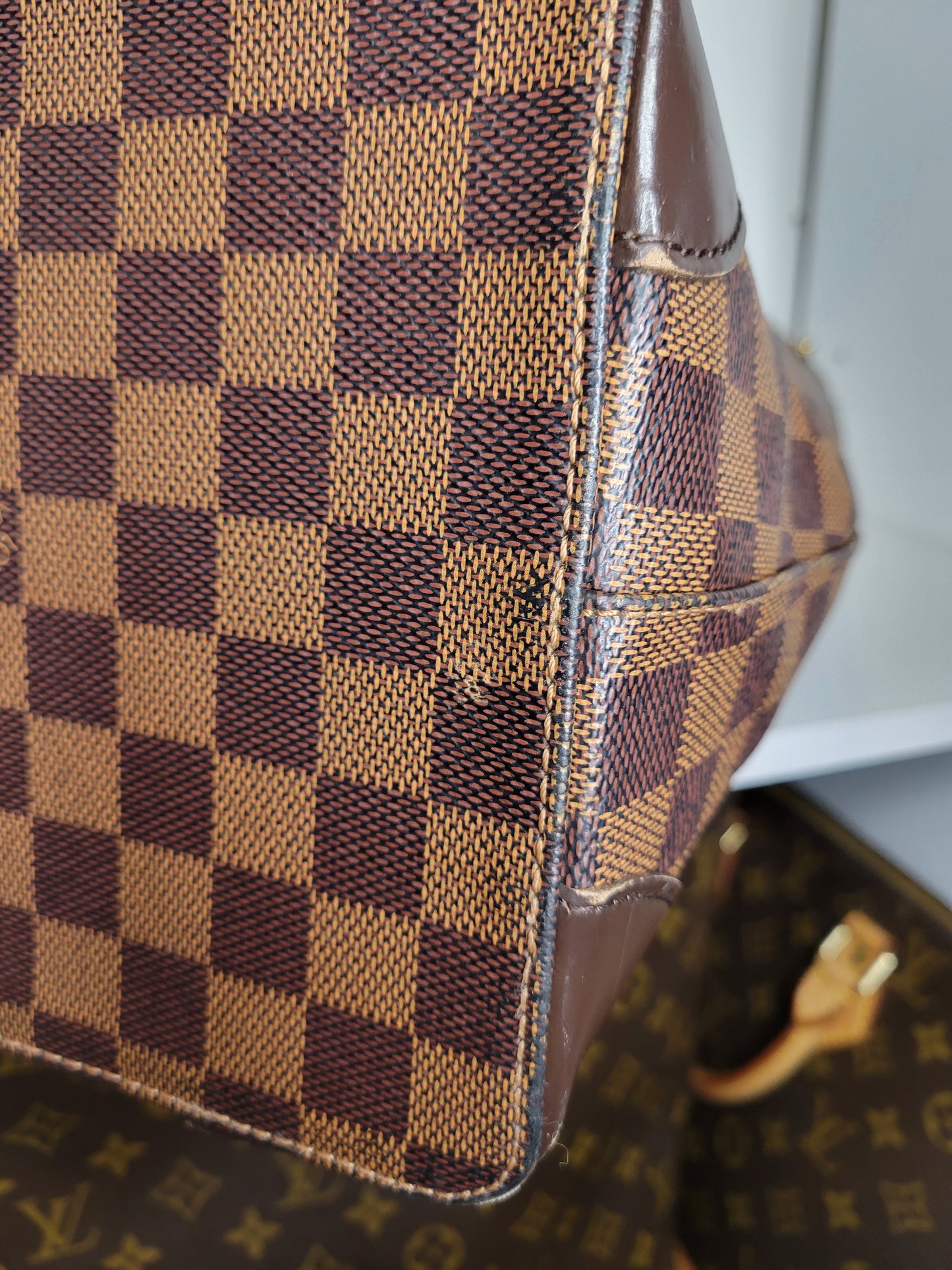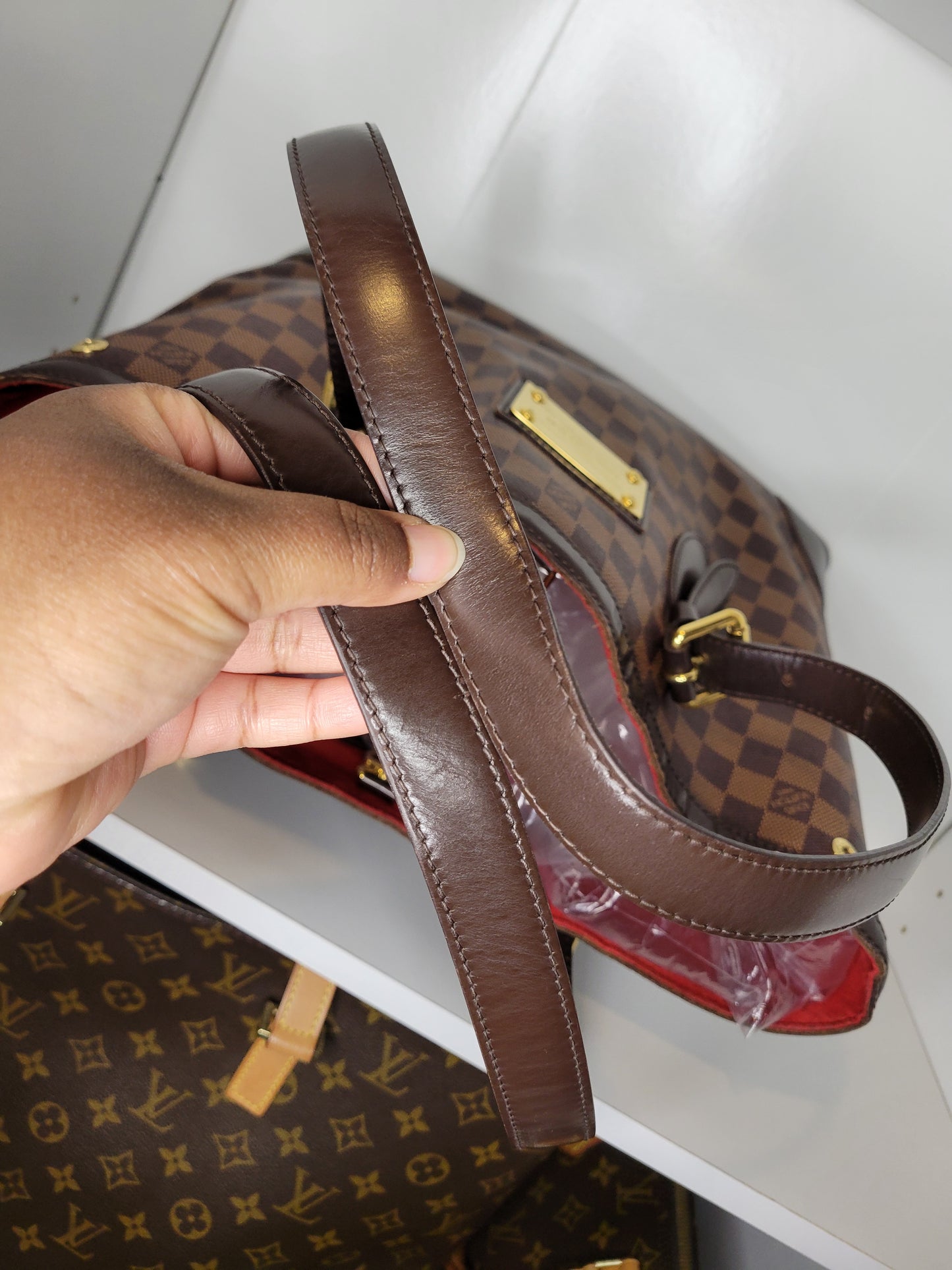 This Louis Vuitton Damier Canvas Hampstead MM Bag is the medium size of the Hampstead family and has fashion and functionality all rolled into one. With its expandable sides and roomy capacity, it is perfect for taking to the office or going shopping. It also features a golden "Louis Vuitton Inventeur" plaque on the front of the bag.
