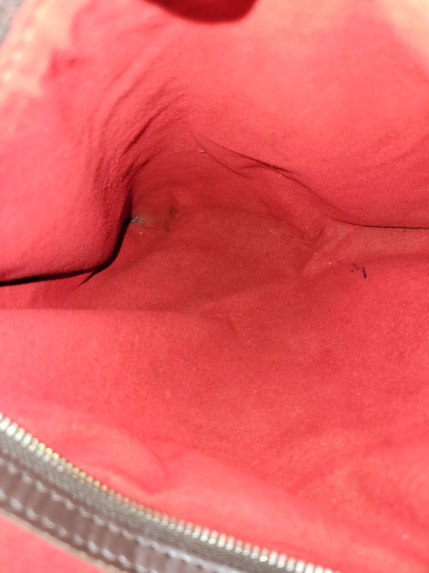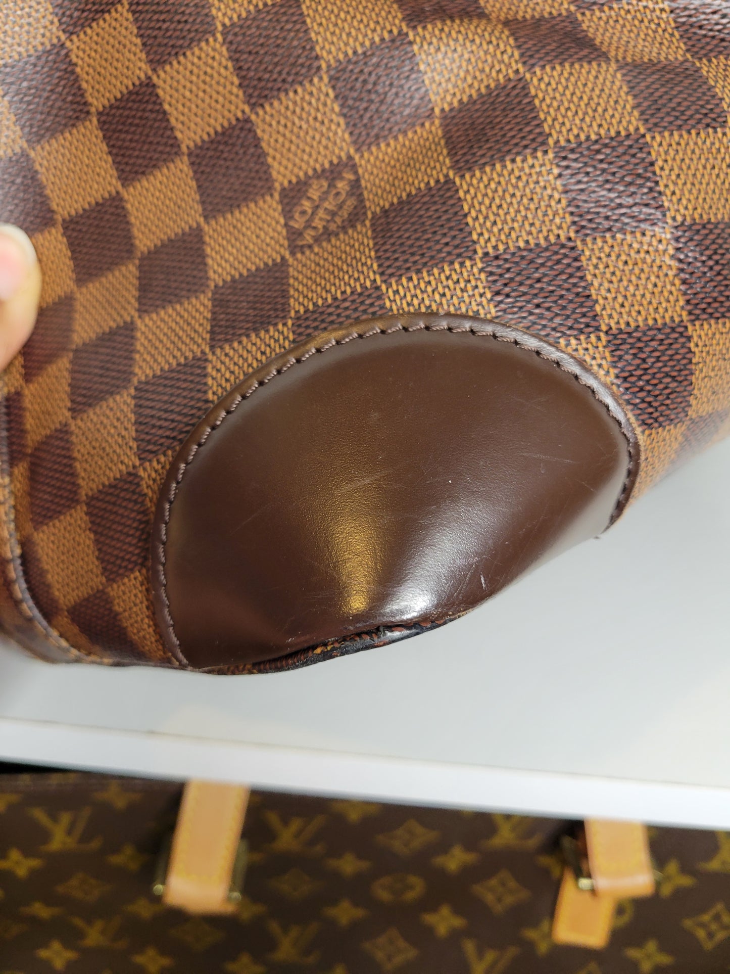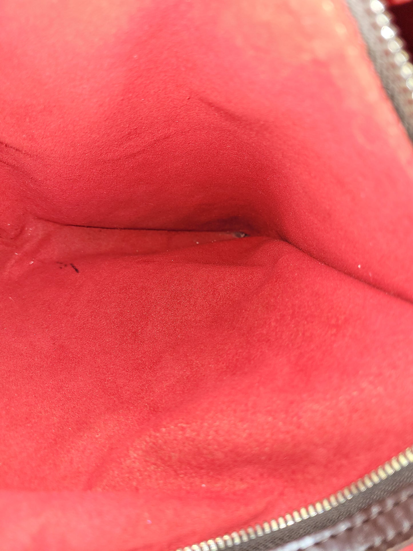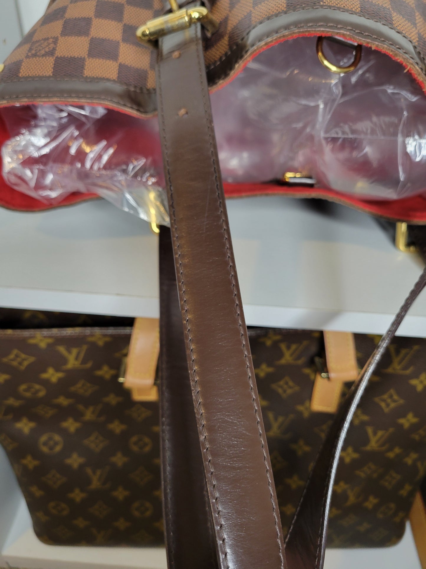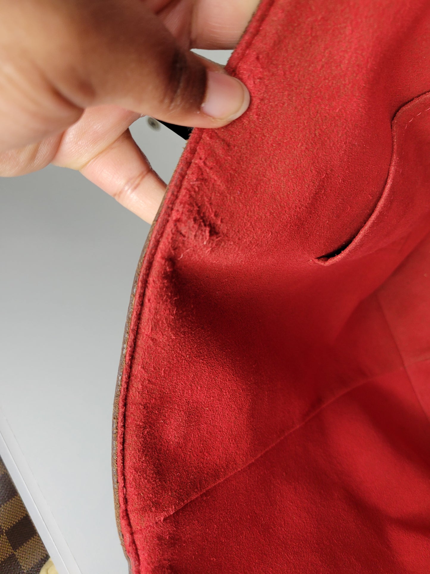 This Louis Vuitton Damier Canvas Hampstead MM Bag is the medium size of the Hampstead family and has fashion and functionality all rolled into one. With its expandable sides and roomy capacity, it is perfect for taking to the office or going shopping. It also features a golden "Louis Vuitton Inventeur" plaque on the front of the bag.