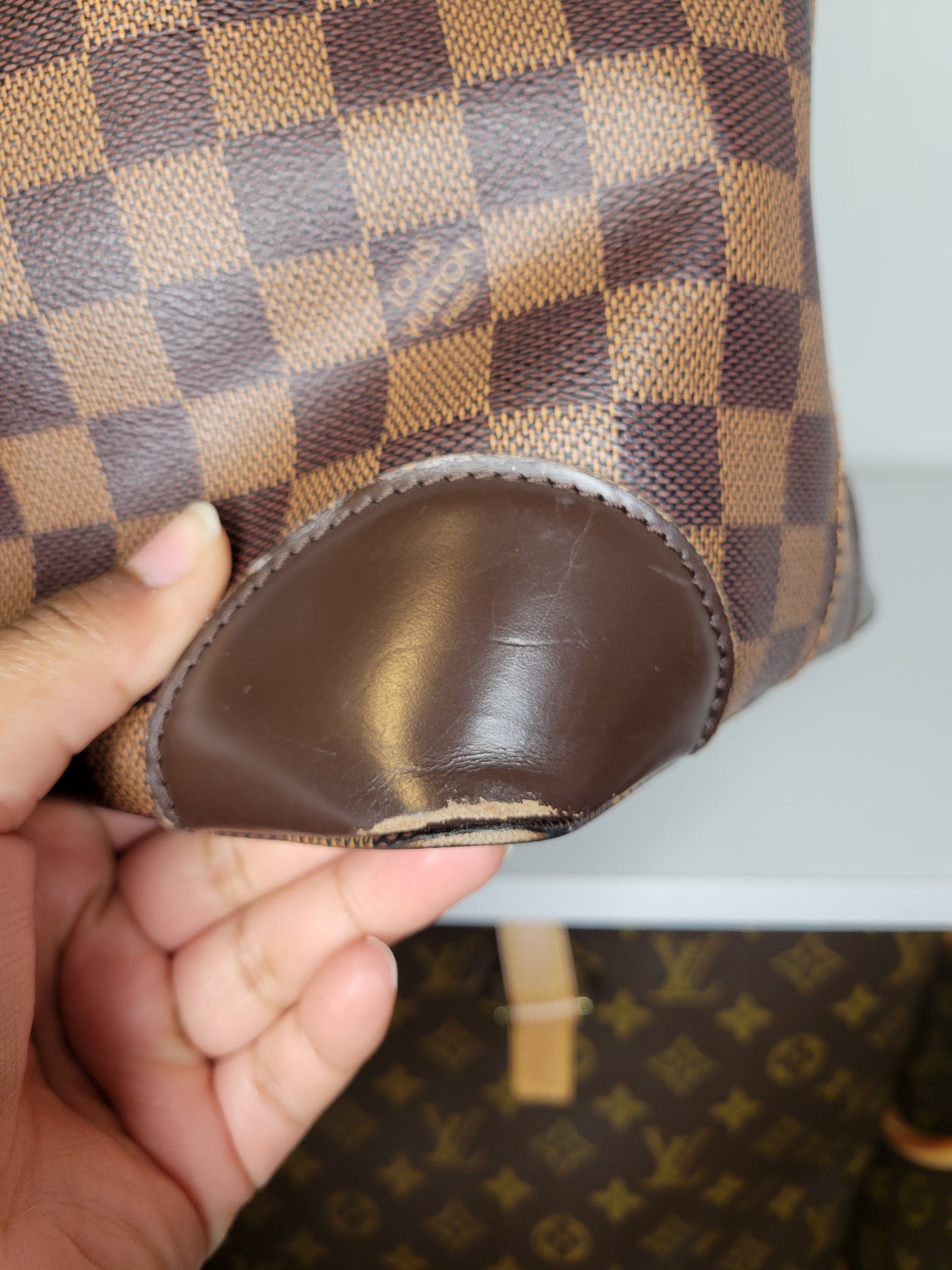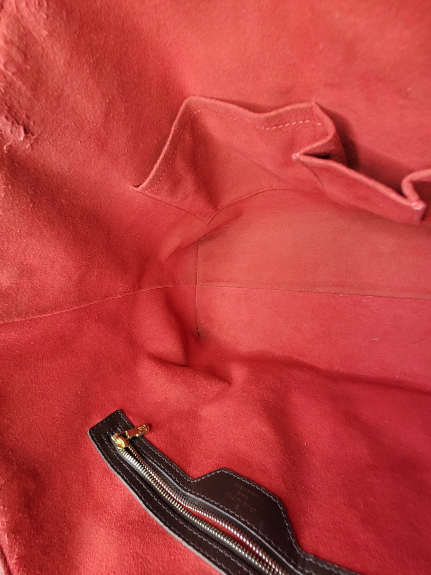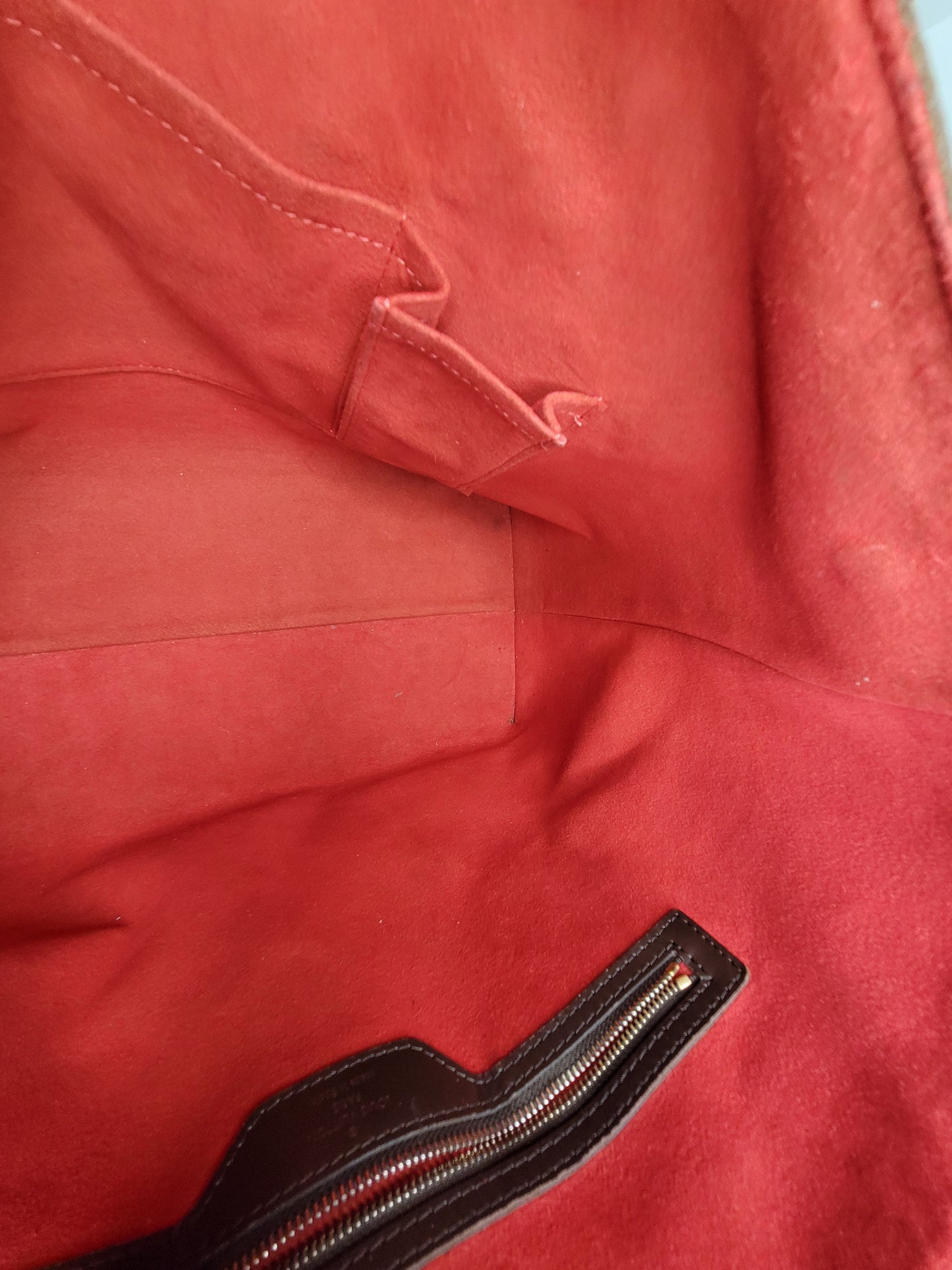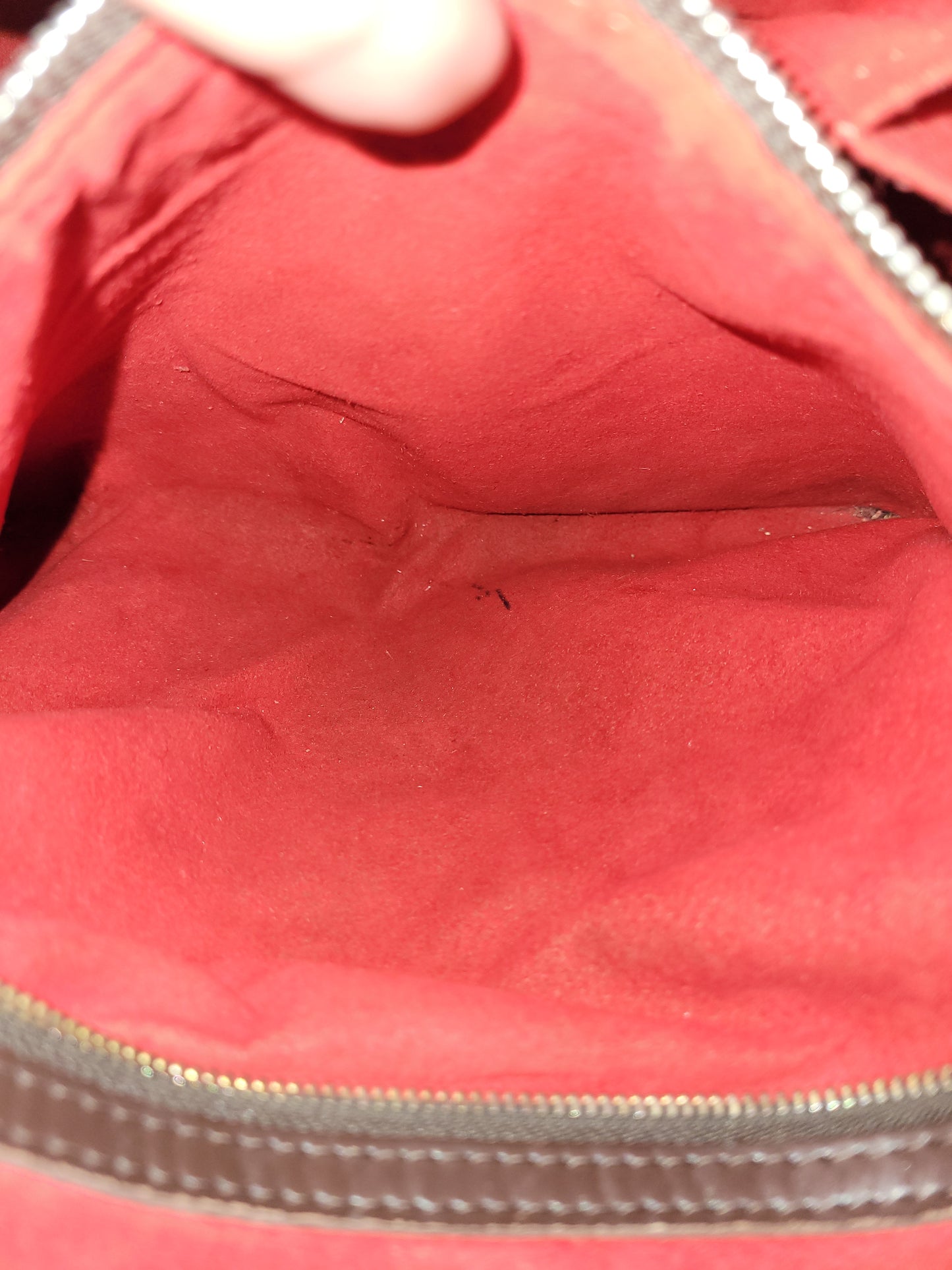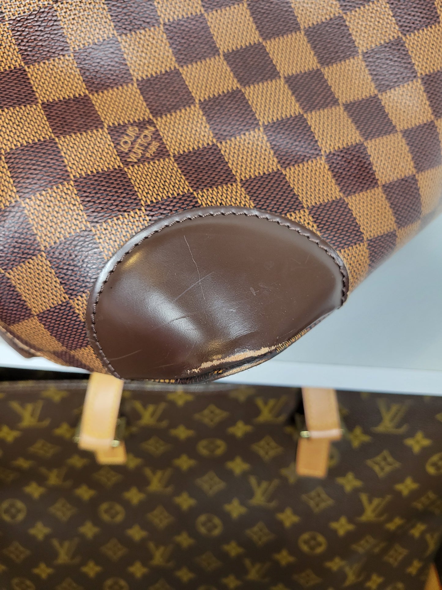 This Louis Vuitton Damier Canvas Hampstead MM Bag is the medium size of the Hampstead family and has fashion and functionality all rolled into one. With its expandable sides and roomy capacity, it is perfect for taking to the office or going shopping. It also features a golden "Louis Vuitton Inventeur" plaque on the front of the bag.