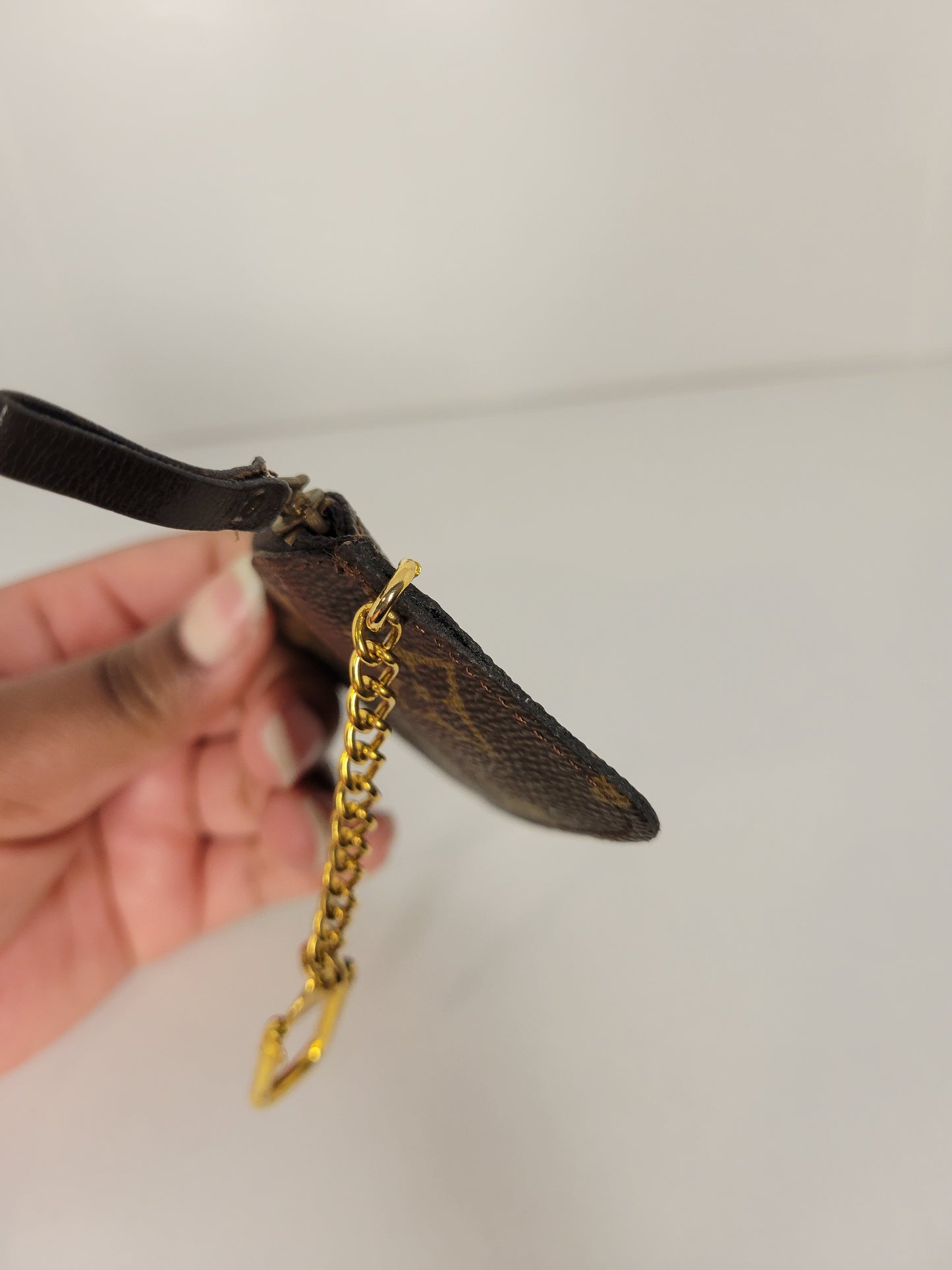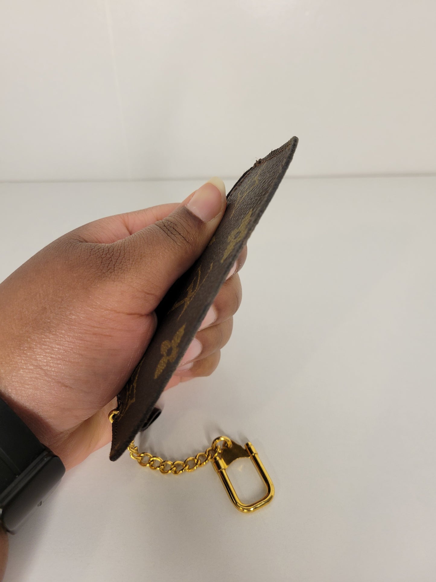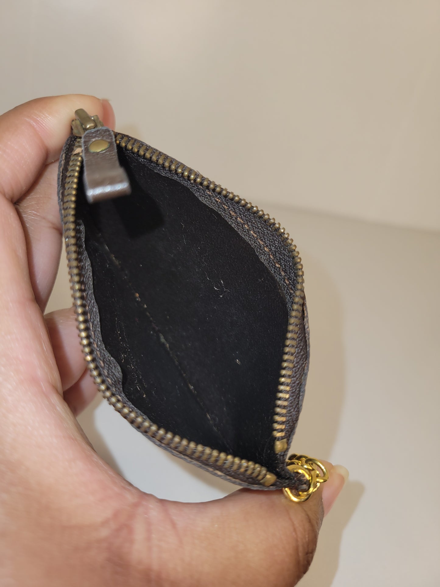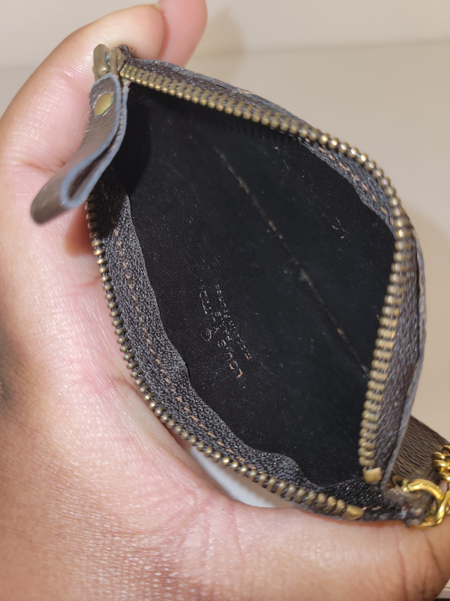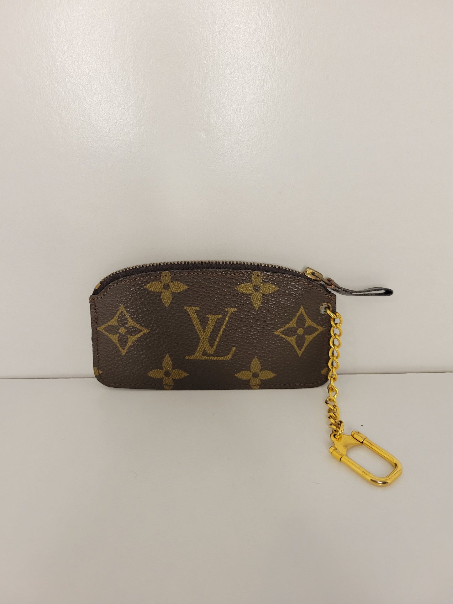 This key pouch is a must have in your LV collection! This model is smaller than the modern key pouch. It can hold coins, chapstick and similar small items. It CANNOT fit cards inside. The chain can be used for keys, to attach in another LV bag, or even on a belt.