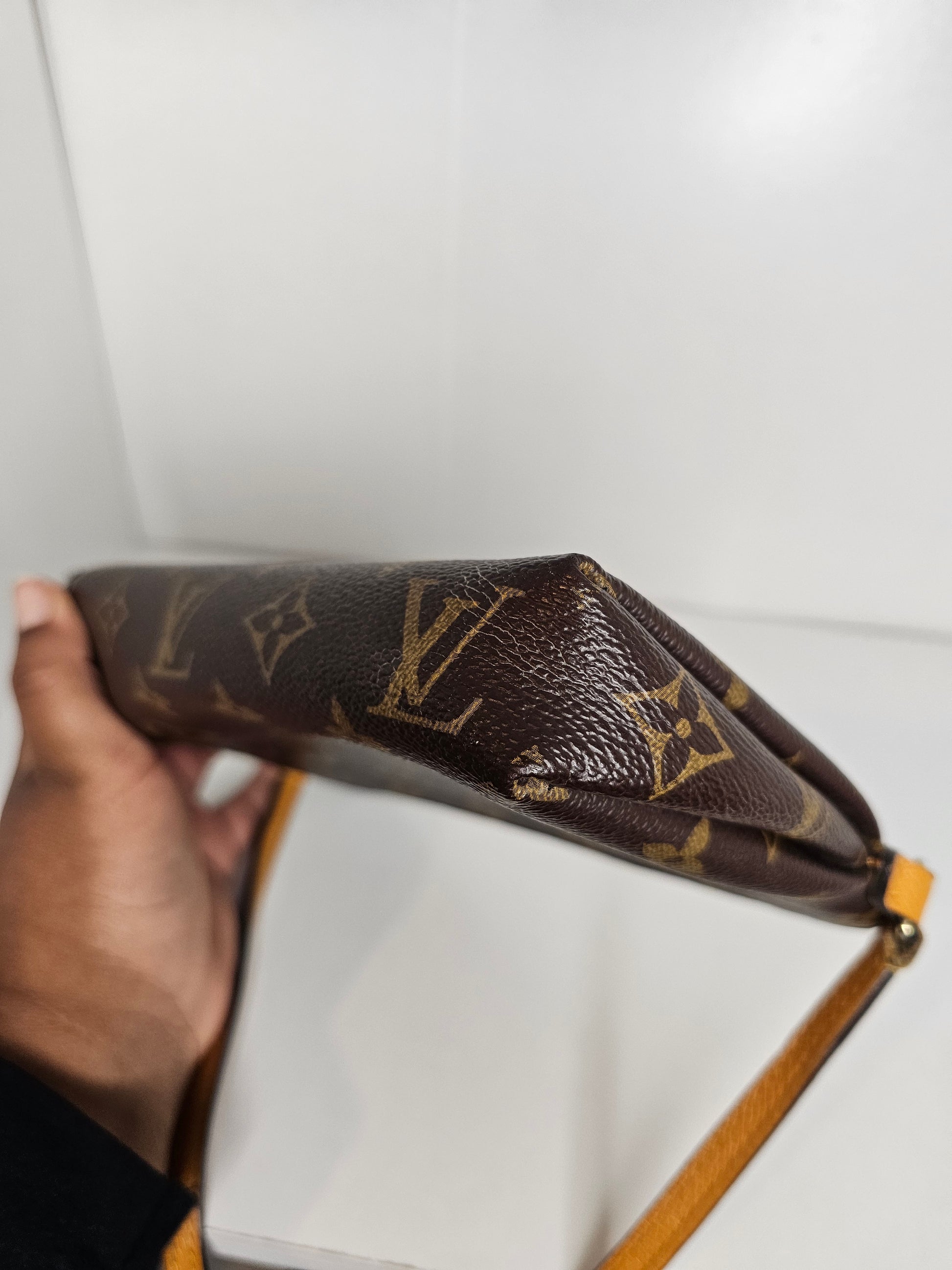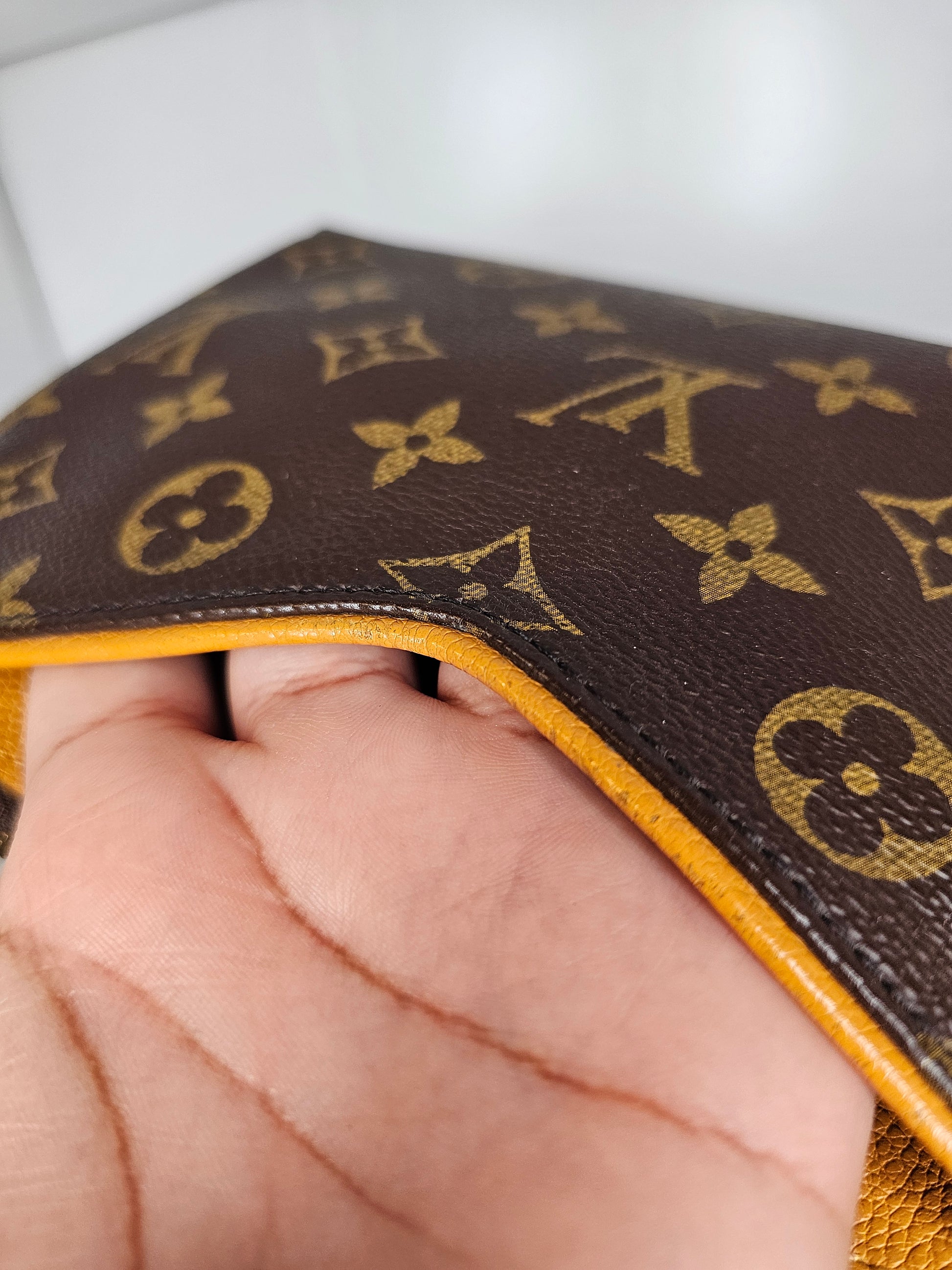 *Outside of bag shows multiple signs of wear to canvas, including small patch of canvas bottom corner is missing / has been repaired, little crack on center of bag where front pocket flexes, Monogram pattern on backside shows wear
