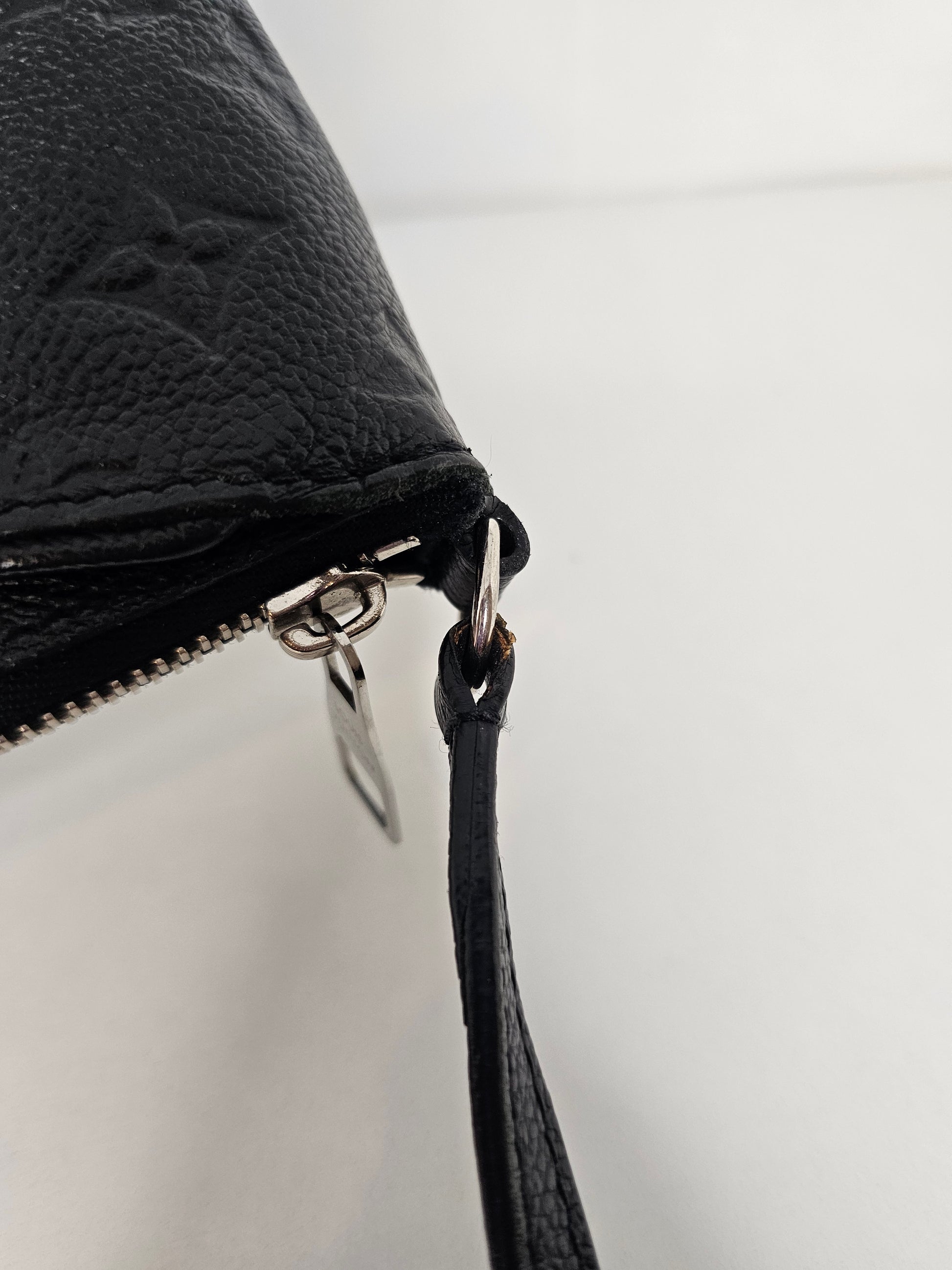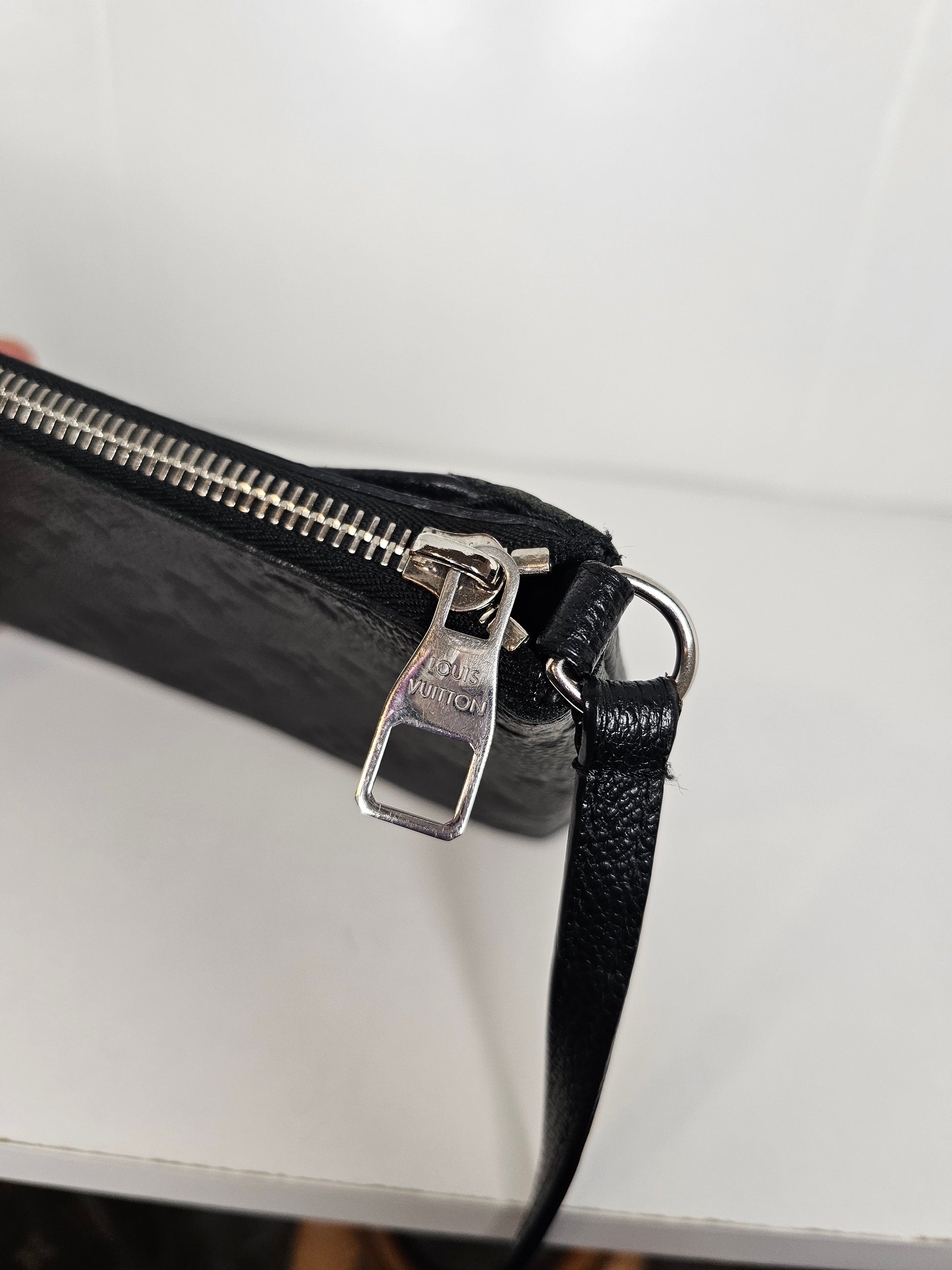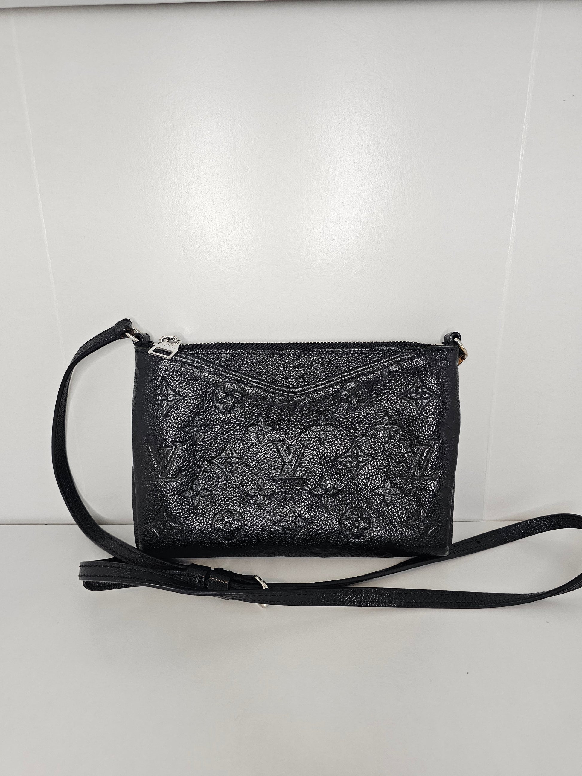(THIS IS THE LV EMPLOYEE VERSION OF THE PALLAS BAG) This chic shoulder / crossbody bag is crafted of Louis Vuitton monogram embossed leather in black. This bag features an adjustable black strap with silver hardware and a front pocket. The top zipper opens to a black fabric interior with a patch pocket.