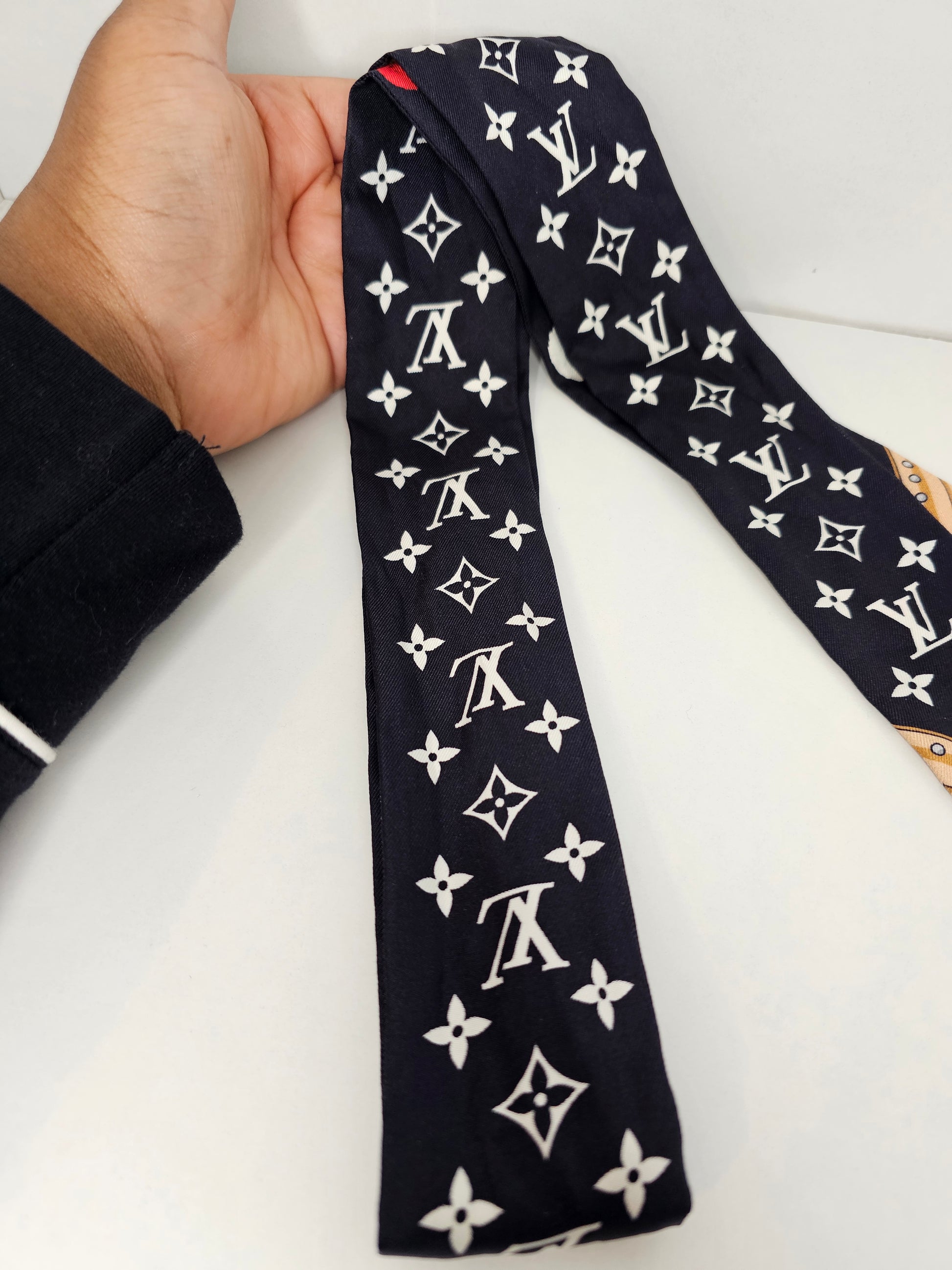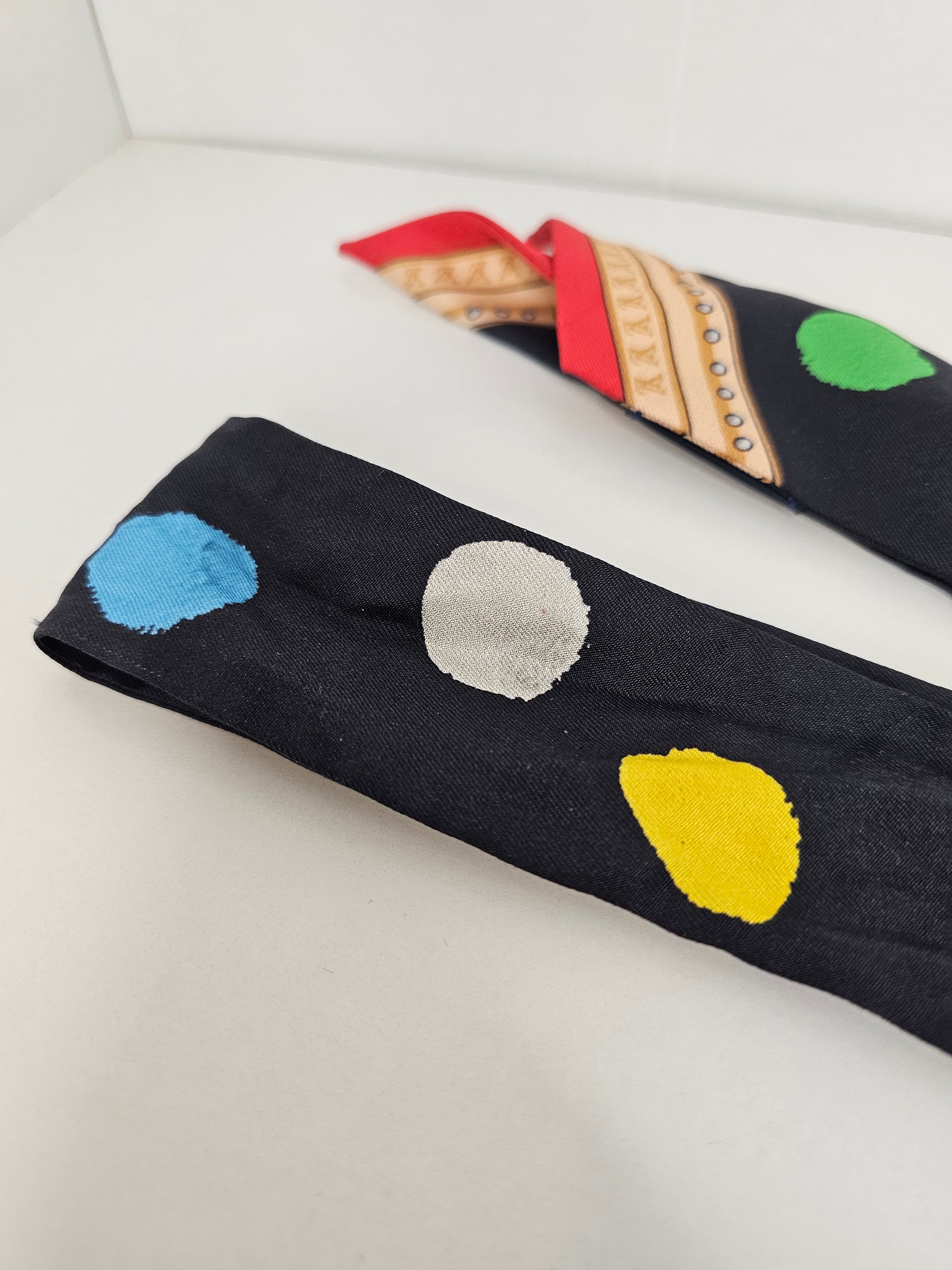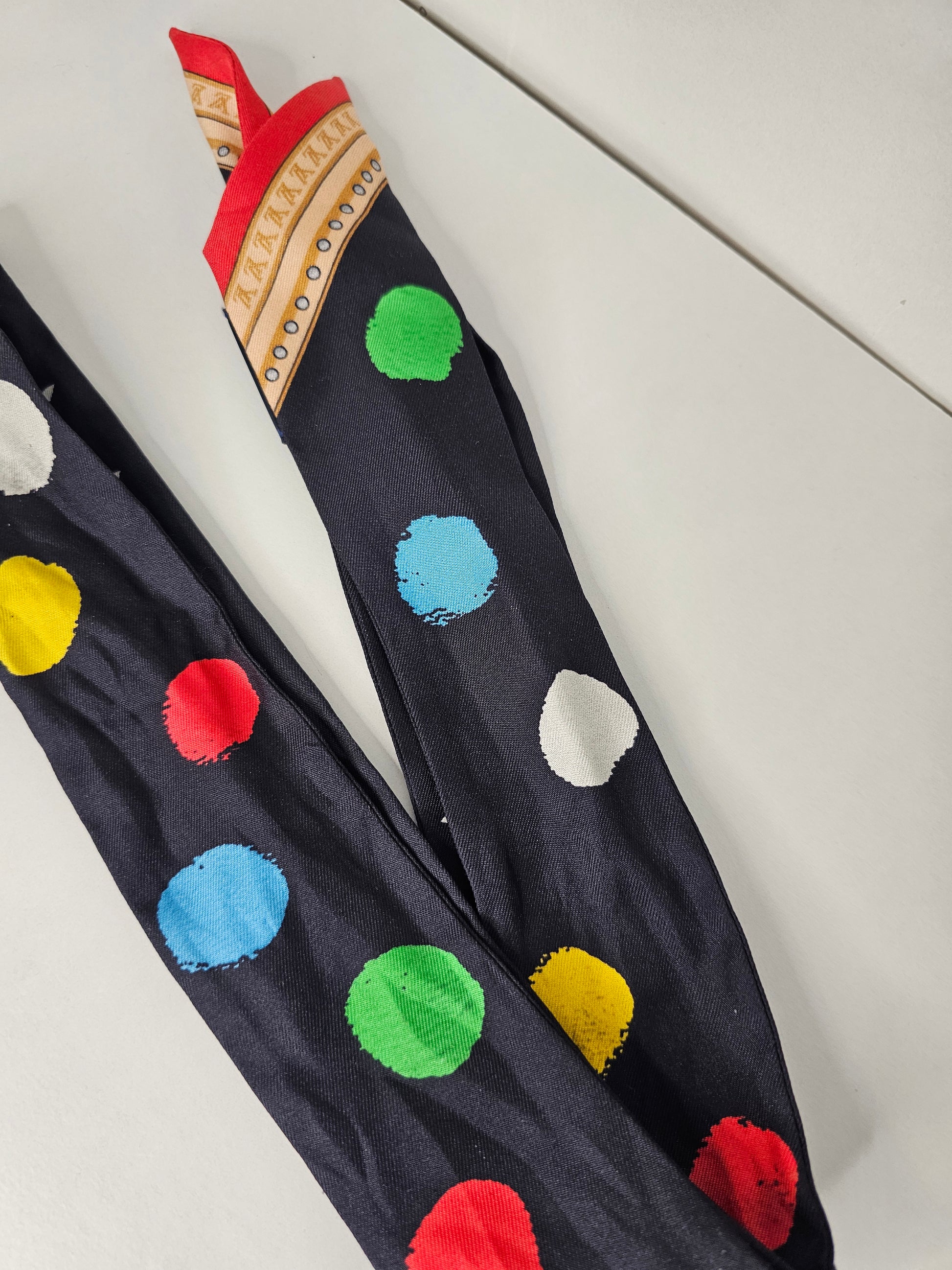 This beautiful silk bandeau wrap is perfect for accessorizing, such as decorating bags, tying on your head or neck! It featuring painted dots and monogram print in 100% silk.